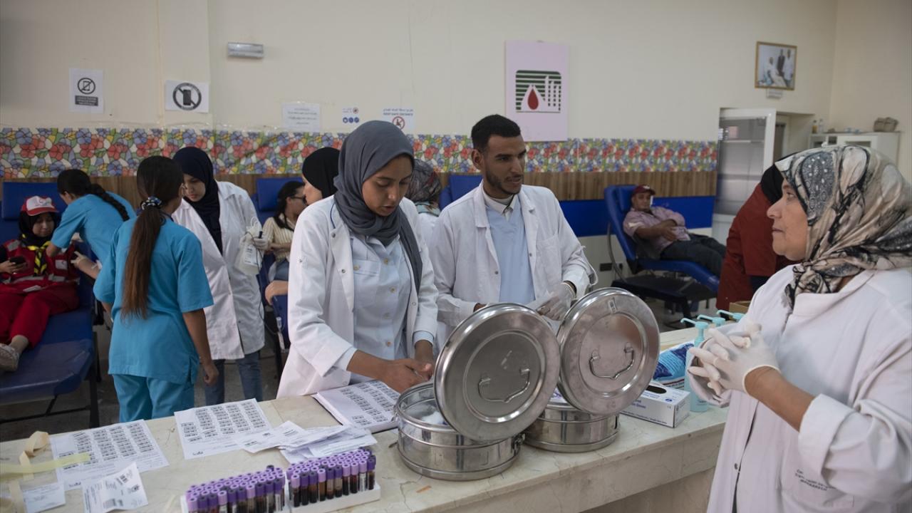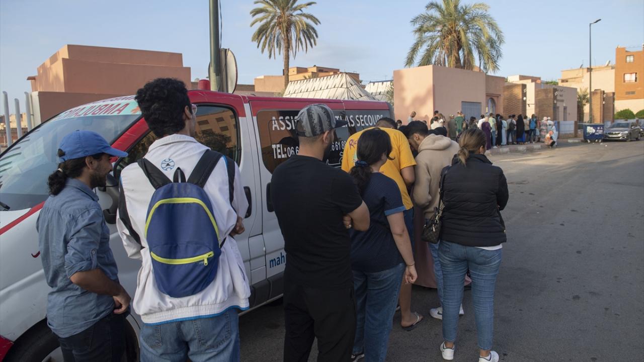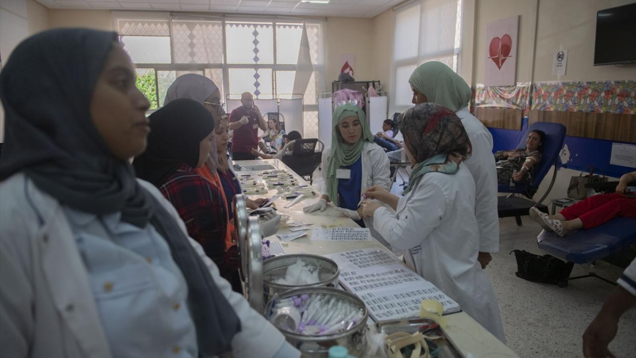 Kan vermek için Marakeş Kan Merkezi`ne gelen kişilere, gönüllü sağlık memurları yardımcı oldu.