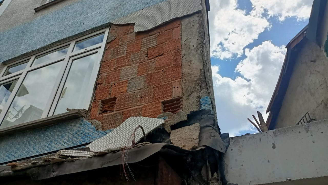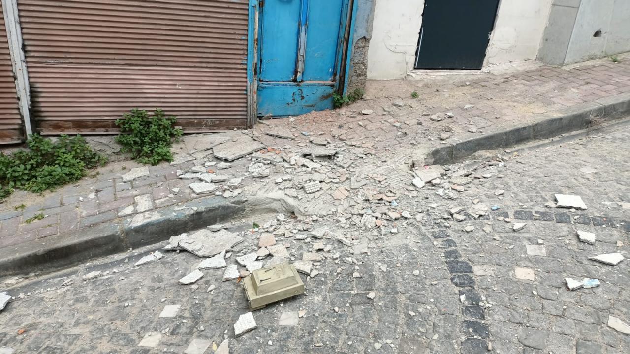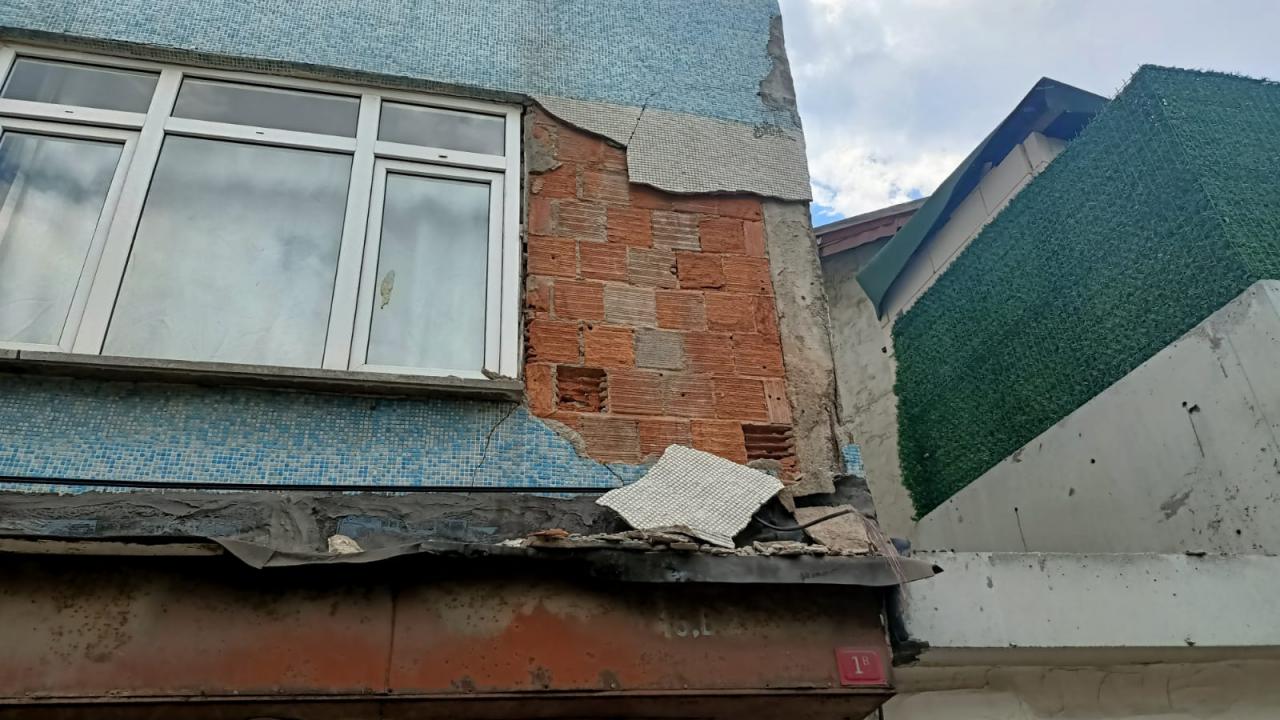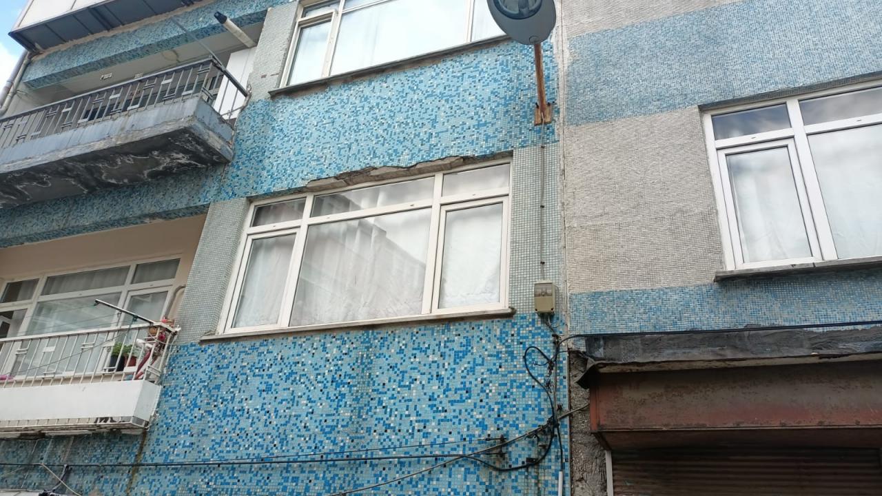 Dış cephesindeki sıvaların da döküldüğü binada oturanlar tahliye edildi.