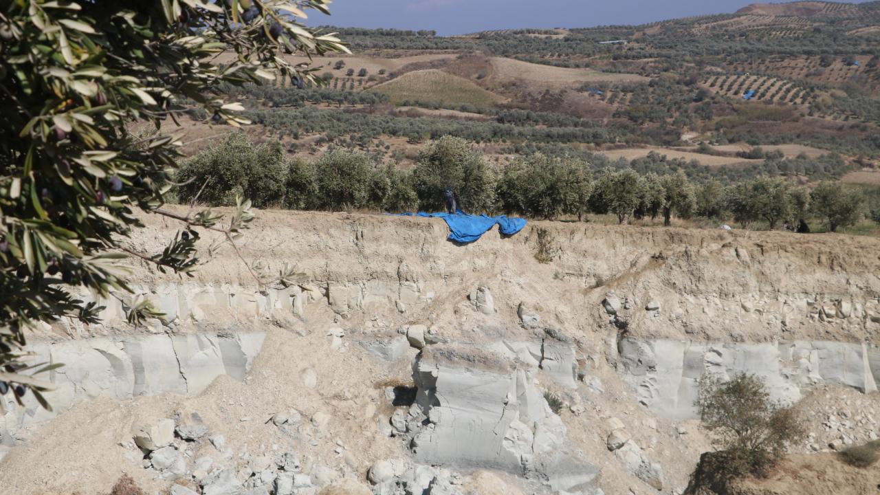 Depremin 9. ayında depremzede çiftçiler, fay hattının ikiye ayırdığı tarlada zeytin hasadına başladı.