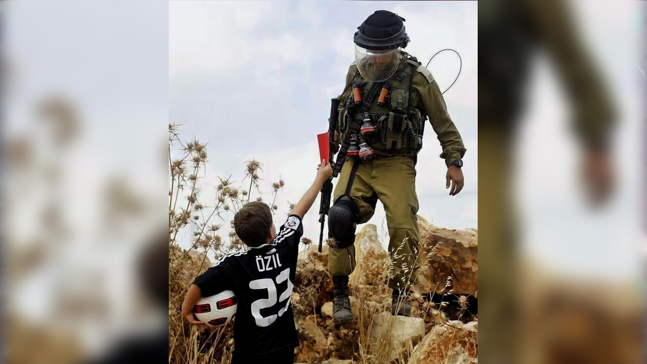 Sosyal medyadan Mesut Özil forması giymiş küçük bir çocuğun İsrail askerine kırmızı kart gösterdiği görseli paylaşan taraftarlar, İsrail`in Filistin`e yaptığı saldırılara tepki gösterdi.