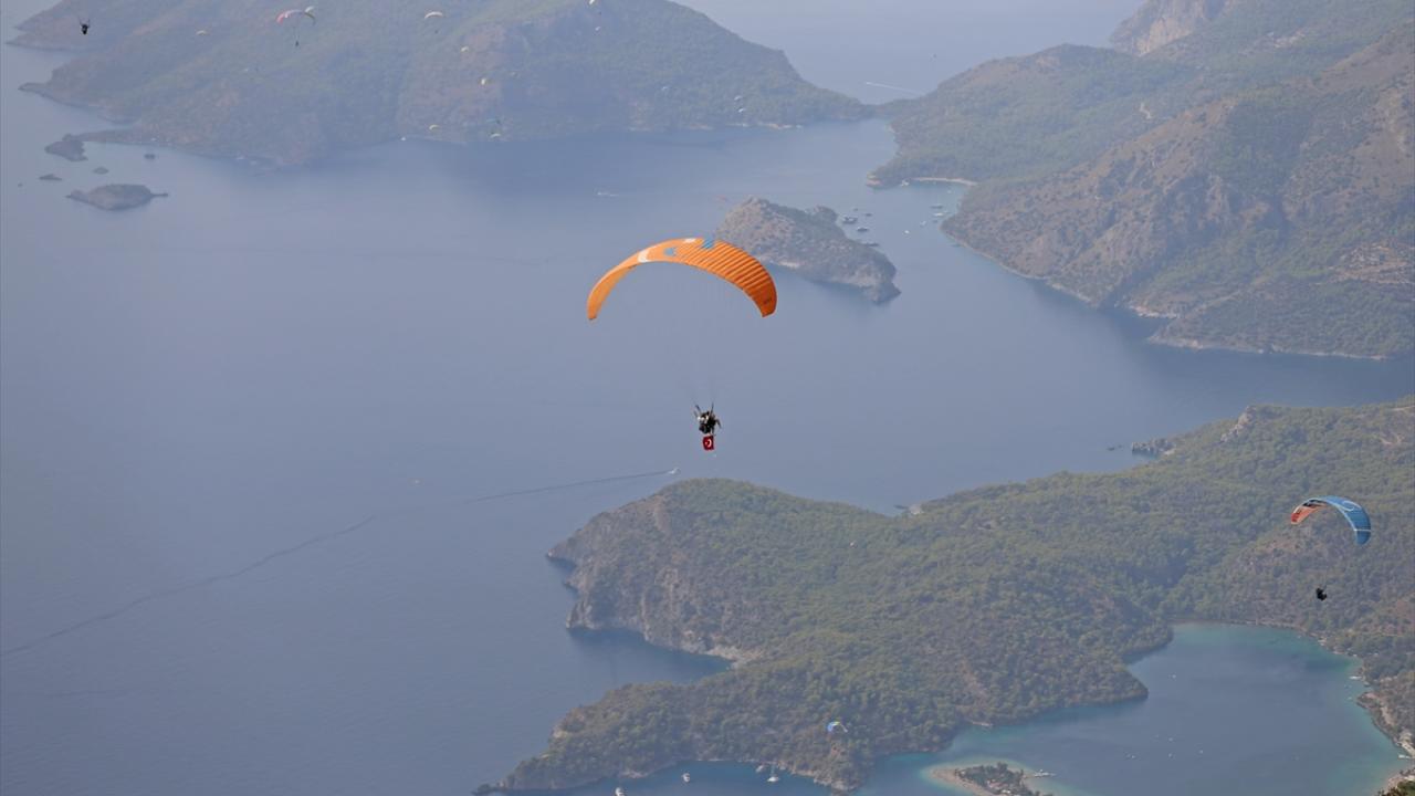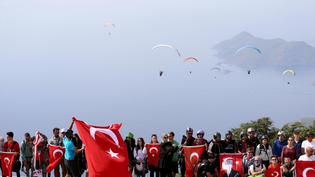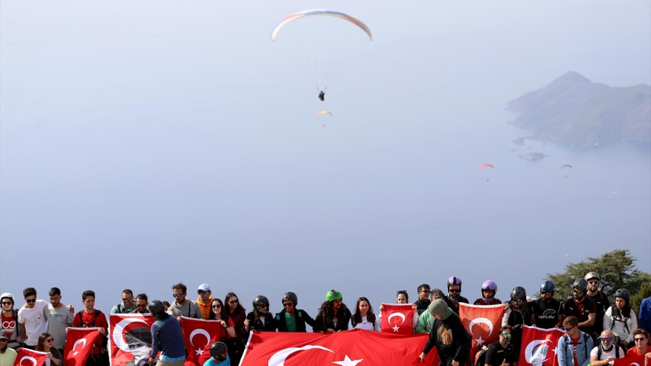Muğla'nın Fethiye ilçesinde Cumhuriyet'in 100'üncü yıl dönümü etkinlikleri kapsamında, 100 üniversite öğrencisi Türk bayraklarıyla yamaç paraşütü uçuşu gerçekleştirdi.