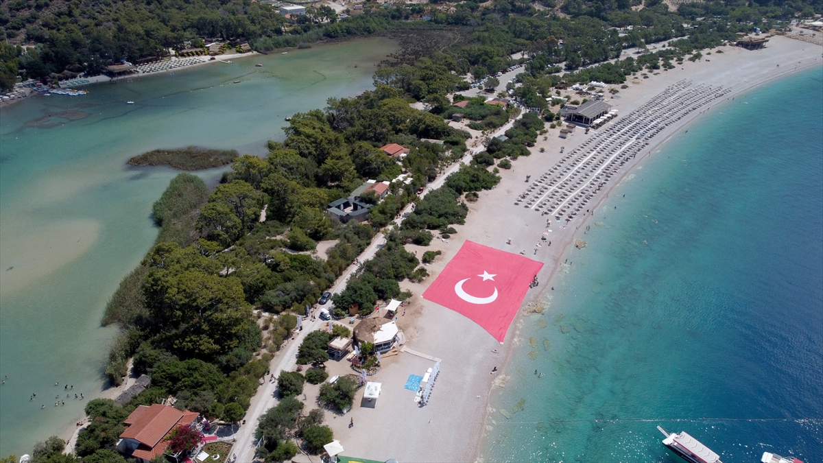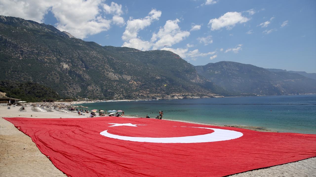 Kumburnu Plajı`nda 1000 metrekarelik Türk bayrağının açıldığı etkinlikte, Dragon Yamaç Paraşütü firması pilotları, gökyüzünde Çevre, Şehircilik ve İklim Değişikliği Bakanlığının bayrağını açtı.