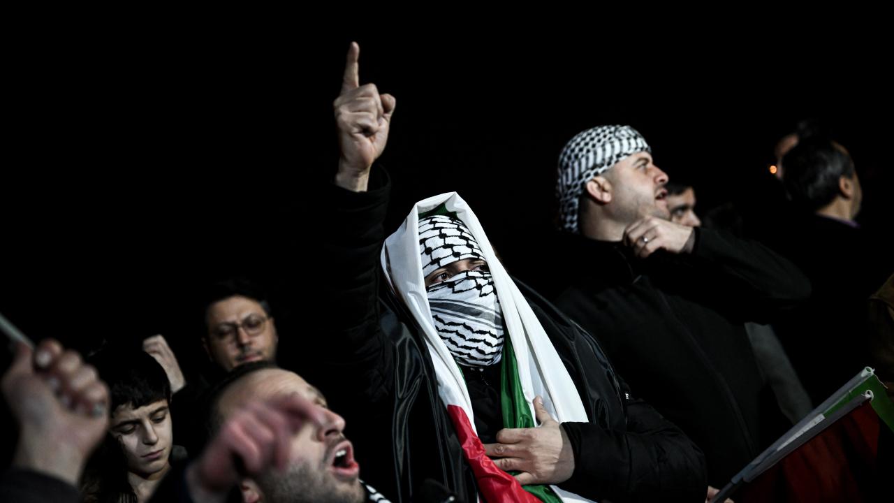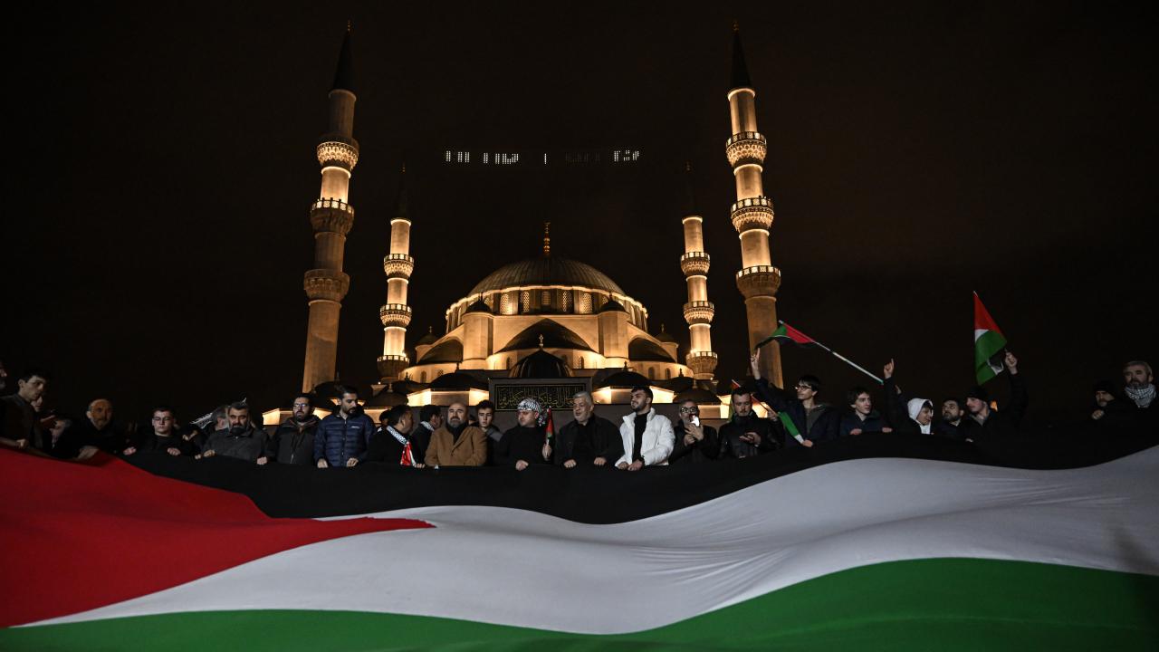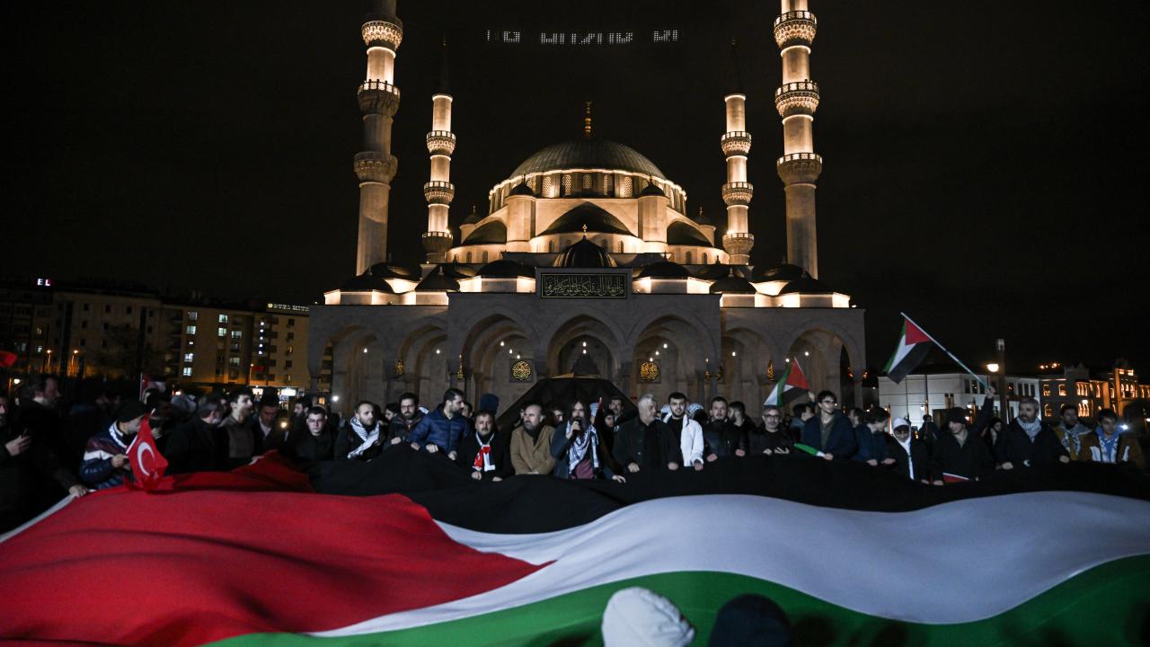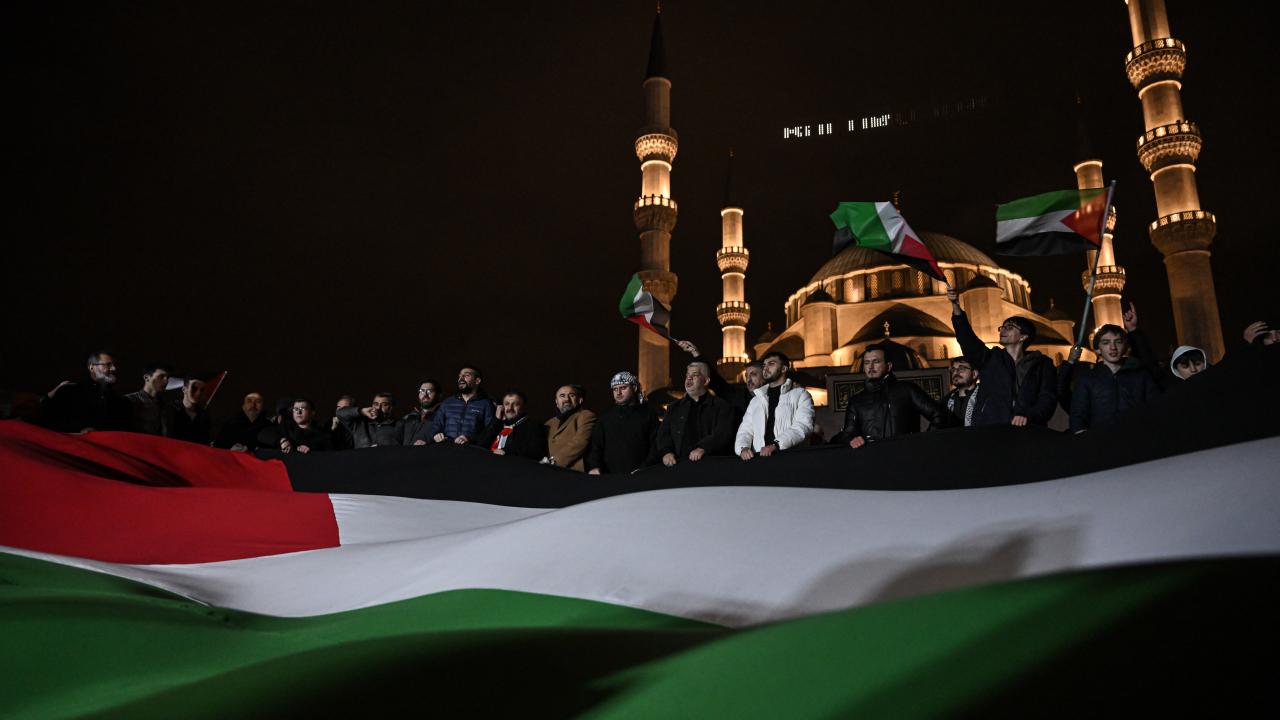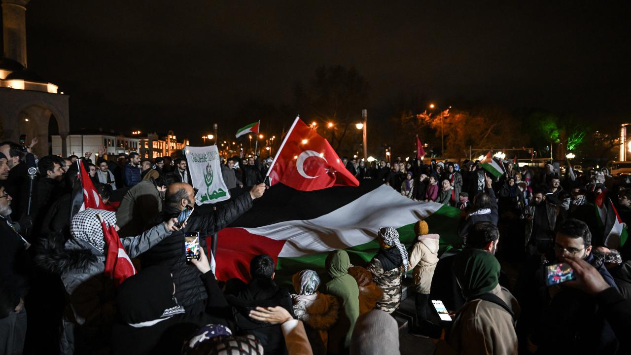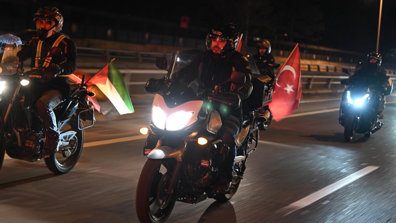 Güzergah boyunca Filistin bayrakları açan ve meşaleler yakan vatandaşlar, İsrail aleyhine sloganlar attı.
