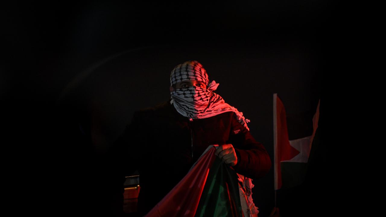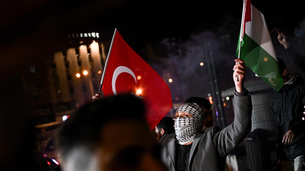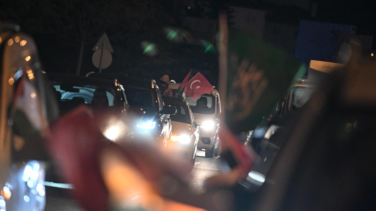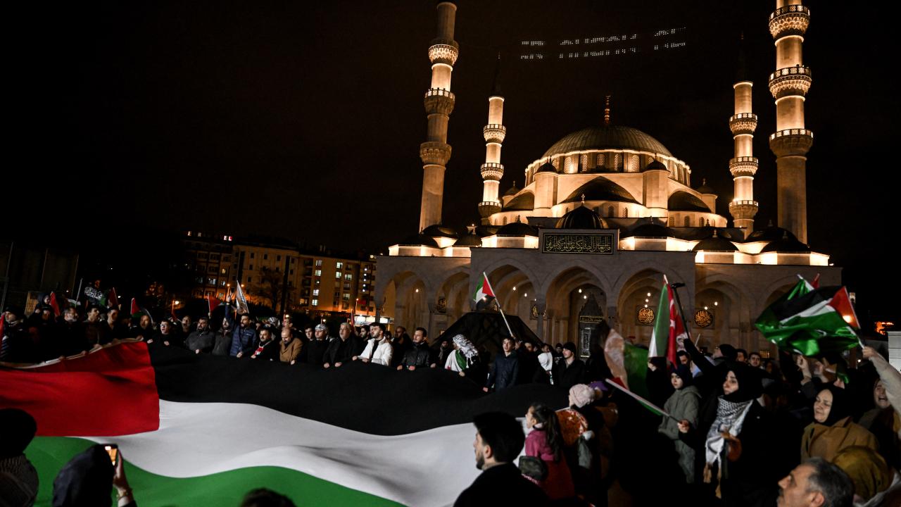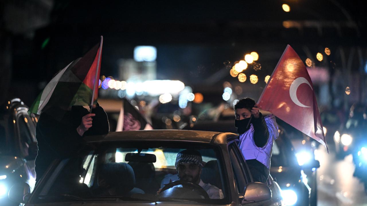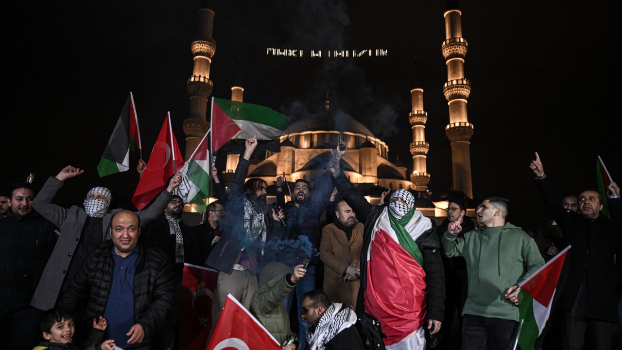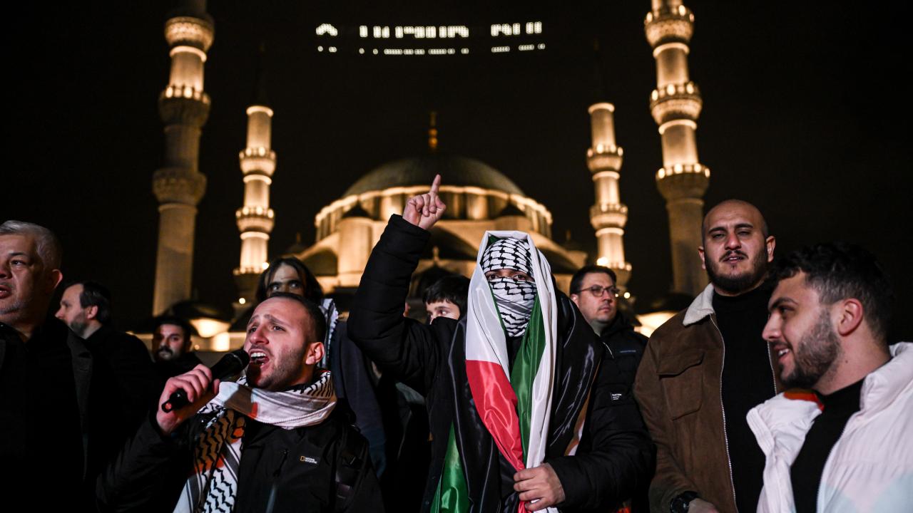 Güzergah boyunca Filistin bayrakları açan ve meşaleler yakan vatandaşlar, İsrail aleyhine sloganlar attı.