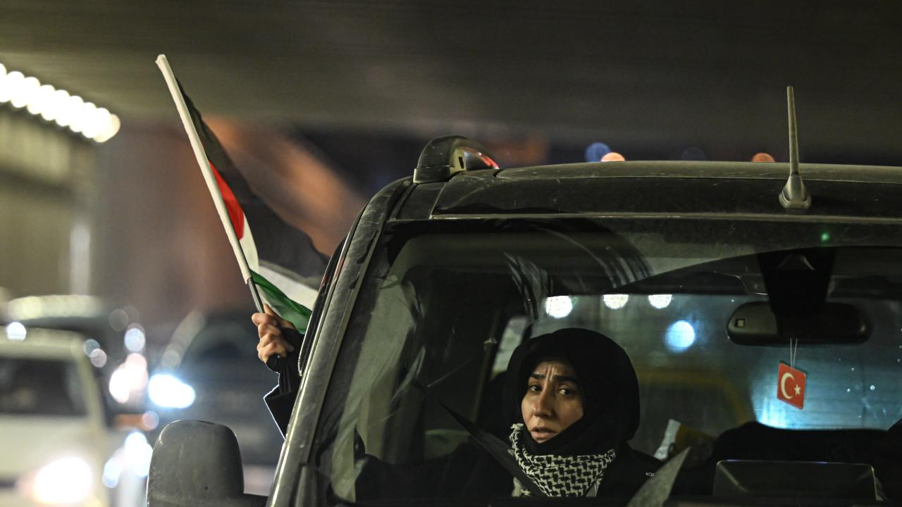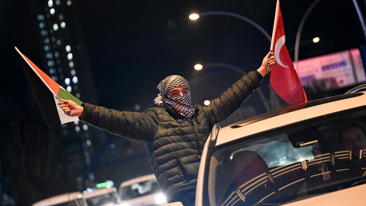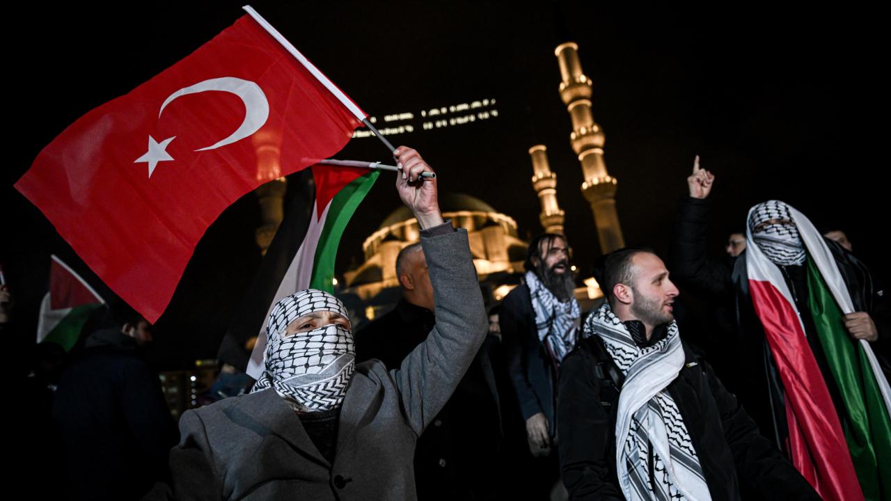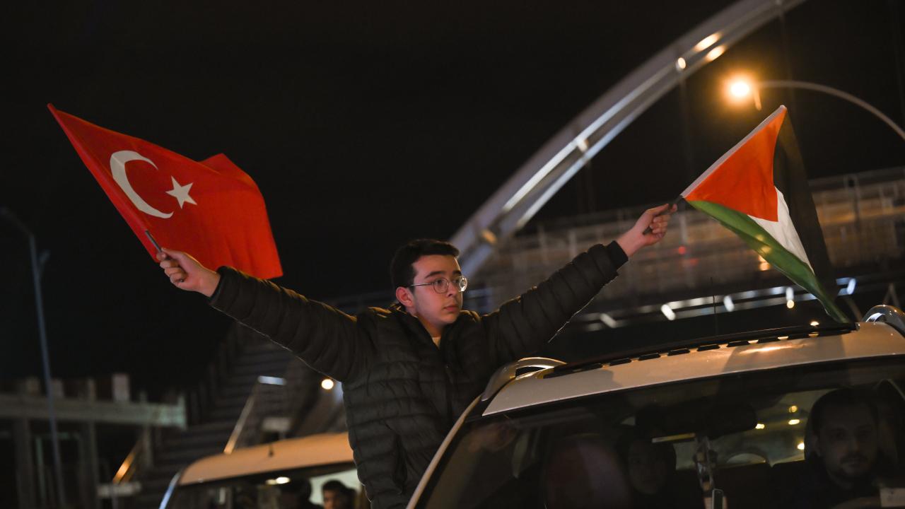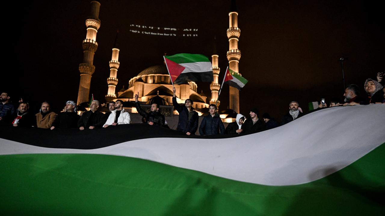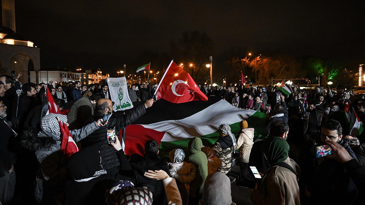 Güzergah boyunca Filistin bayrakları açan ve meşaleler yakan vatandaşlar, İsrail aleyhine sloganlar attı.