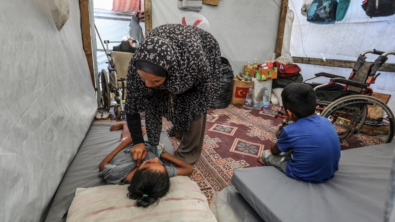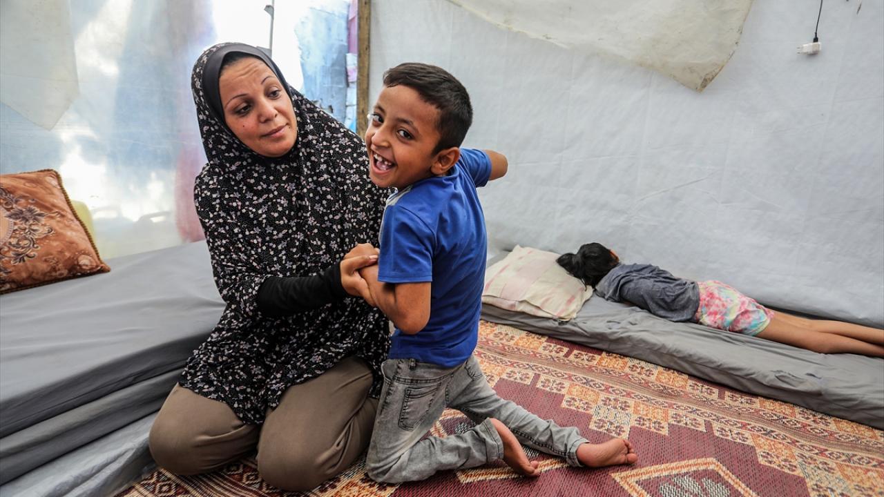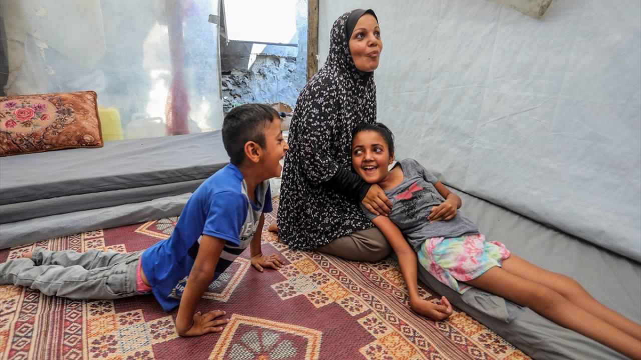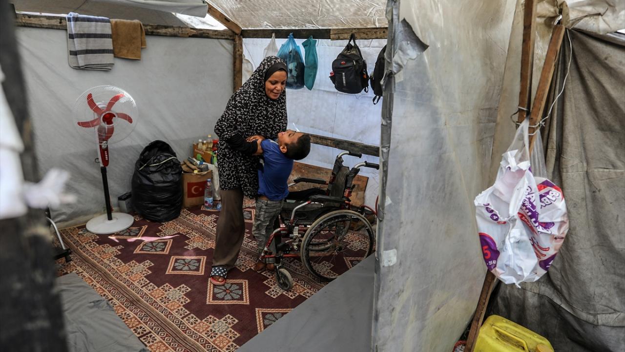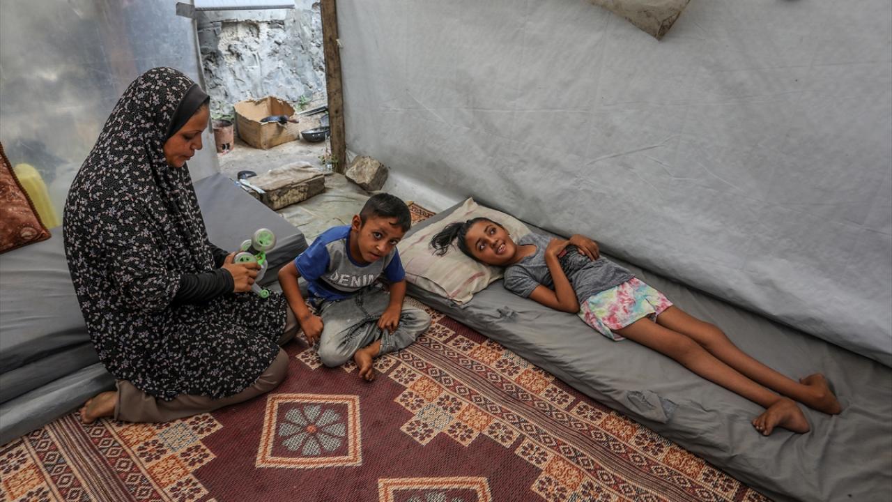 Engelli çocuklarıyla birlikte bir çadırda kalan Umm Hussein, maddi gelirinin olmaması ve çocuklarının özel durumu olması nedeniyle zor şartlar altında yaşam mücadelesi veriyor.