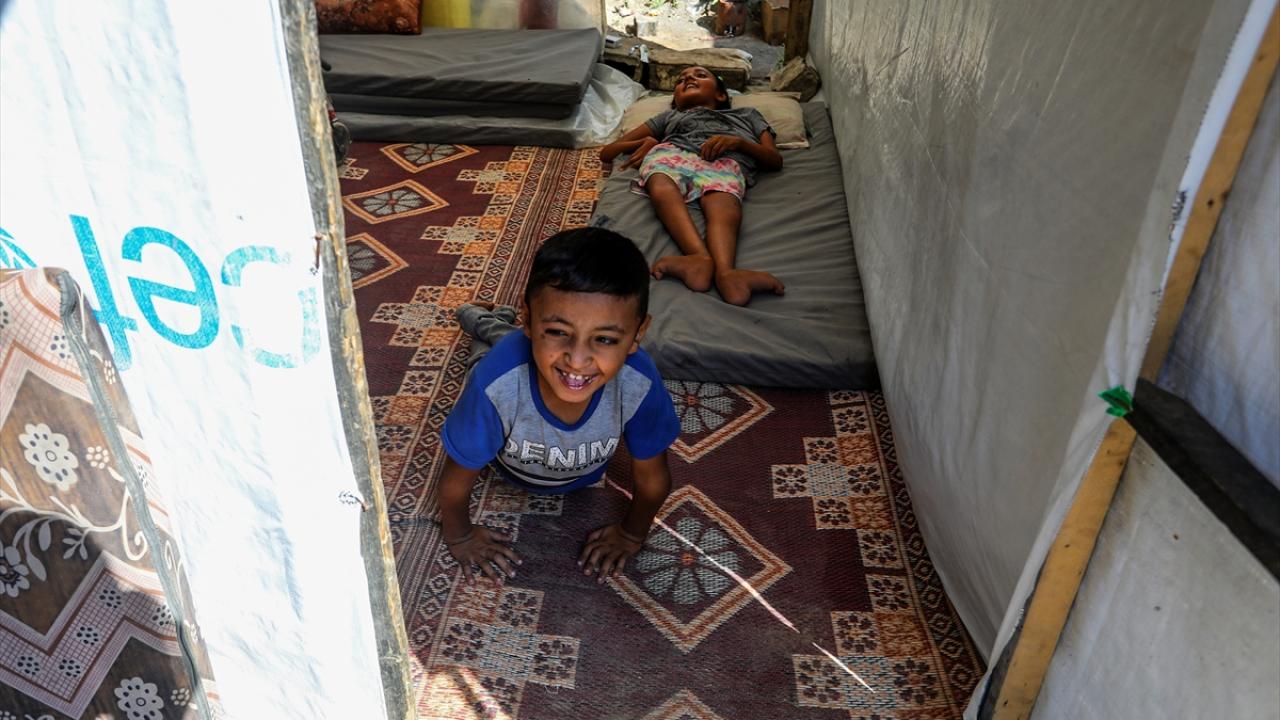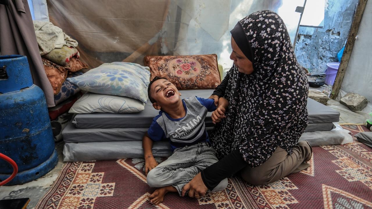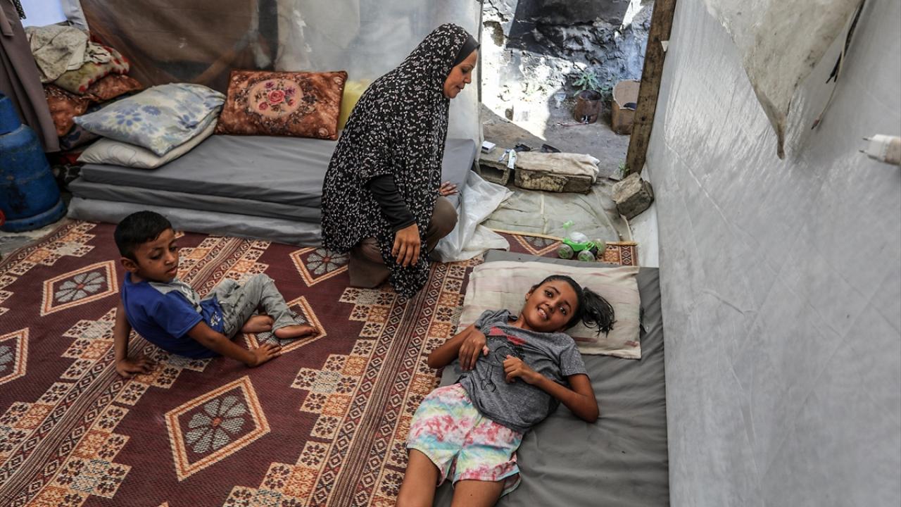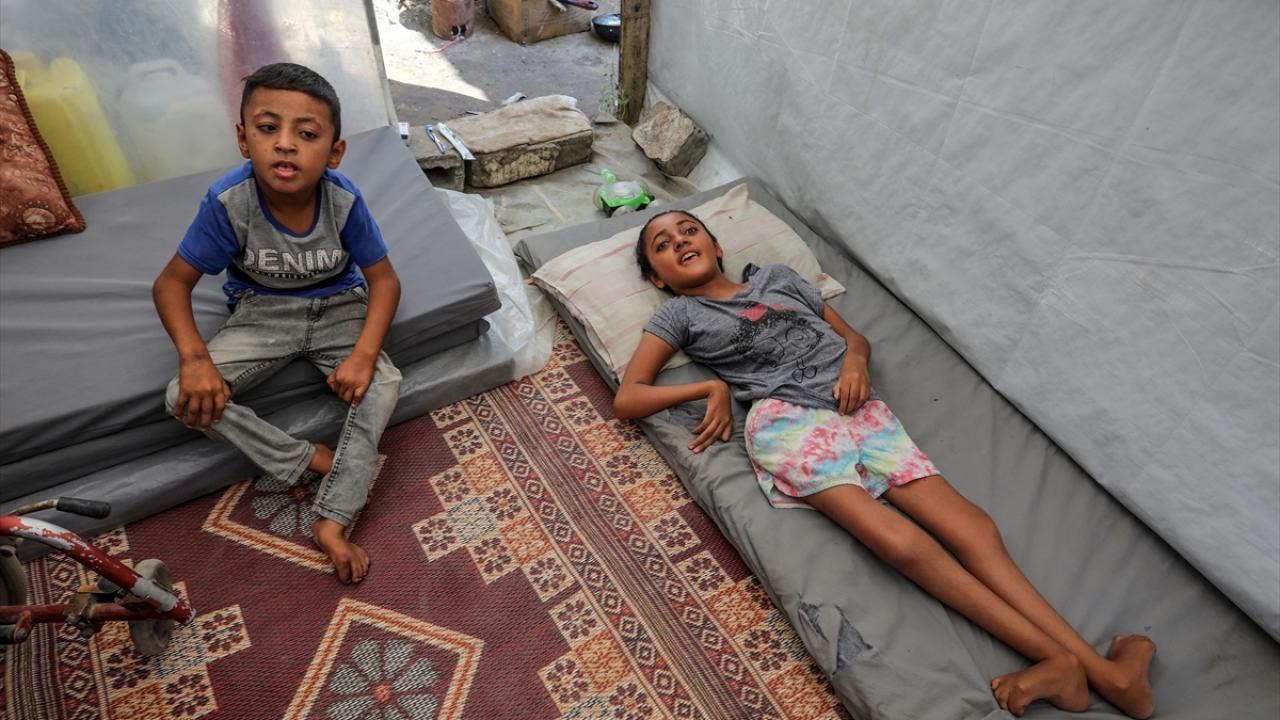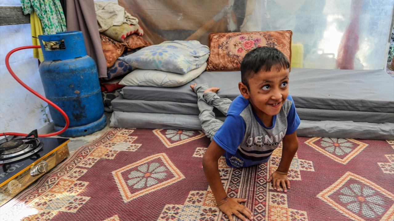 Engelli çocuklarıyla birlikte bir çadırda kalan Umm Hussein, maddi gelirinin olmaması ve çocuklarının özel durumu olması nedeniyle zor şartlar altında yaşam mücadelesi veriyor.