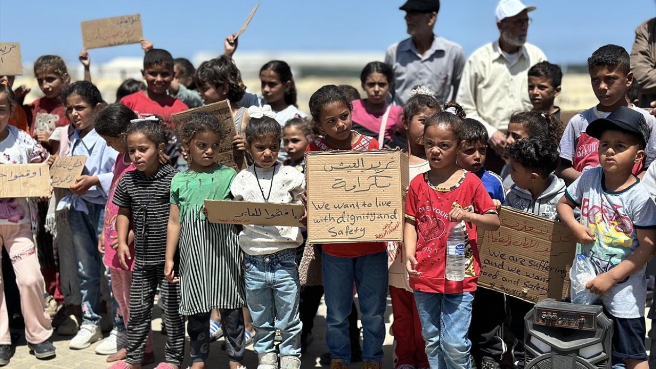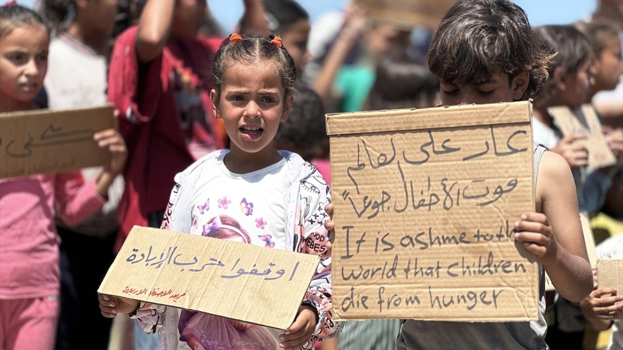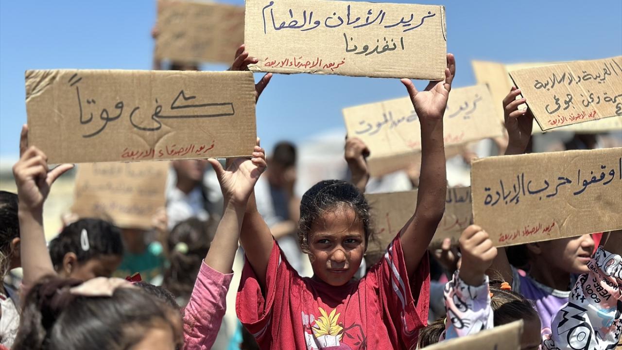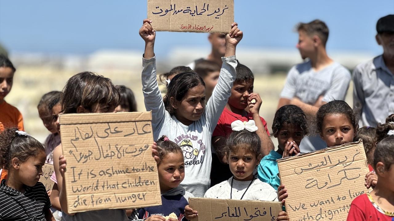 "Ölüme hayır, açlığa hayır" pankartları taşıyan çocuklar, uluslararası topluma seslenerek, "Bombardımanla, hastalıkla, açlıkla ve susuzlukla ölüyoruz; dünya ise sessiz kalıyor" mesajı verdi.