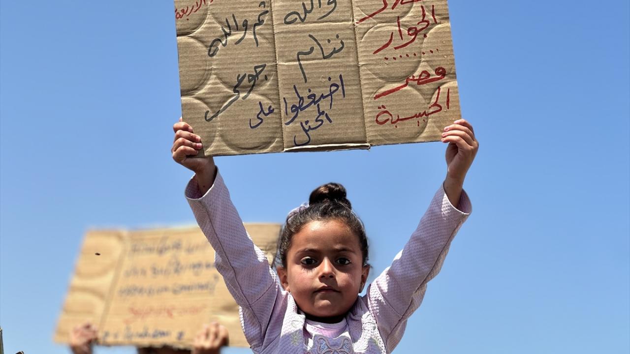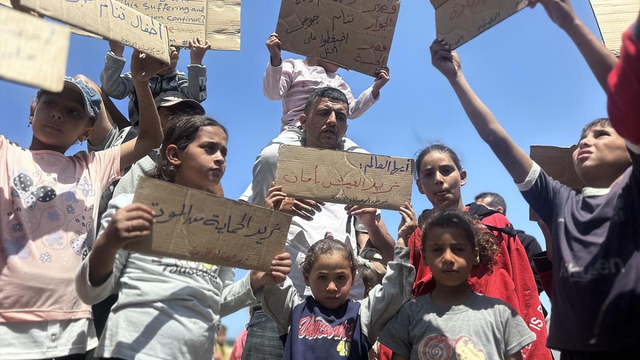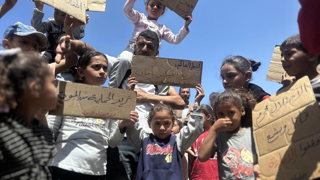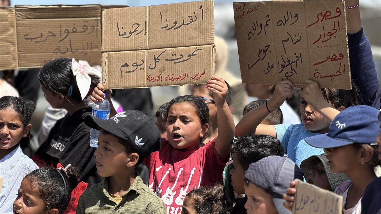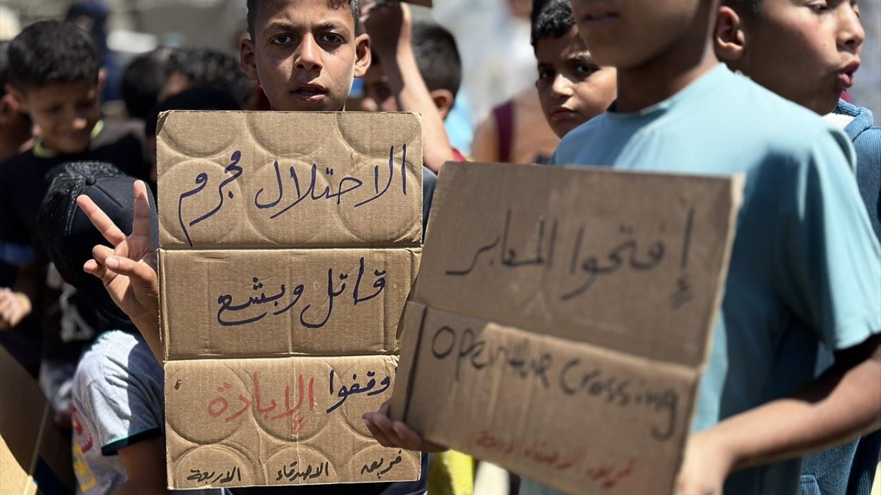 "Ölüme hayır, açlığa hayır" pankartları taşıyan çocuklar, uluslararası topluma seslenerek, "Bombardımanla, hastalıkla, açlıkla ve susuzlukla ölüyoruz; dünya ise sessiz kalıyor" mesajı verdi.