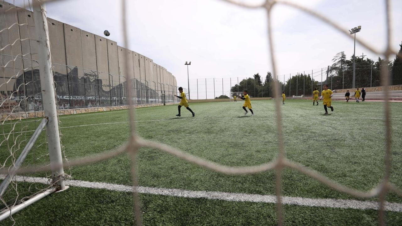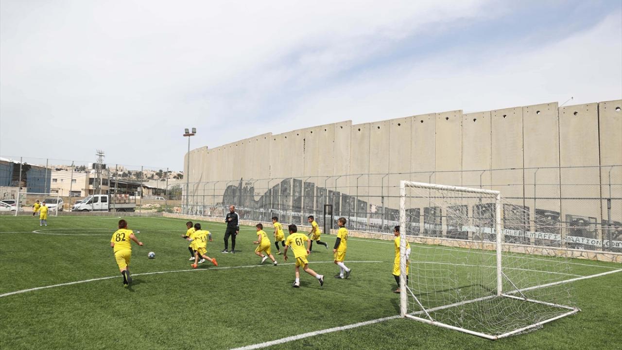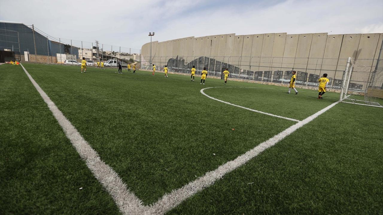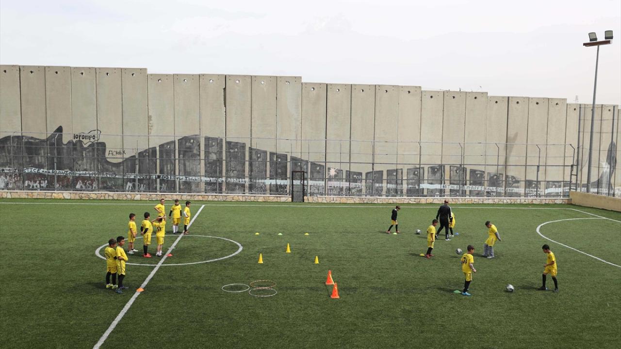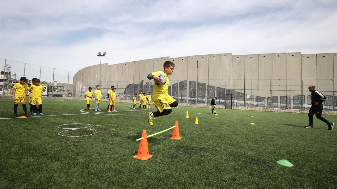İşgal altındaki Batı Şeria'da üç tarafı İsrail'in Ayrım Duvarı'yla çevrili Ayide Mülteci Kampı'ndaki Filistinli futbolcular, antrenmanlarını duvarın ve askeri kulelerin gölgesinde yapmaya çalışıyor.