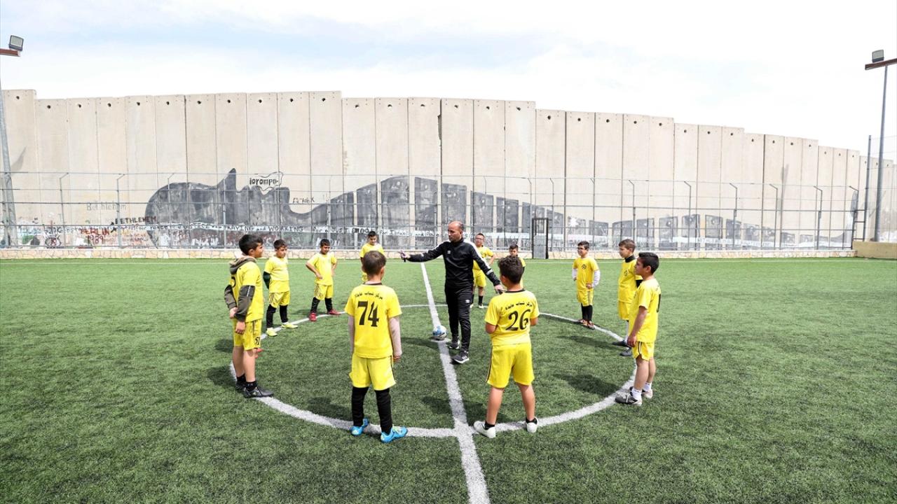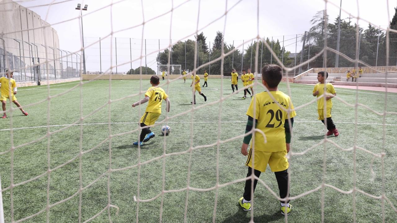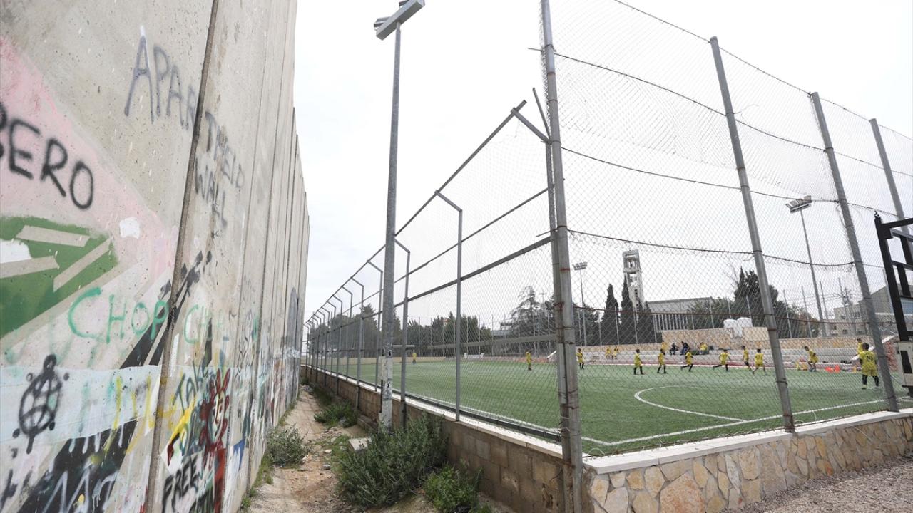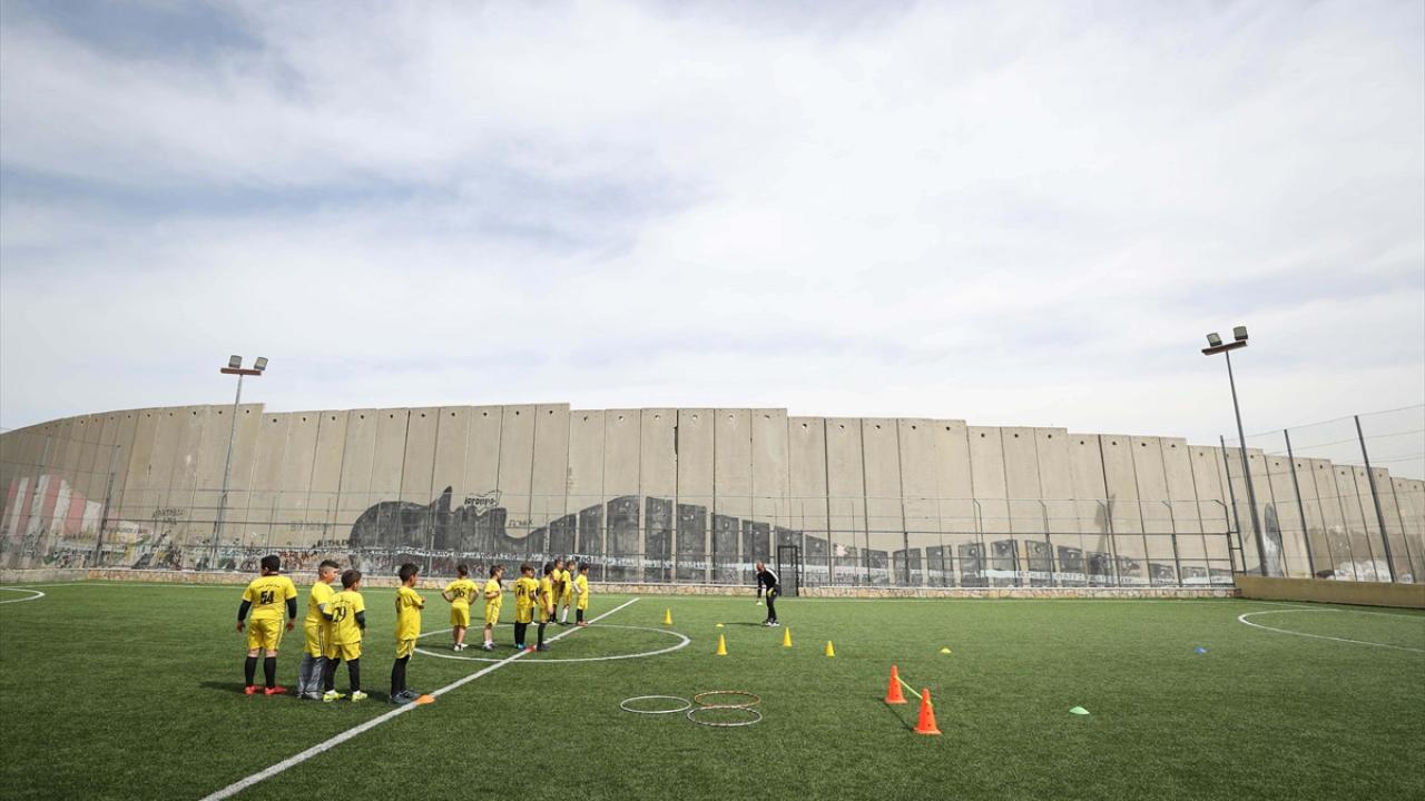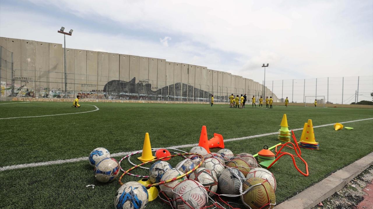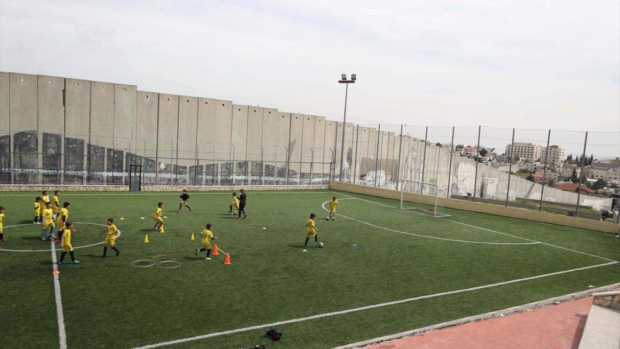 İşgal altındaki Batı Şeria'da üç tarafı İsrail'in Ayrım Duvarı'yla çevrili Ayide Mülteci Kampı'ndaki Filistinli futbolcular, antrenmanlarını duvarın ve askeri kulelerin gölgesinde yapmaya çalışıyor.