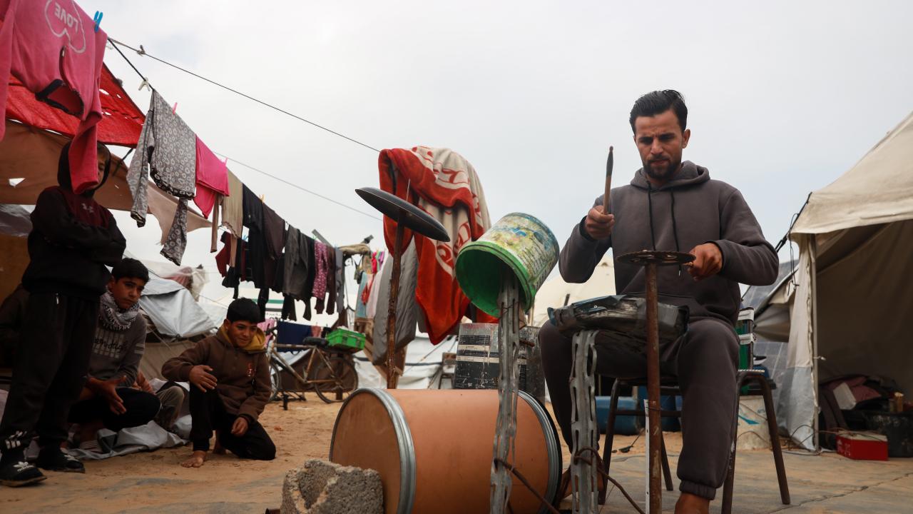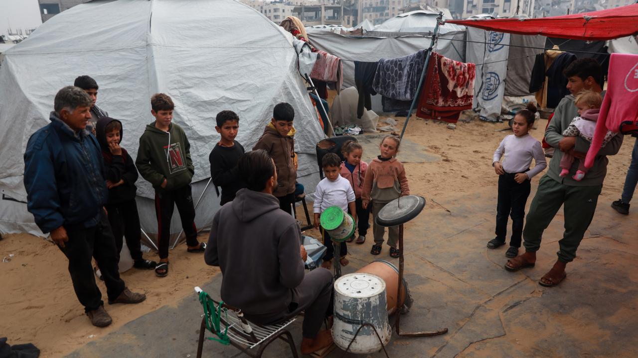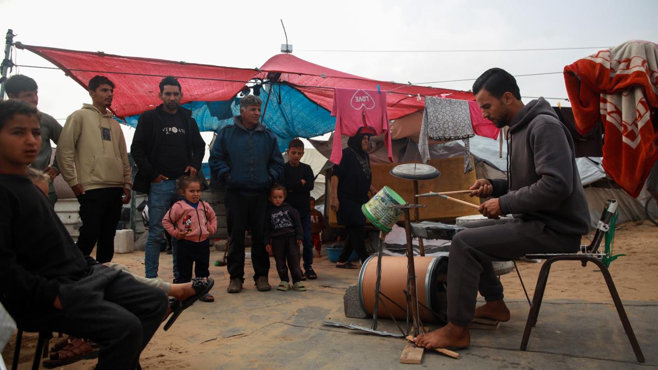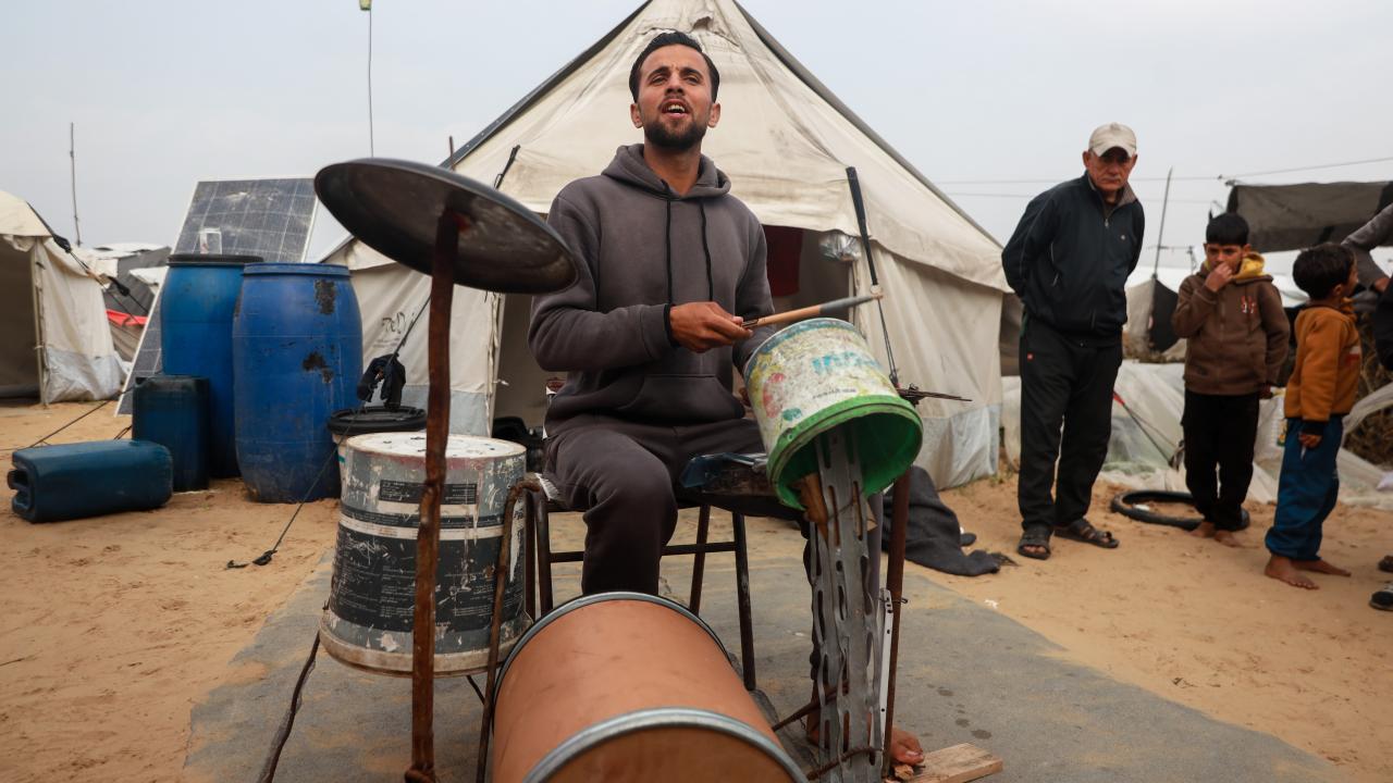 Filistinli genç davulla sığınmacılara moral vermeye çalışıyor
