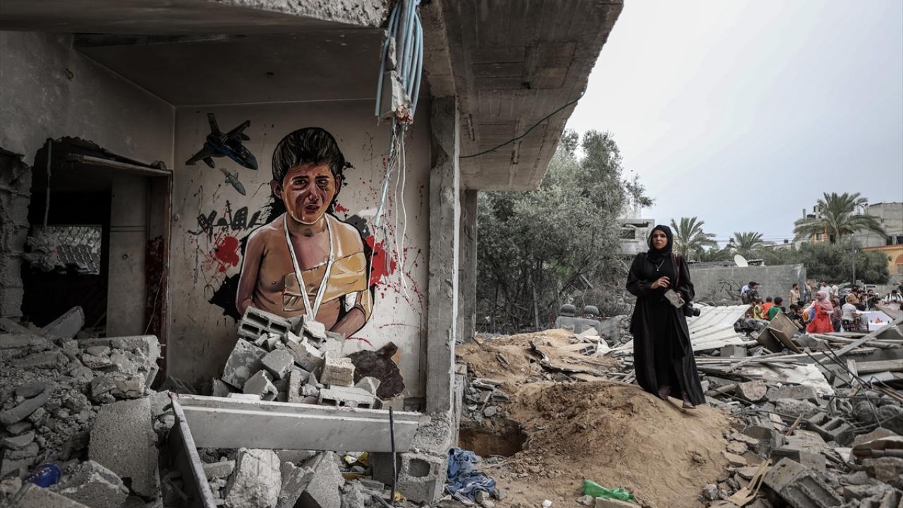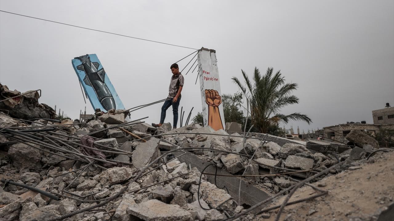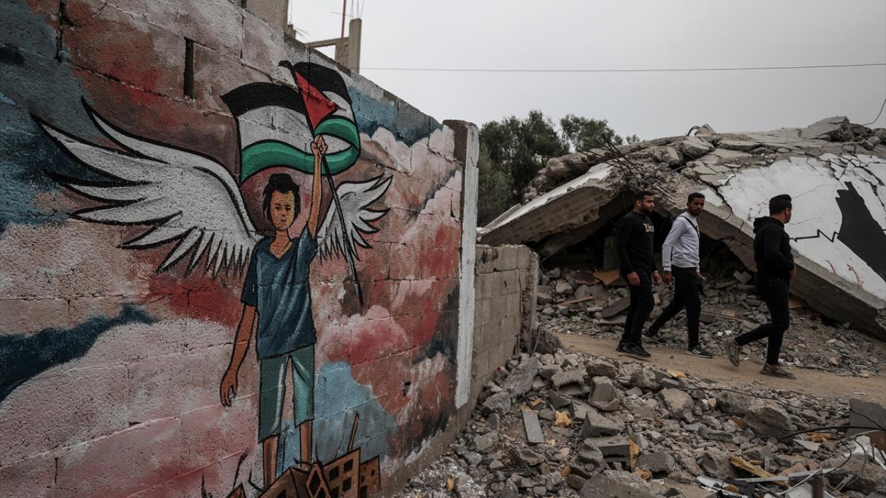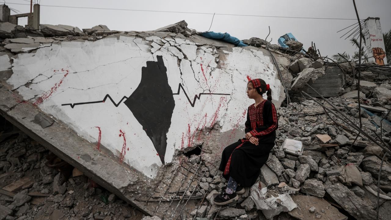 Gazze Şeridi'nin Deyr Balah kentindeki Filistinli grafiti sanatçıları, "İşgal Çocukları Öldürüyor" adı altında İsrail'in son saldırılarında yıkılan evlerin enkazları üzerine grafiti çizdi.