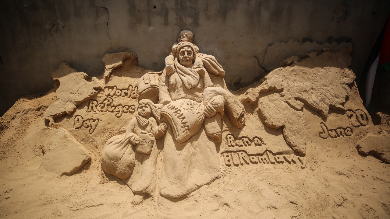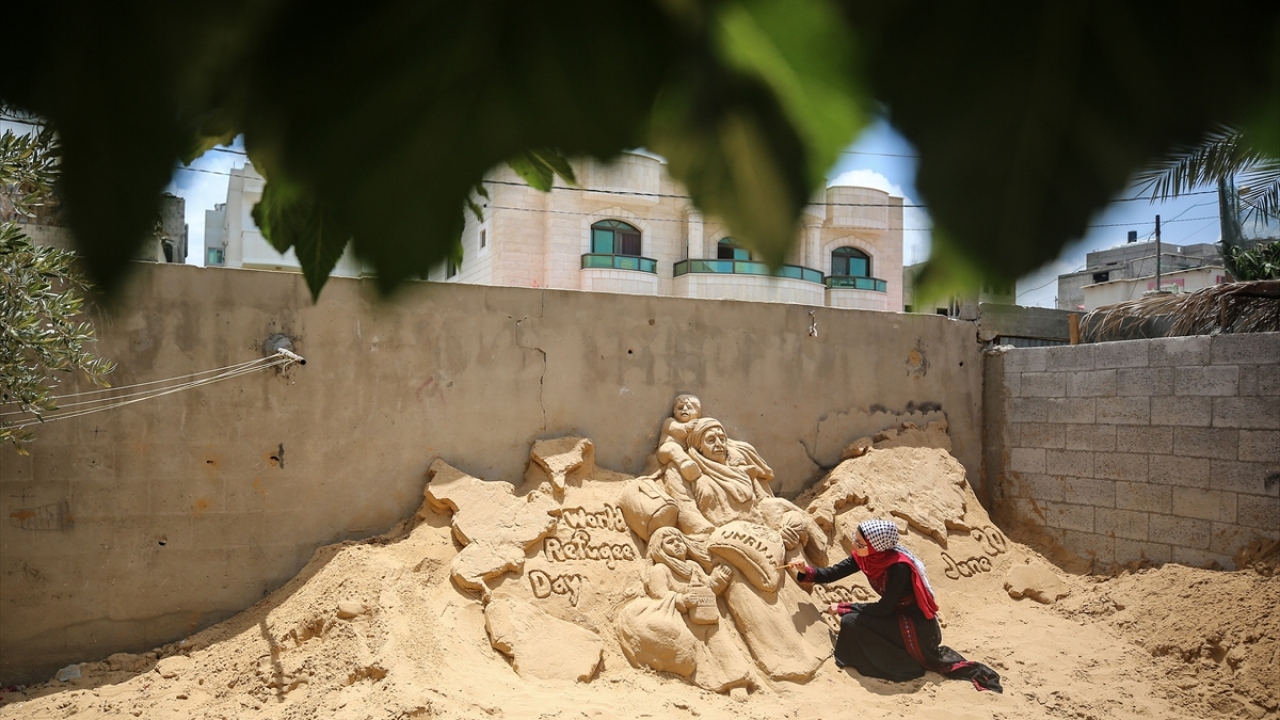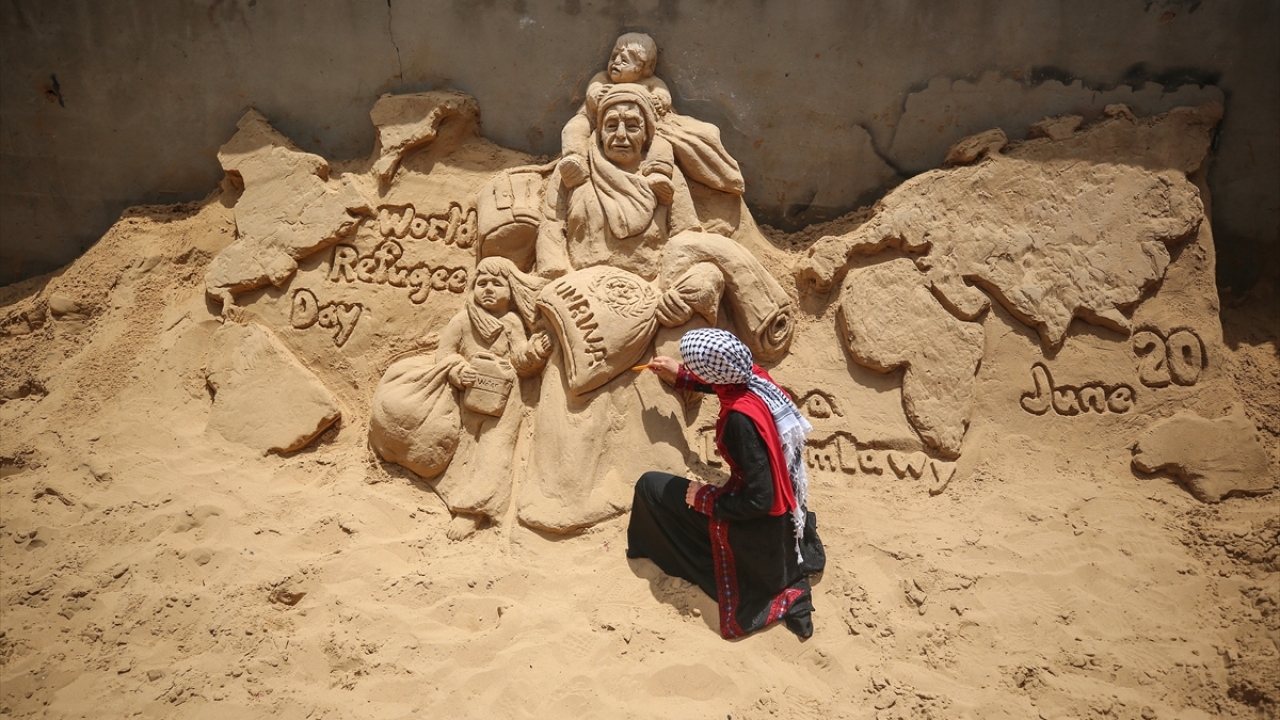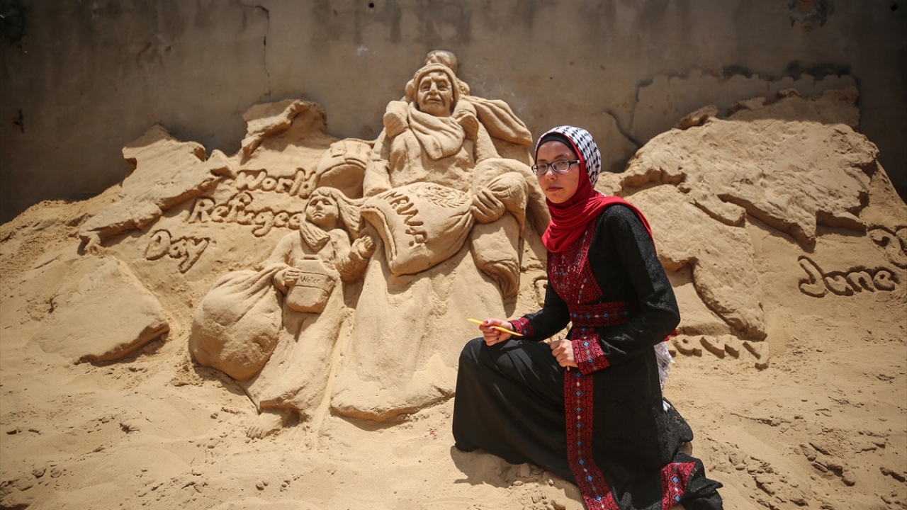 Filistinli heykeltraş Rana El-Ramlavi, 20 Haziran Dünya Mülteciler Günü dolayısıyla Gazze Şeridi'nde zor yaşam koşulları ve ekonomik şartlar altında hayatlarını idame ettirmeye çalışan Filistinli mültecilerin mücadelesini anlatan kum heykeli yaptı.