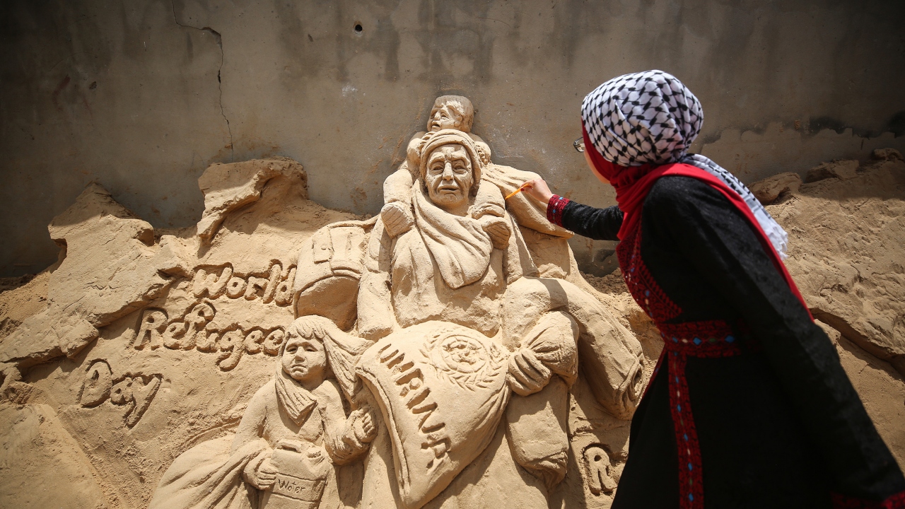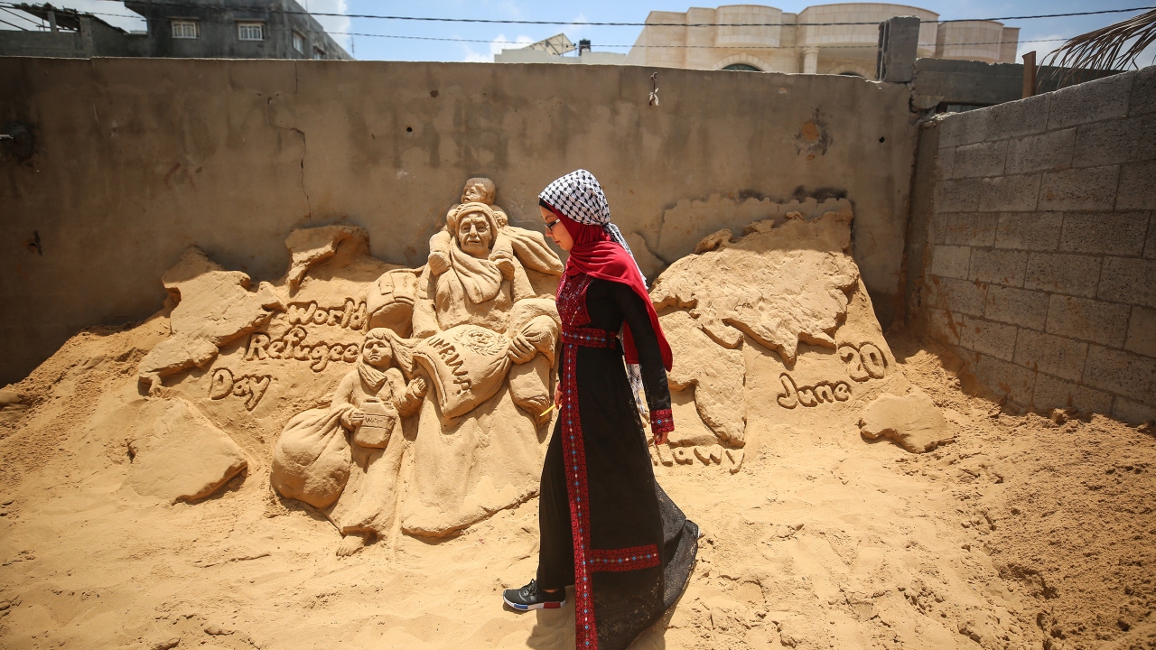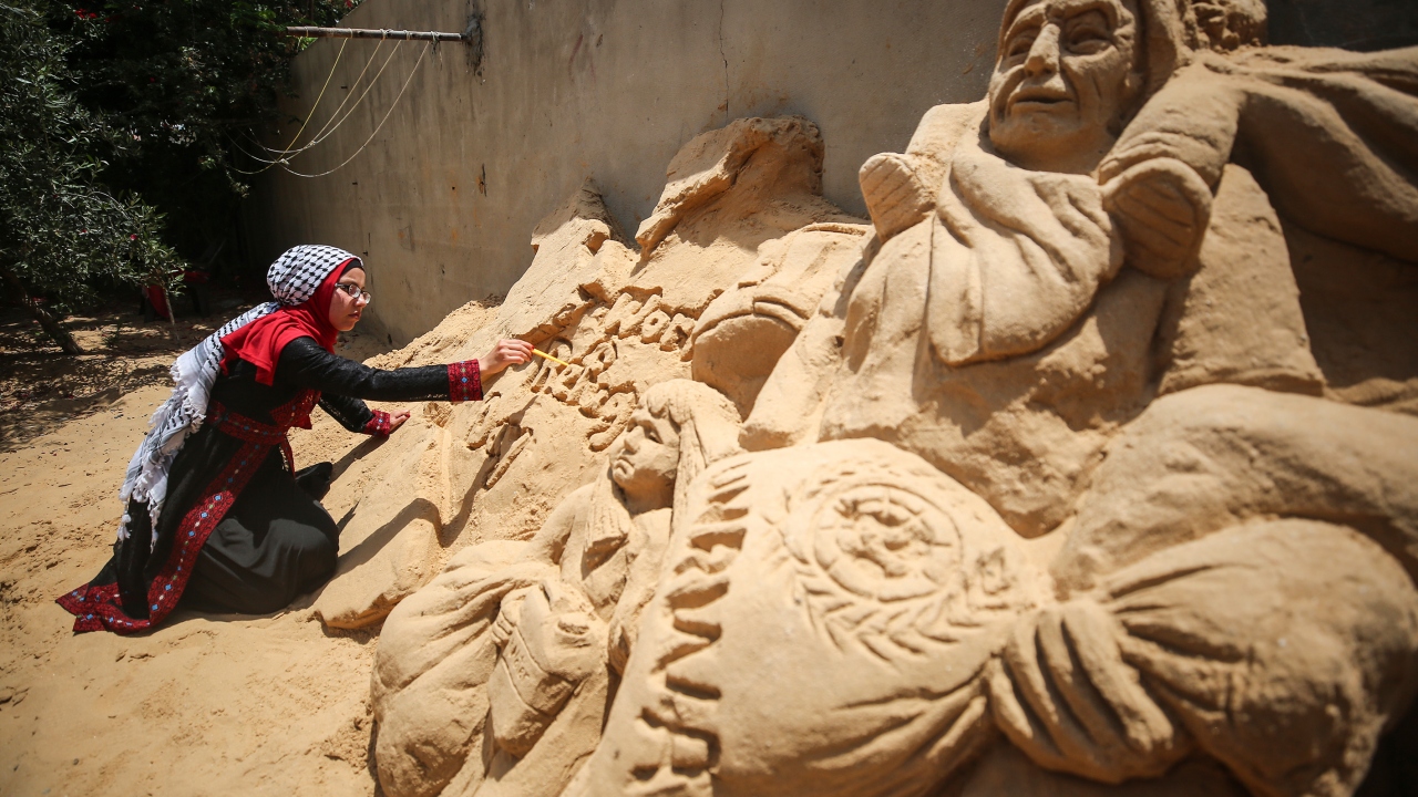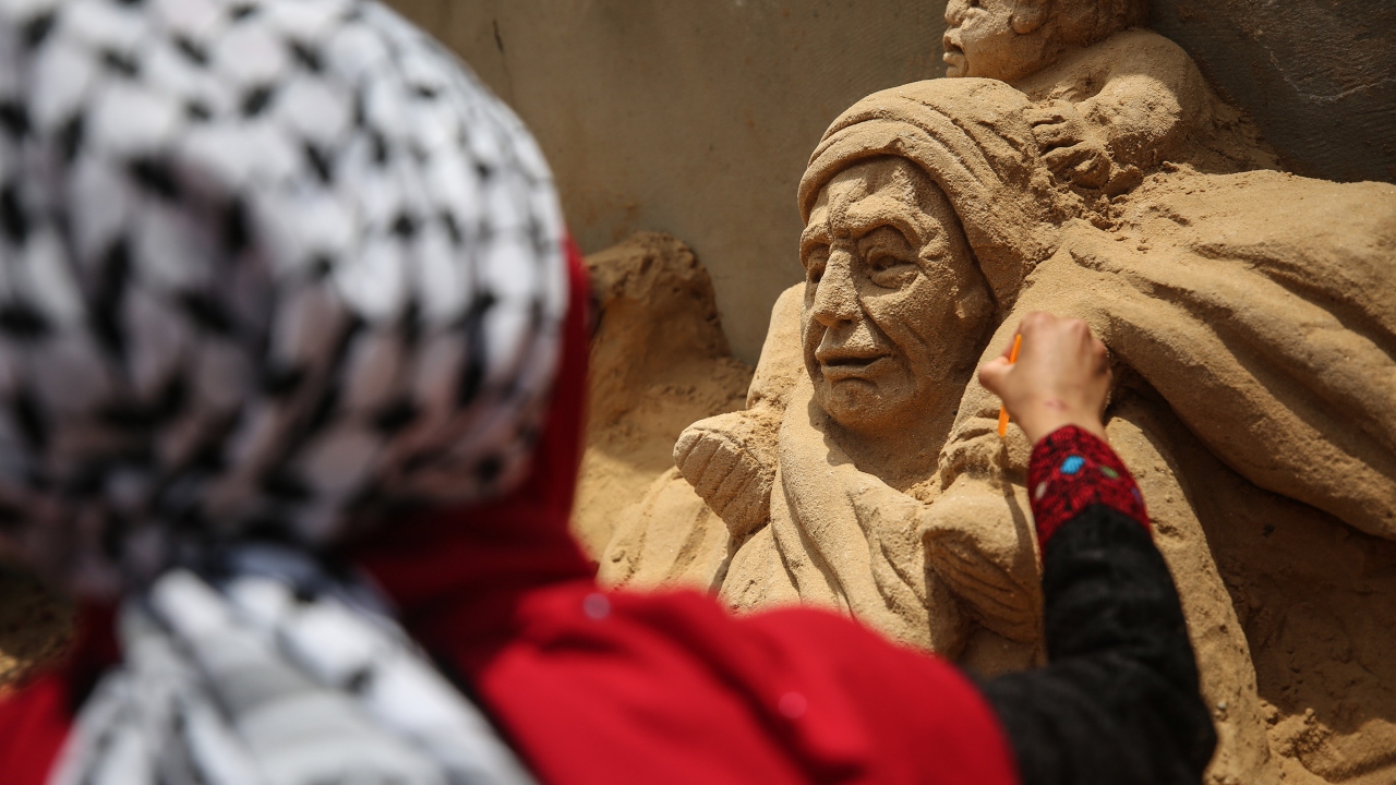 Filistinli heykeltraş Rana El-Ramlavi, 20 Haziran Dünya Mülteciler Günü dolayısıyla Gazze Şeridi'nde zor yaşam koşulları ve ekonomik şartlar altında hayatlarını idame ettirmeye çalışan Filistinli mültecilerin mücadelesini anlatan kum heykeli yaptı.