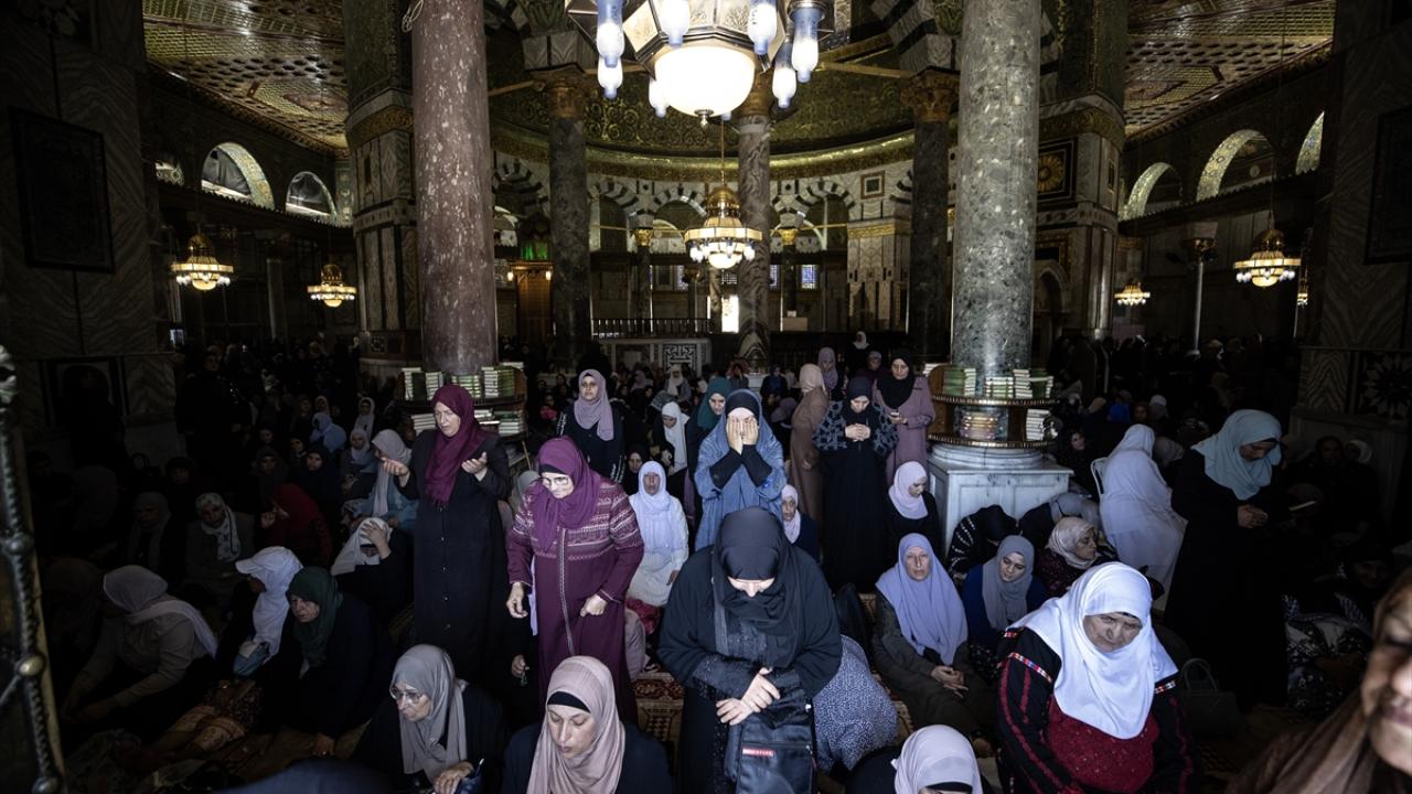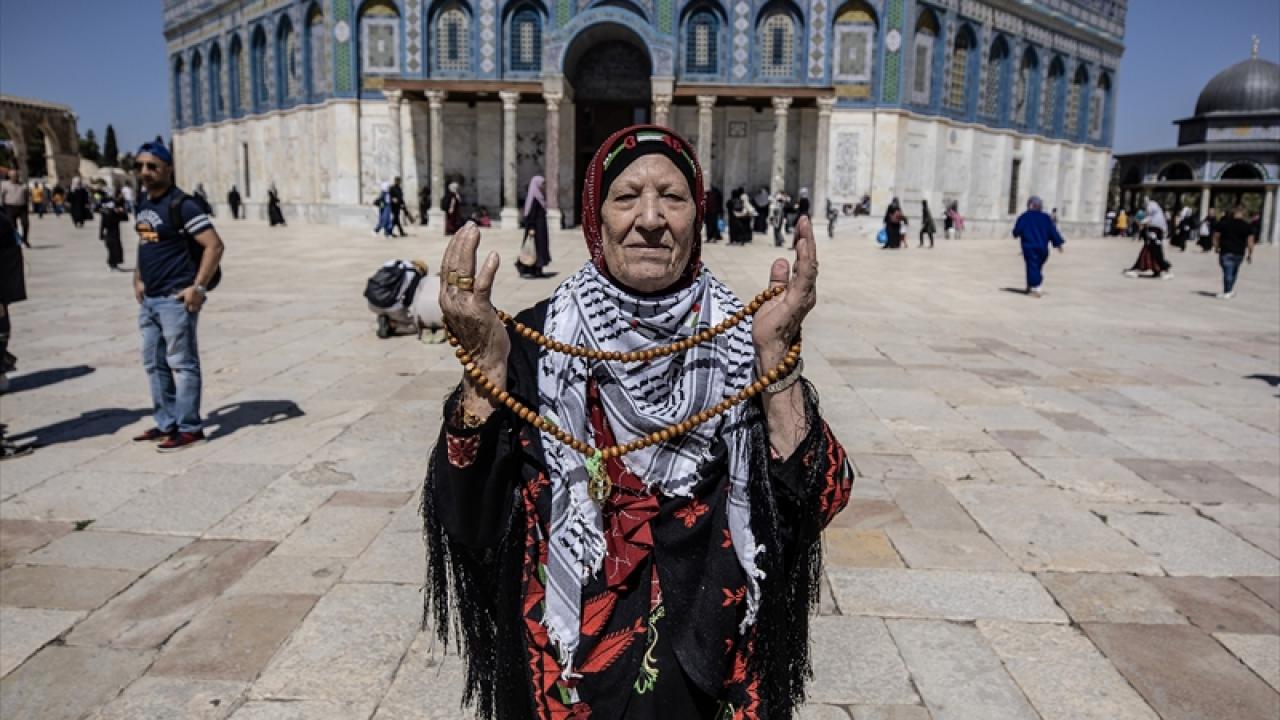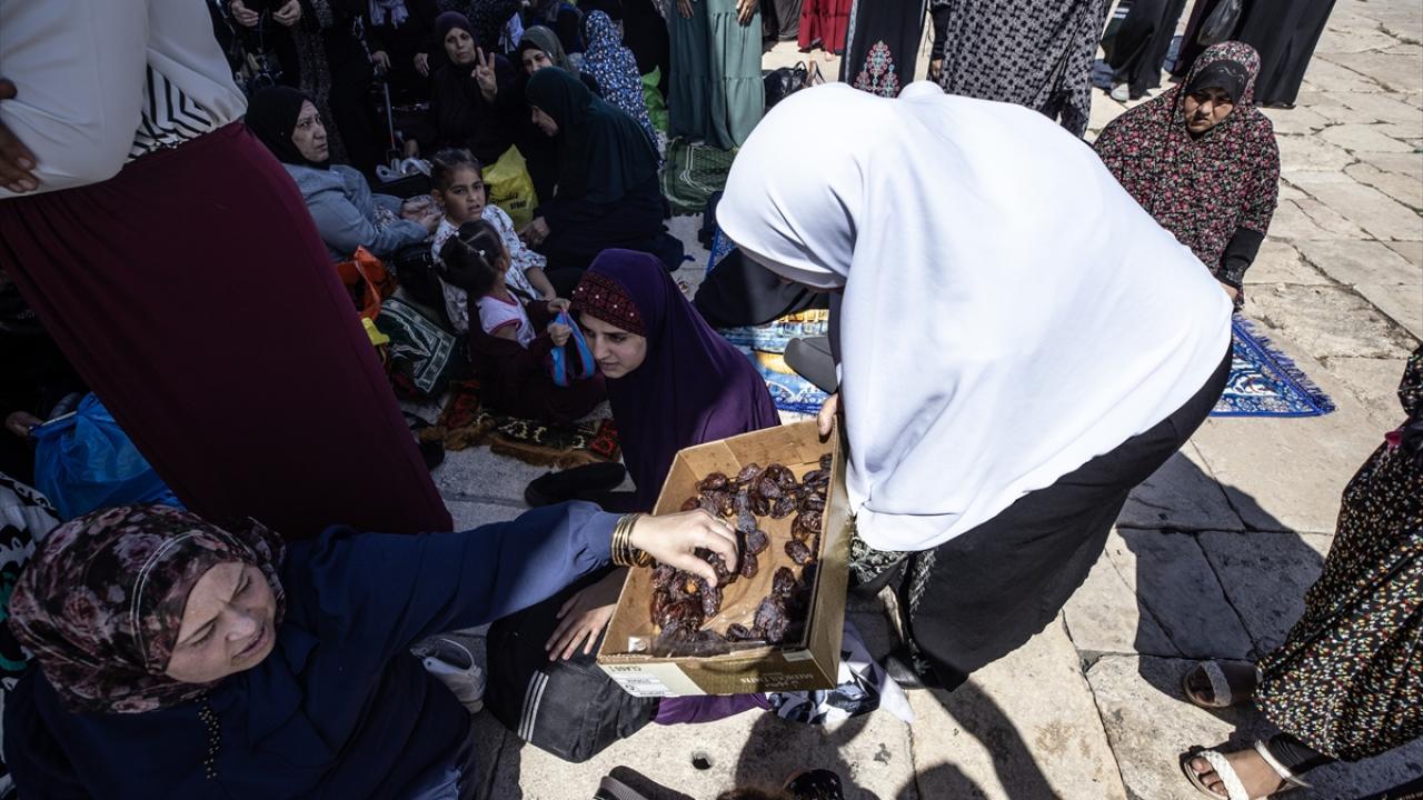 Namaz kılan, ibadet eden ve çeşitli ilahiler söyleyen Filistinliler, daha sonra Aksa`nın avlusunda hurma ve tatlı gibi ikramlıklar dağıttı.