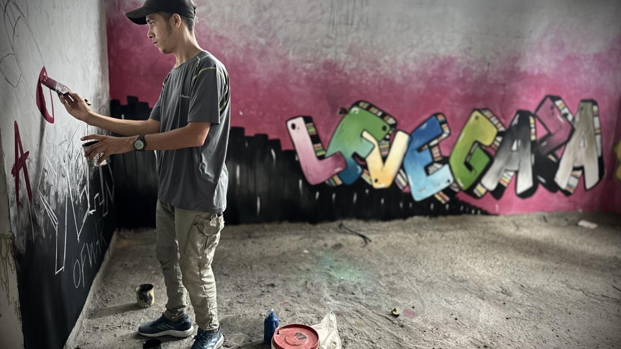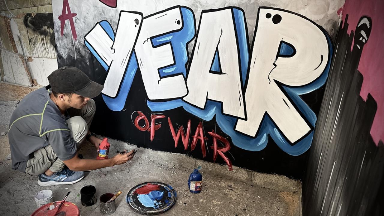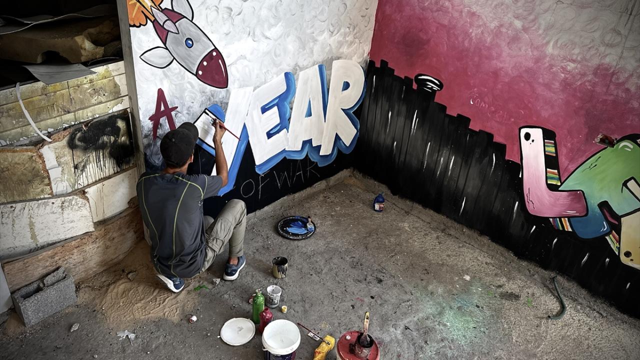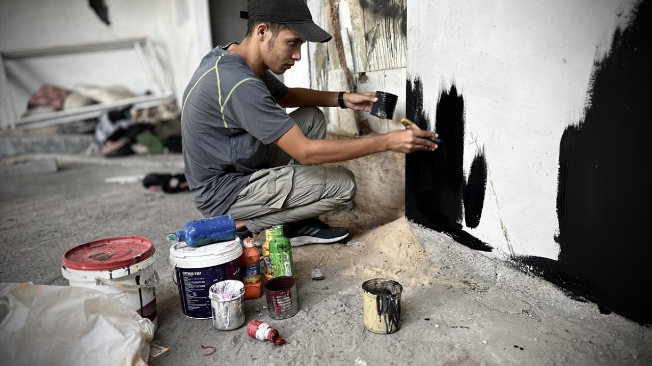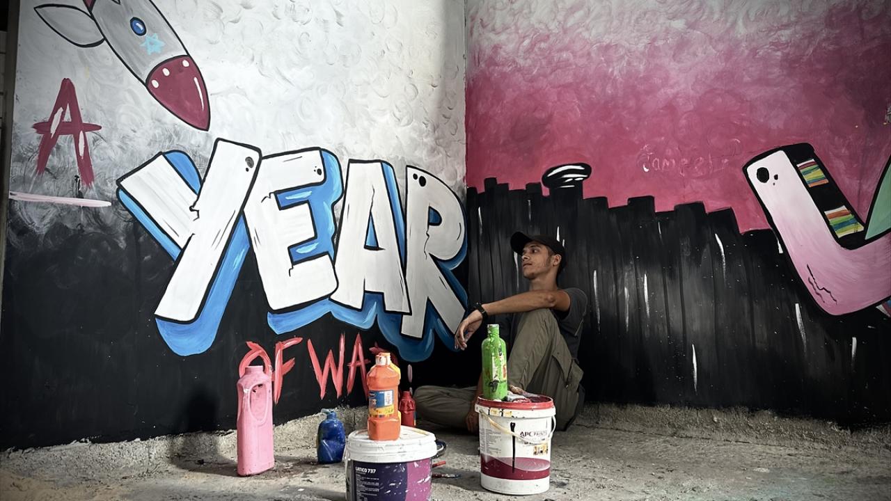 Filistinli ressam Cemil el-Baz, İsrail'in Gazze'ye yönelik saldırıları bir yılı geride bırakırken, saldırılarda bir bölümü yıkılan Nasirat Mülteci Kampı'ndaki evinin duvarlarına saldırıları anlatan çizimler yapıyor.