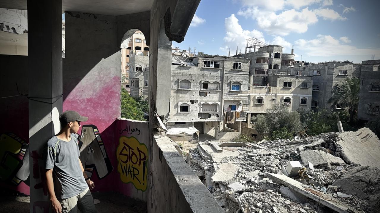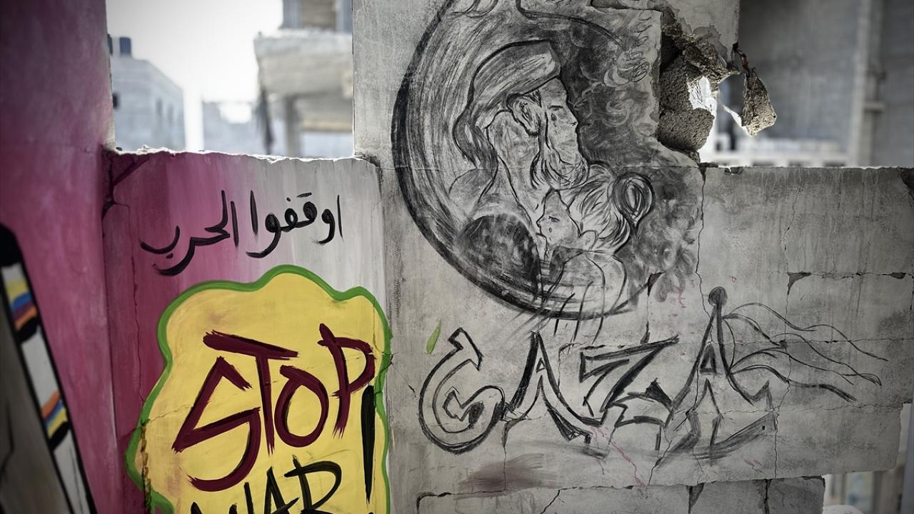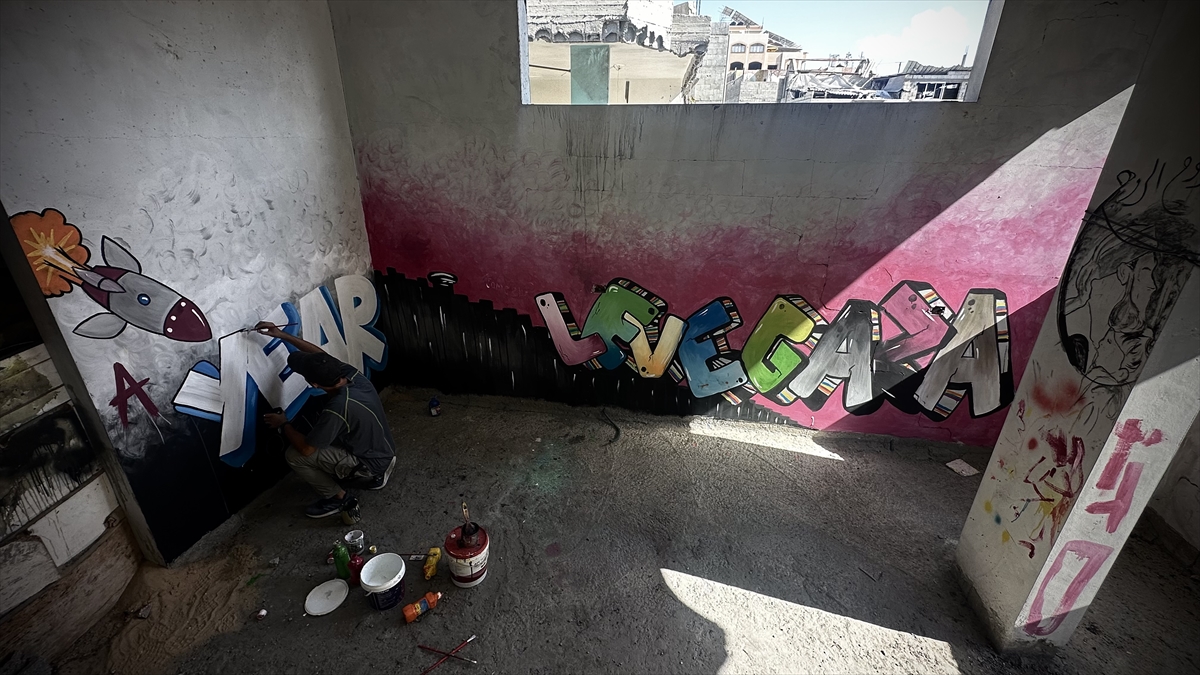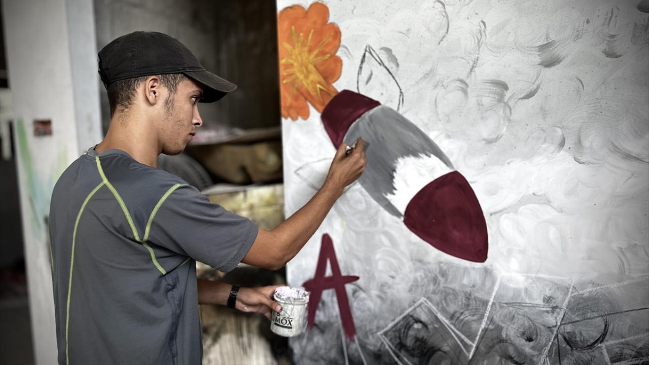 Filistinli ressam Cemil el-Baz, İsrail'in Gazze'ye yönelik saldırıları bir yılı geride bırakırken, saldırılarda bir bölümü yıkılan Nasirat Mülteci Kampı'ndaki evinin duvarlarına saldırıları anlatan çizimler yapıyor.