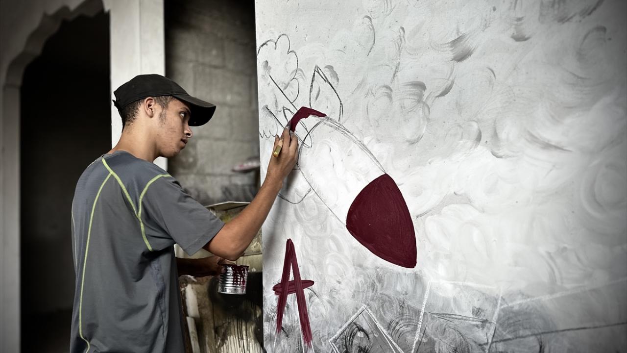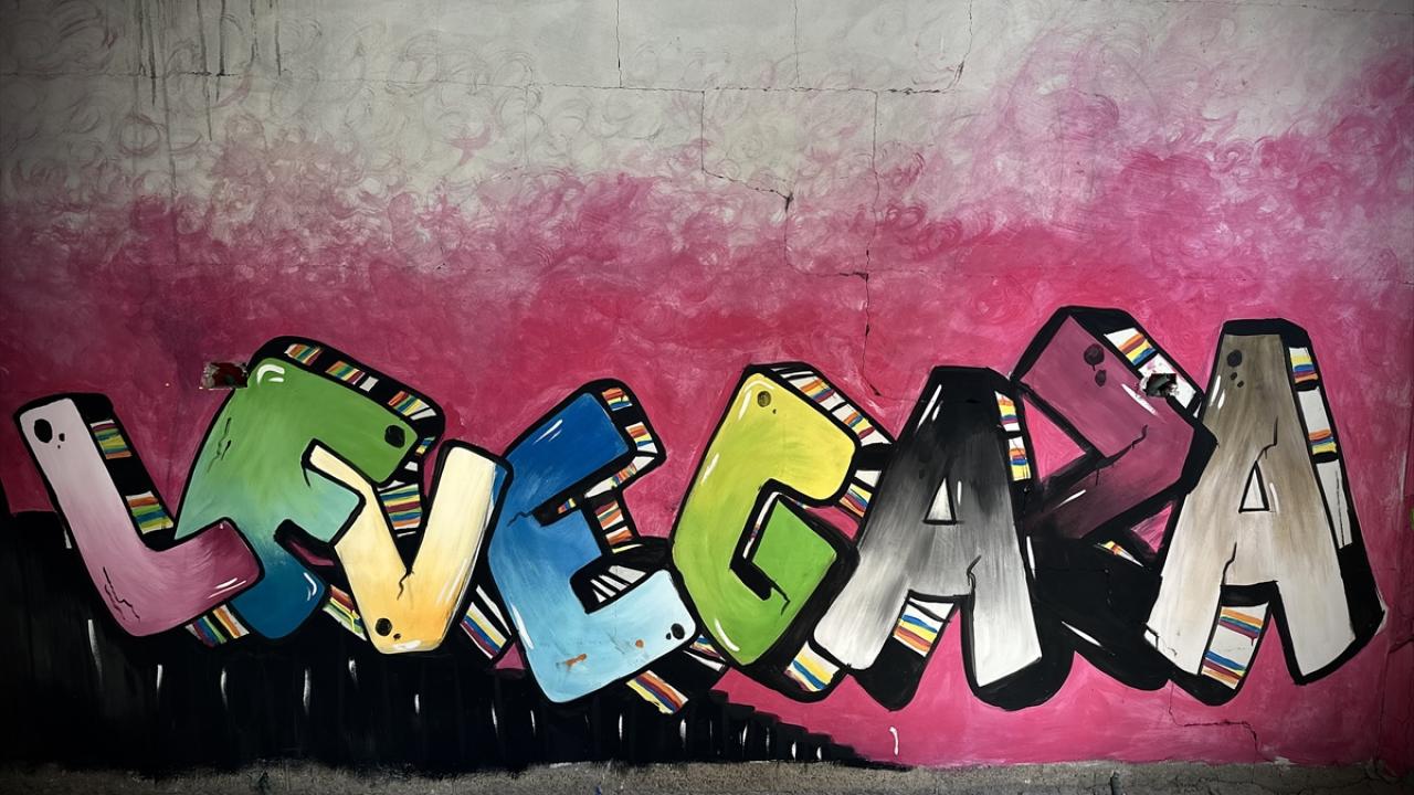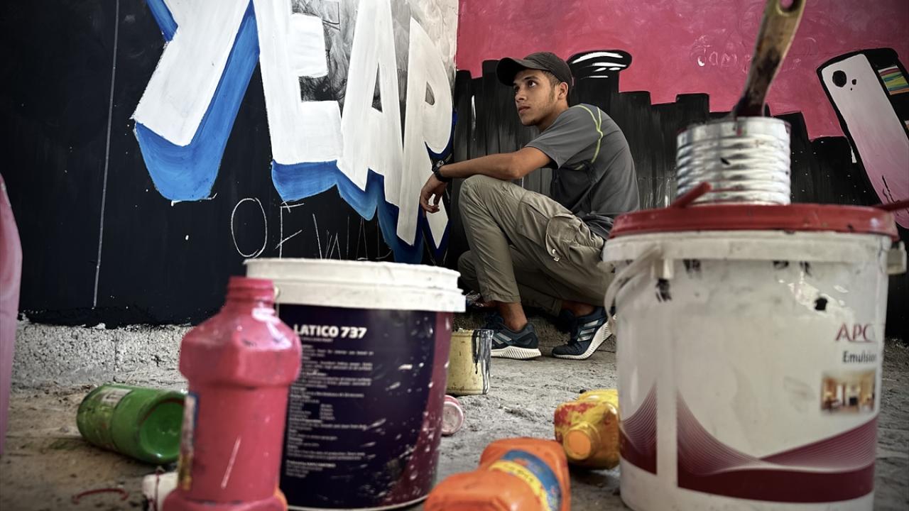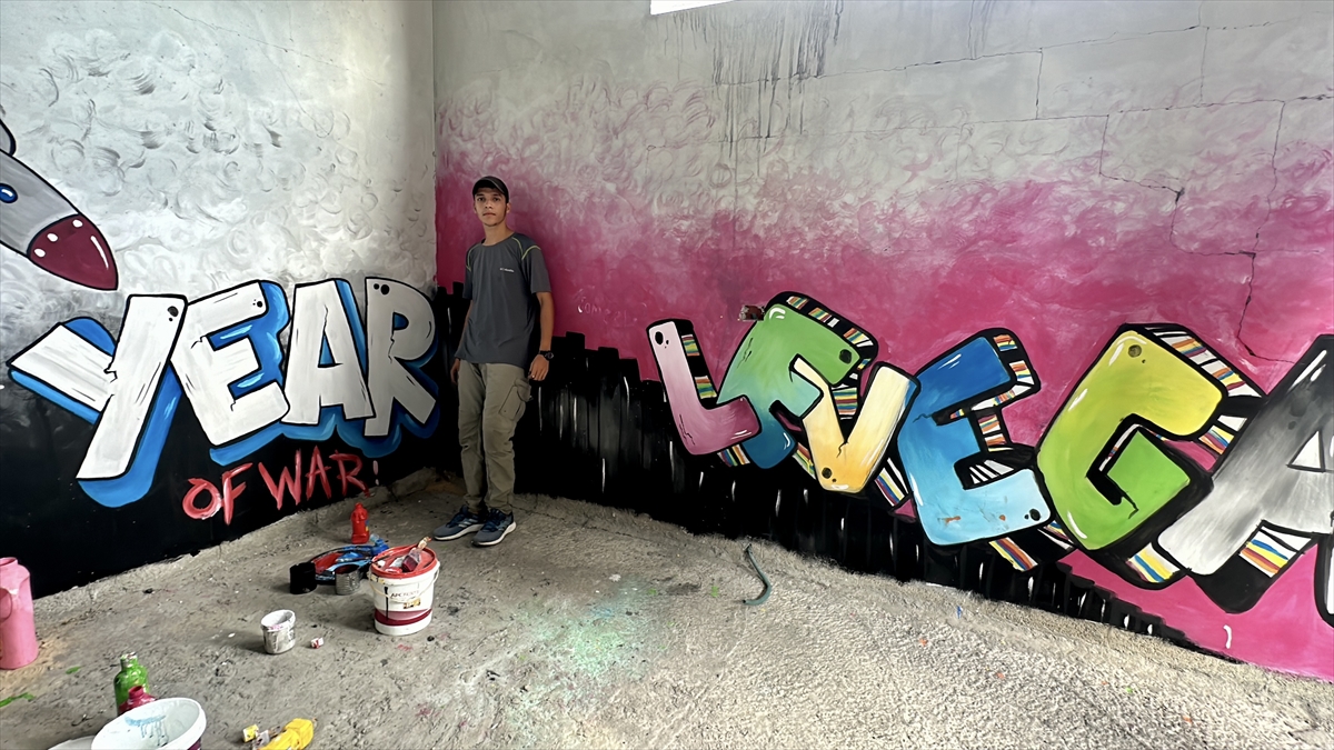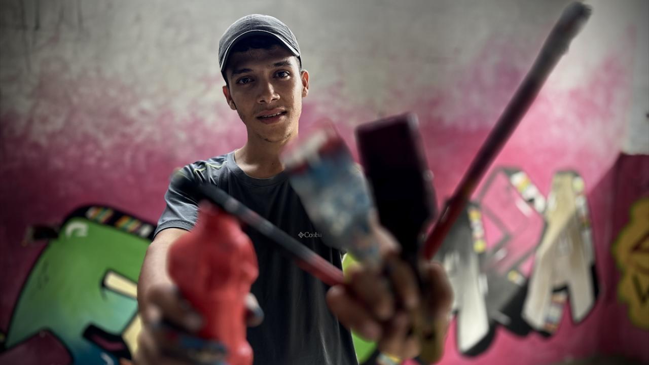 Filistinli ressam Cemil el-Baz, İsrail'in Gazze'ye yönelik saldırıları bir yılı geride bırakırken, saldırılarda bir bölümü yıkılan Nasirat Mülteci Kampı'ndaki evinin duvarlarına saldırıları anlatan çizimler yapıyor.