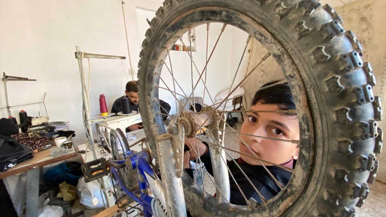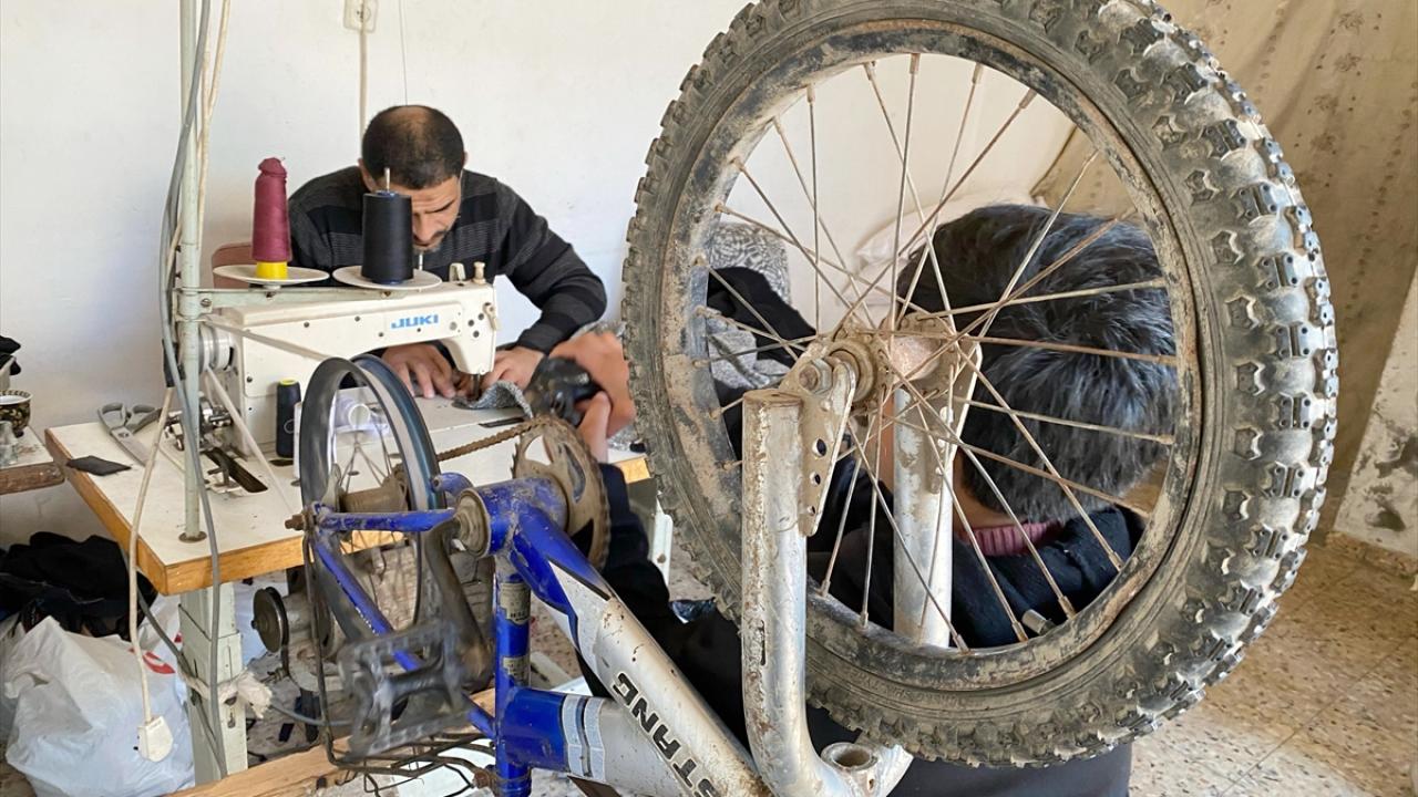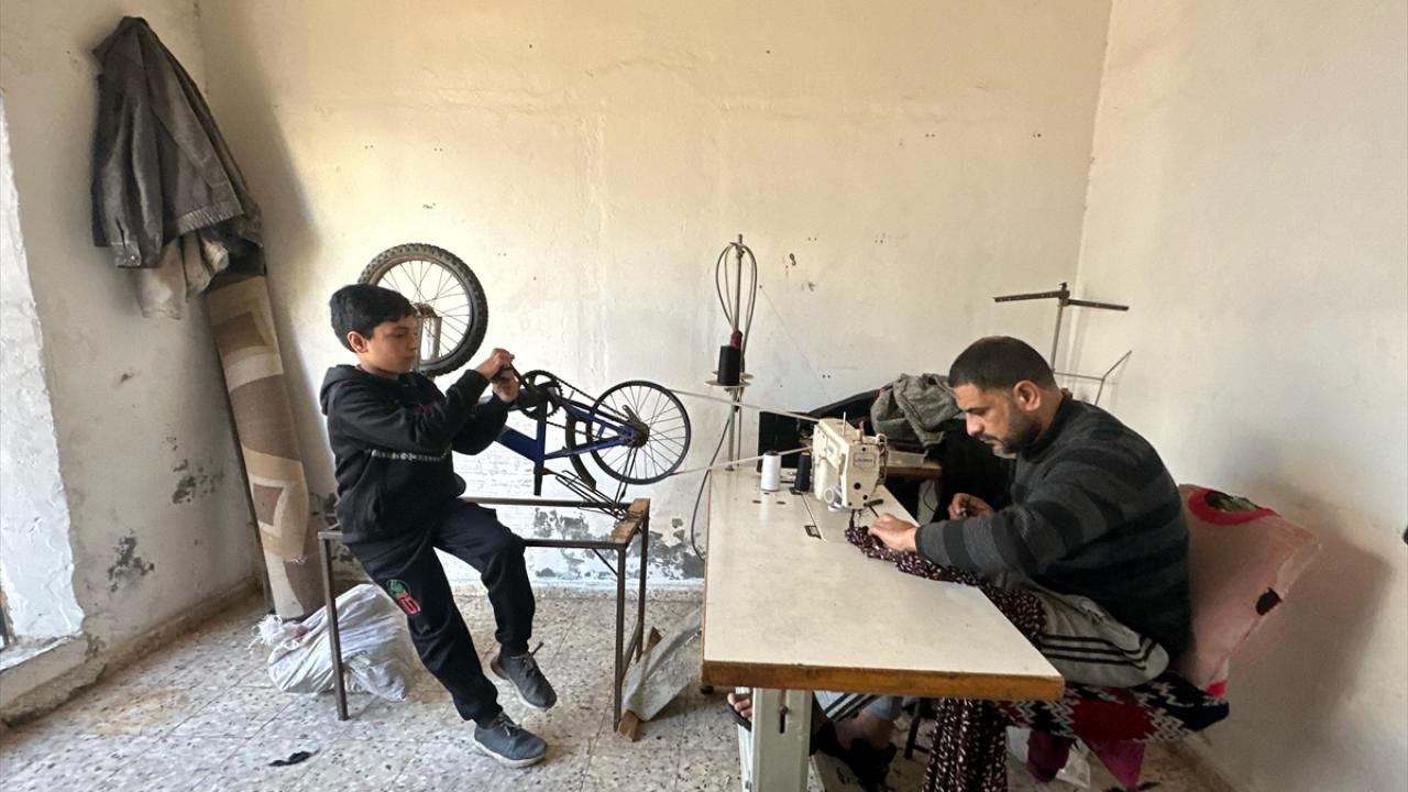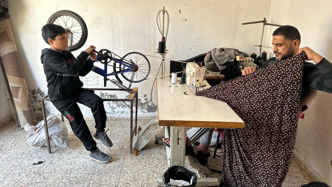 Kıyafet fiyatlarının artması, havaların soğuması ve giyecek ihtiyaçlarında ciddi artış nedeniyle Gazzeli terzi El Atıf elektriksiz çalıştıramadığı dikiş makinesine bisikletli çözüm buldu.