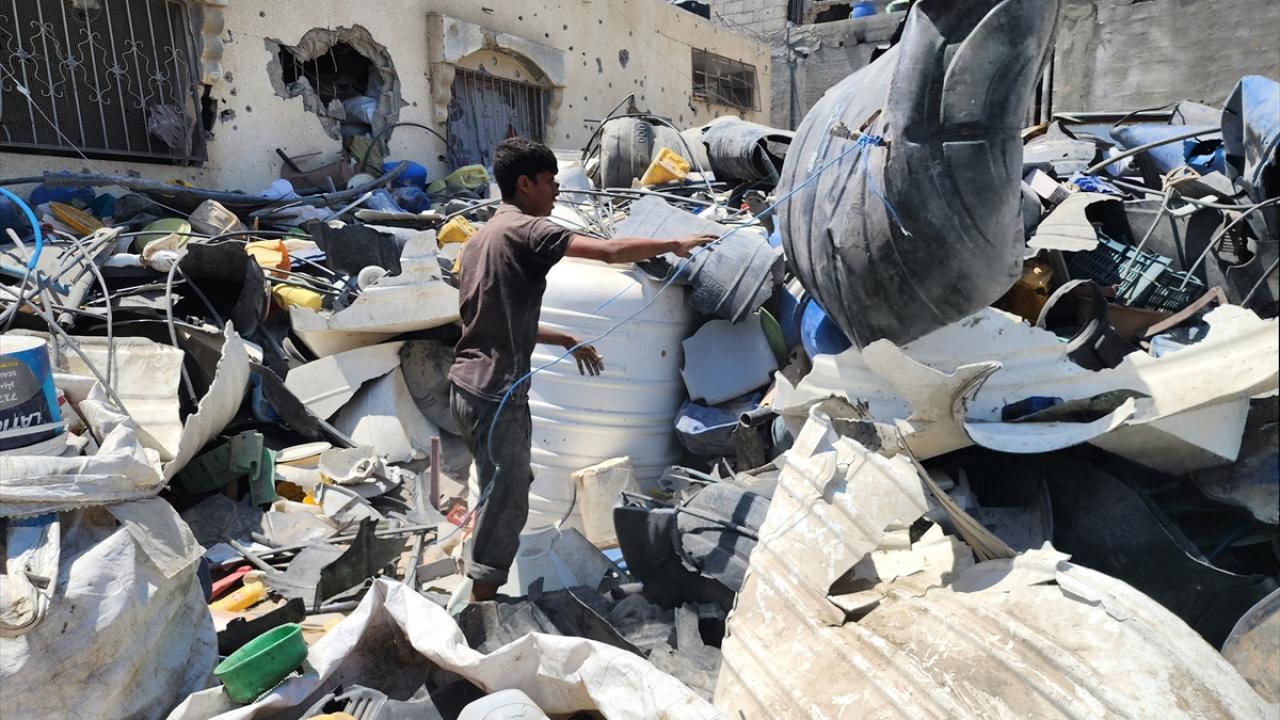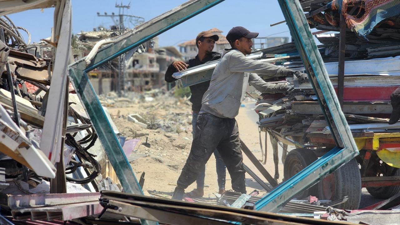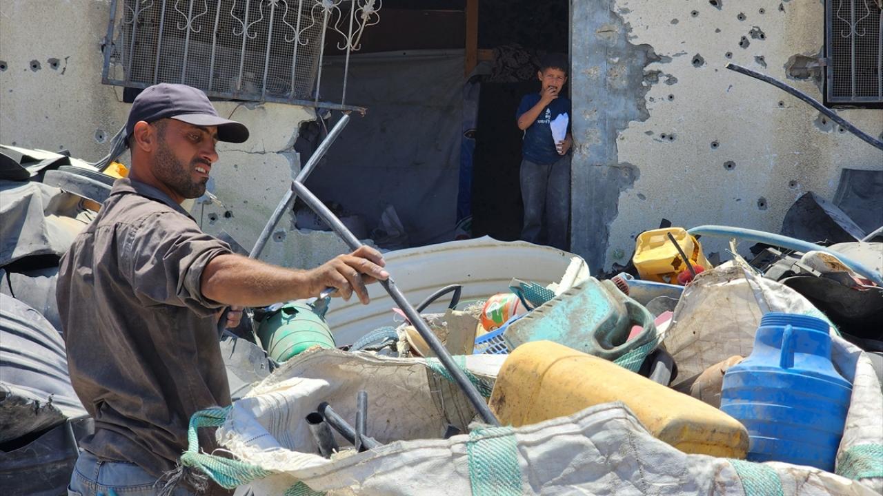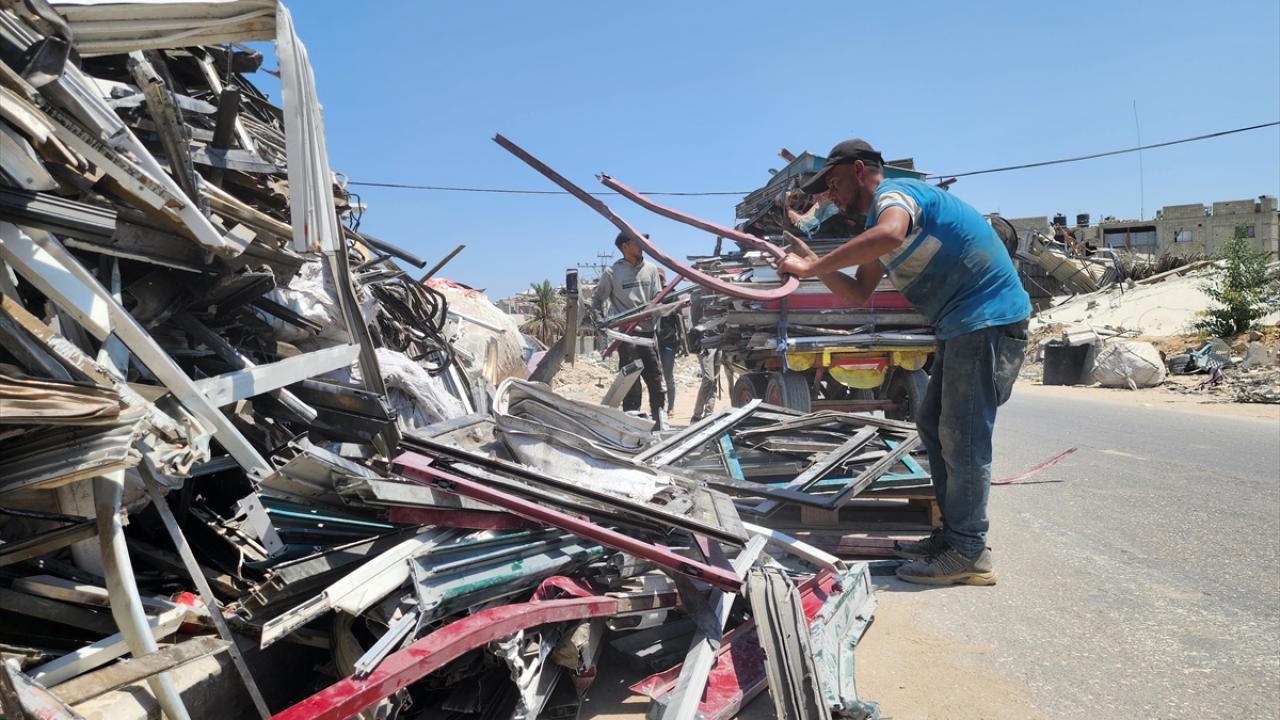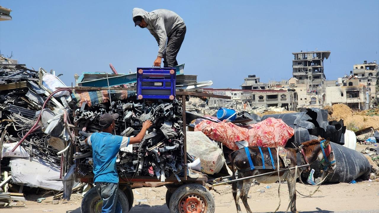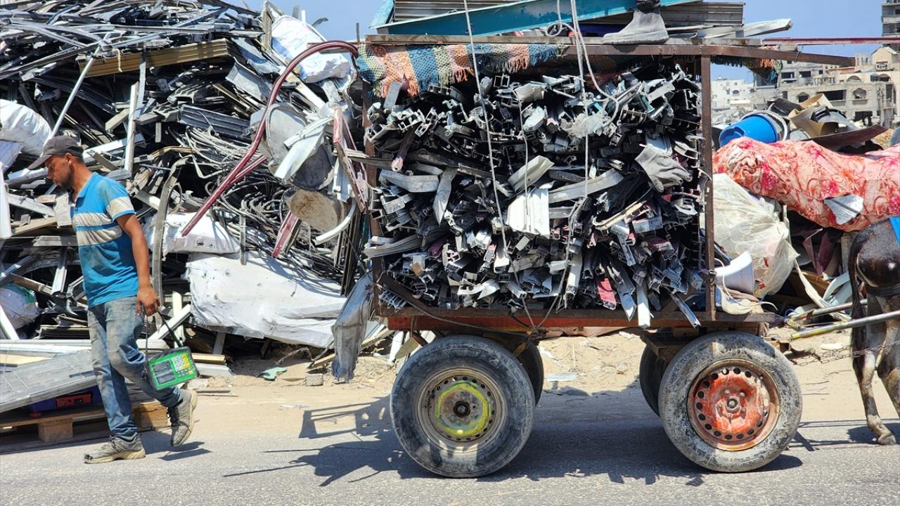 Gazze`nin güneyindeki Han Yunus`taki Filistinliler, İsrail saldırılarında yıkılan veya hasar gören evlerden topladıkları hurdaları geri dönüştürerek satıyor.