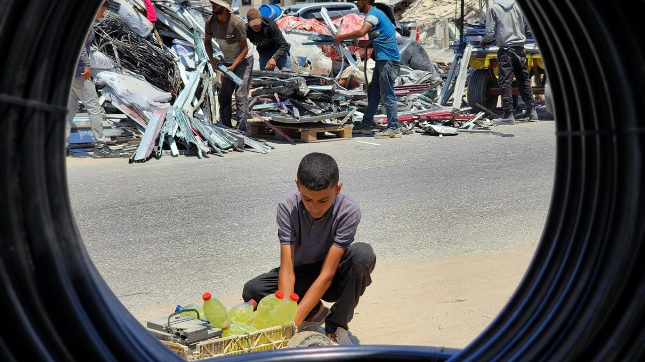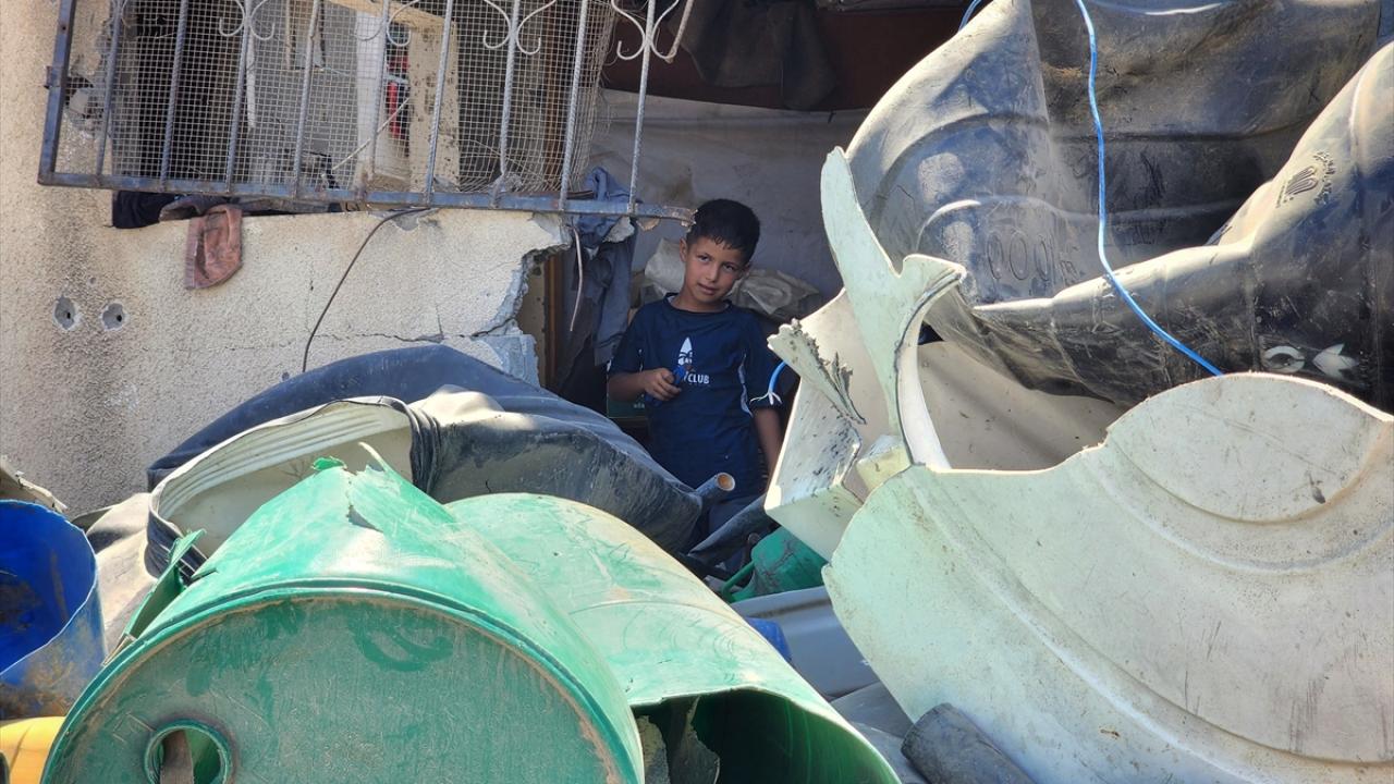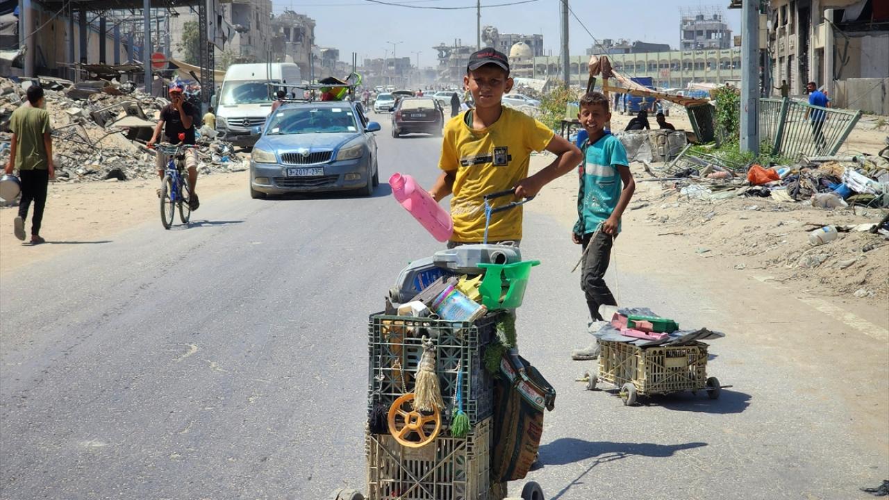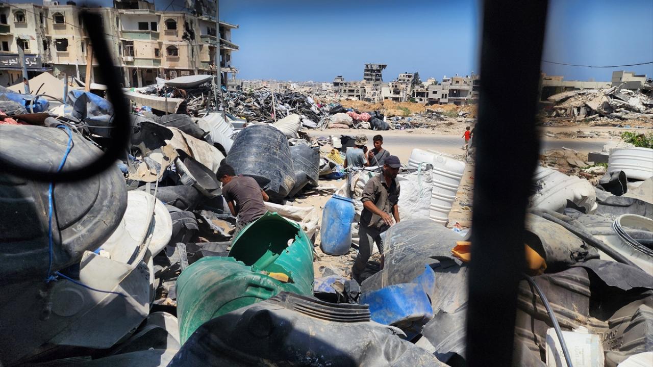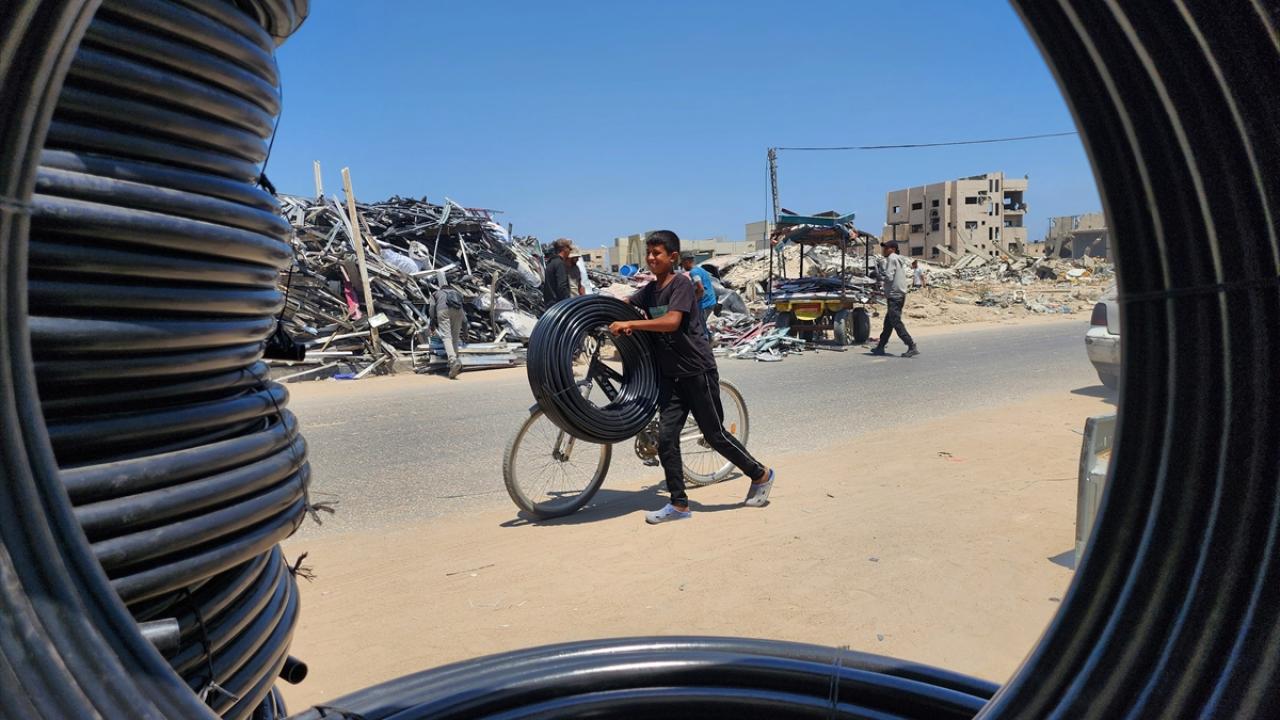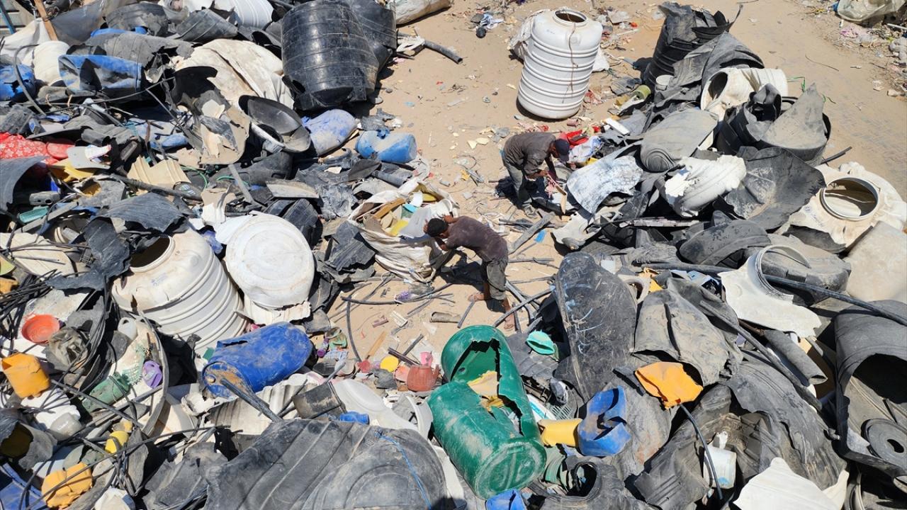 Gazze`nin güneyindeki Han Yunus`taki Filistinliler, İsrail saldırılarında yıkılan veya hasar gören evlerden topladıkları hurdaları geri dönüştürerek satıyor.