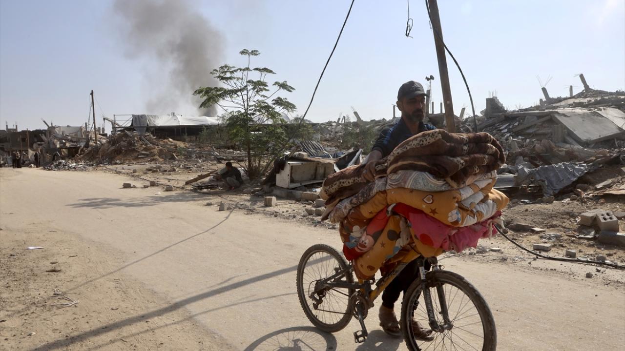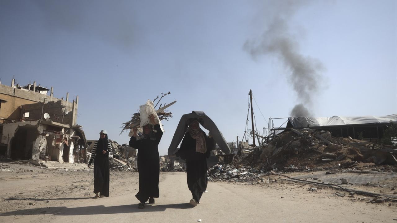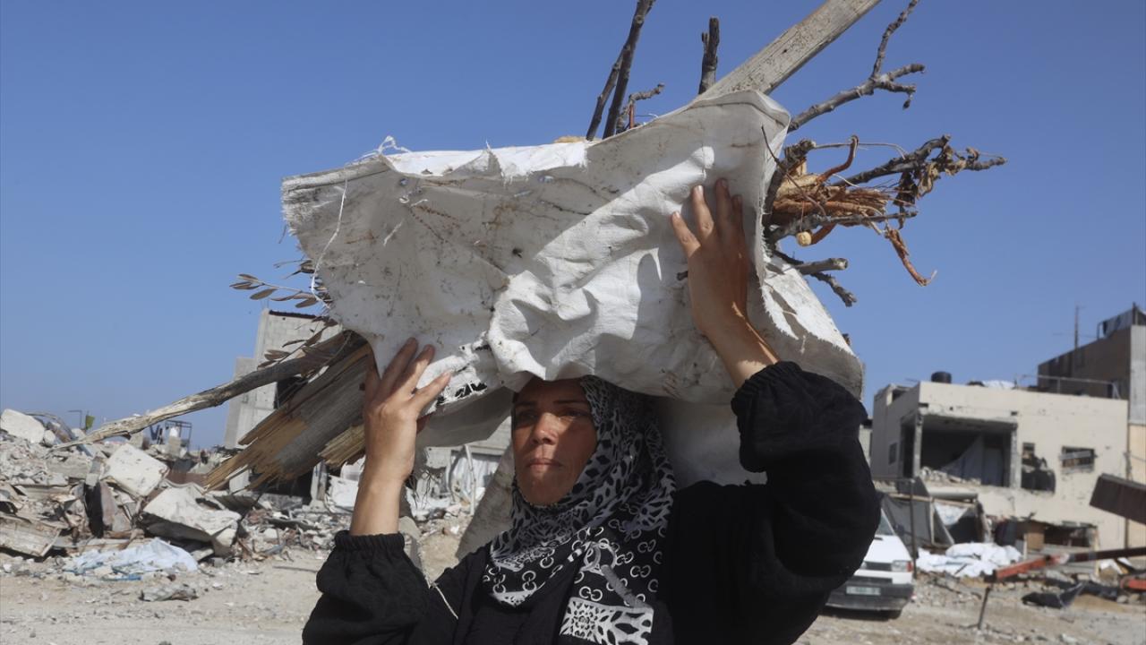 Filistinli aileler, İsrail saldırılarında yıkılan evlerinin enkazındaki topladıkları eşyaları yanlarına alıp bölgeden ayrıldı.