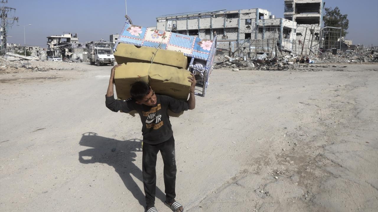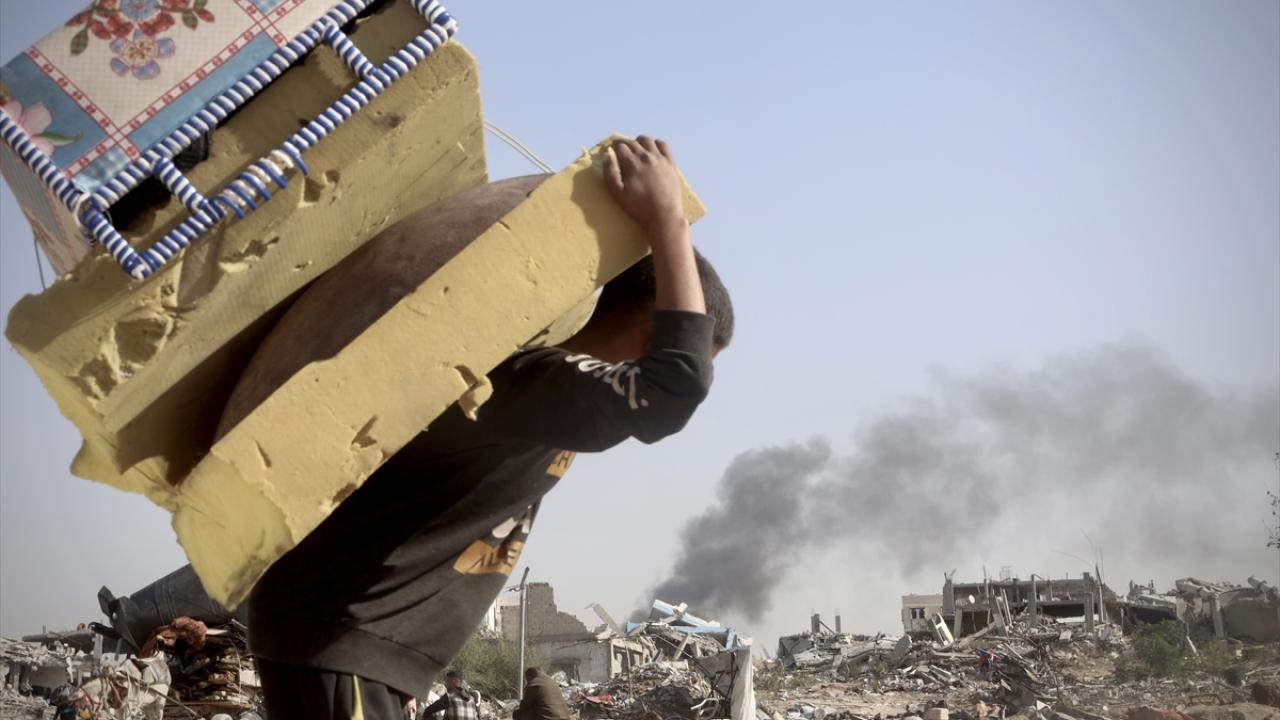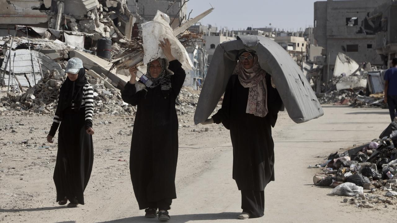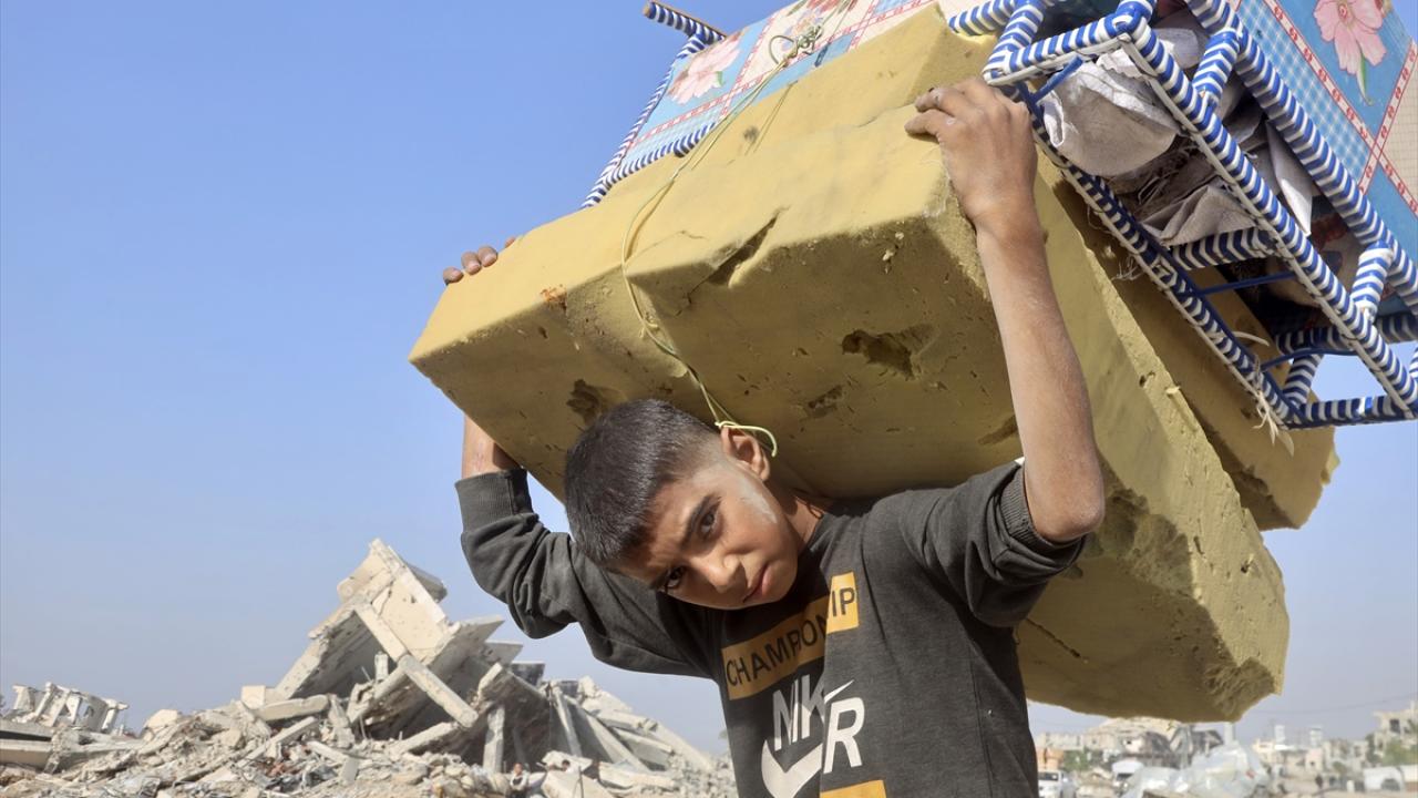 Filistinli aileler, İsrail saldırılarında yıkılan evlerinin enkazındaki topladıkları eşyaları yanlarına alıp bölgeden ayrıldı.