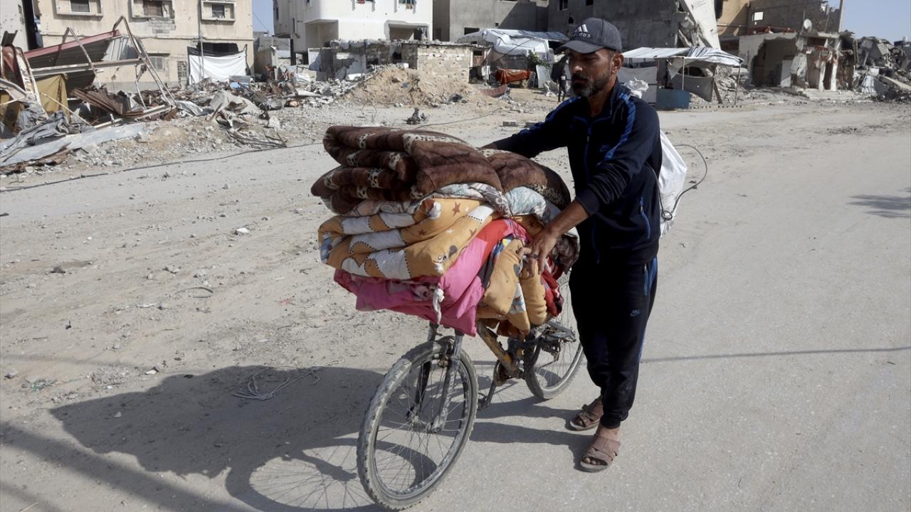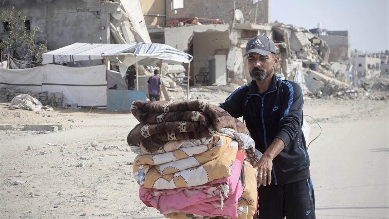 Gazze'de Filistinliler, güvenlik tehlikesine rağmen soğuk hava koşullarına karşı koruyacak battaniye ve giysi bulabilmek için Han Yunus'taki evlerine döndü.