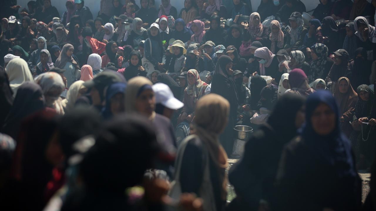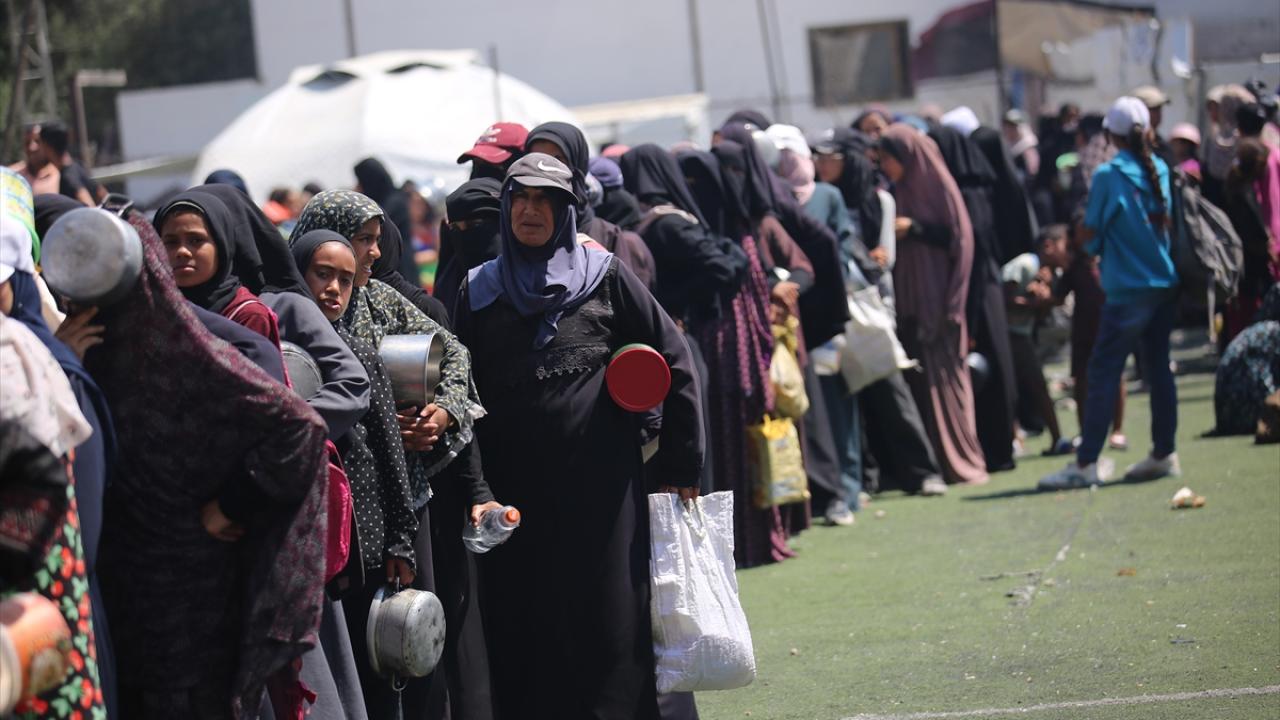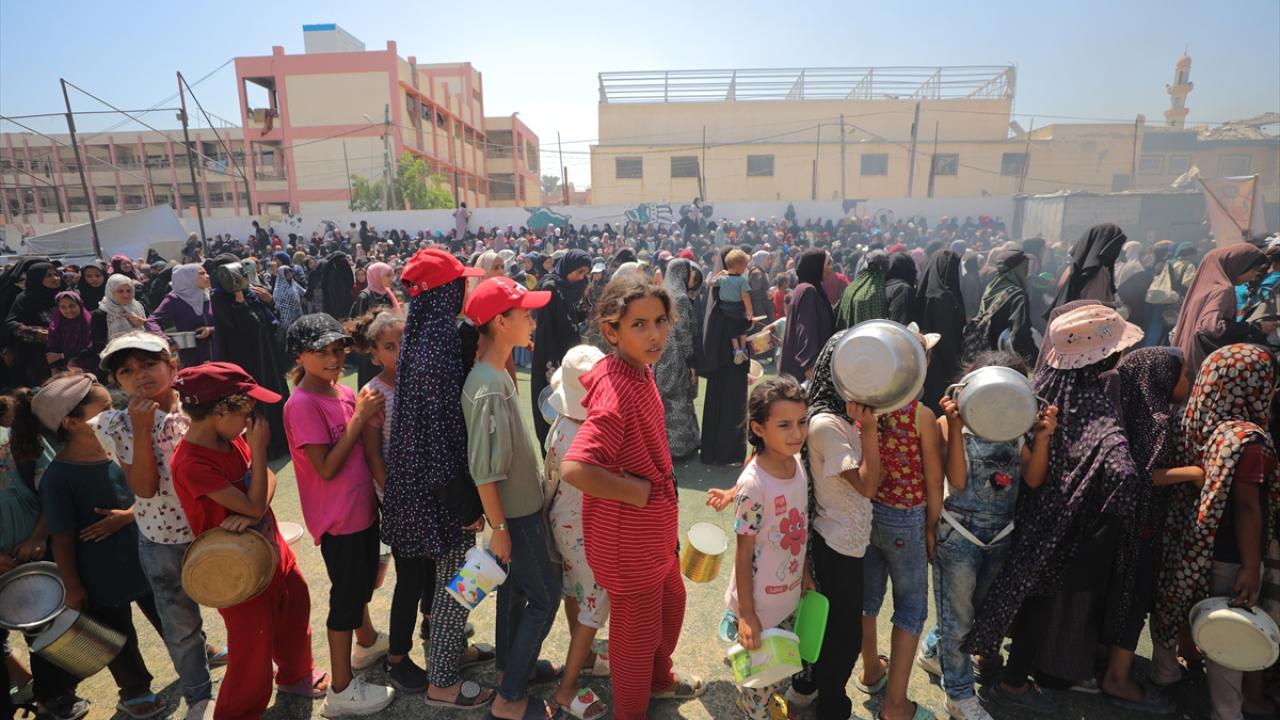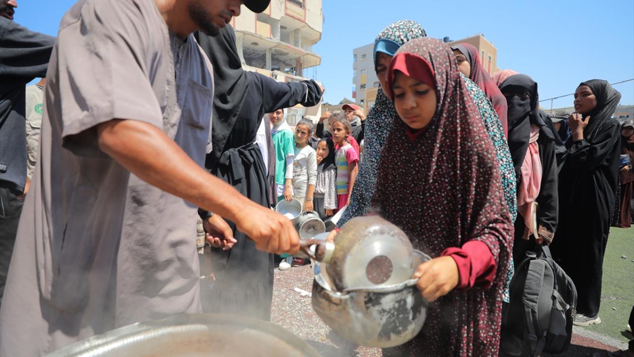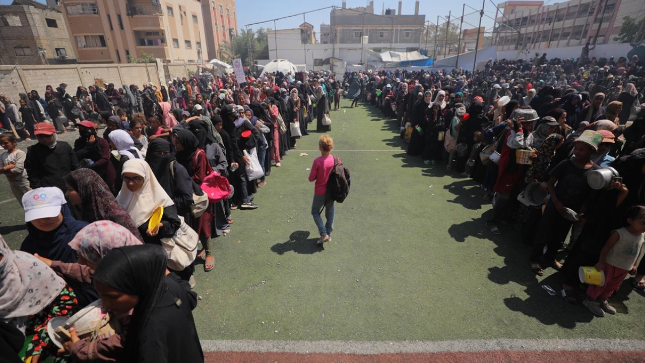 Açlıkla mücadele eden yüzlerce Filistinli, bir tencere yemek alabilmek için kavurucu sıcağa rağmen saatlerce kuyrukta bekliyor.