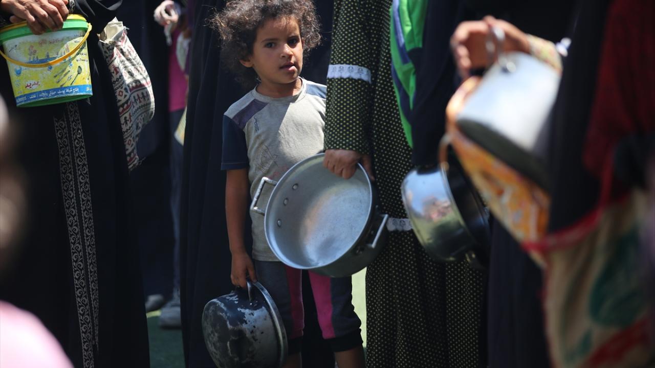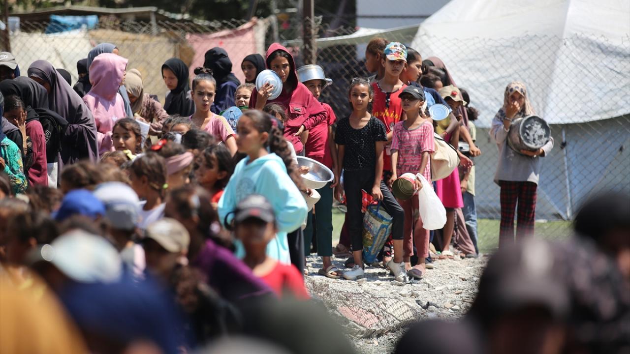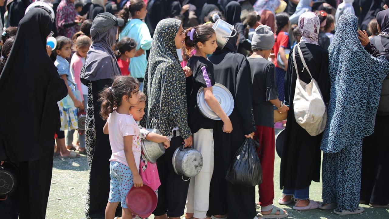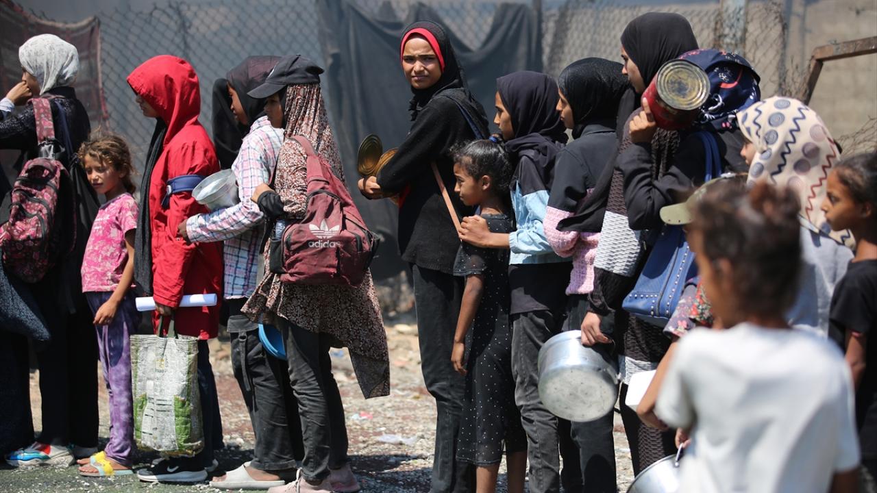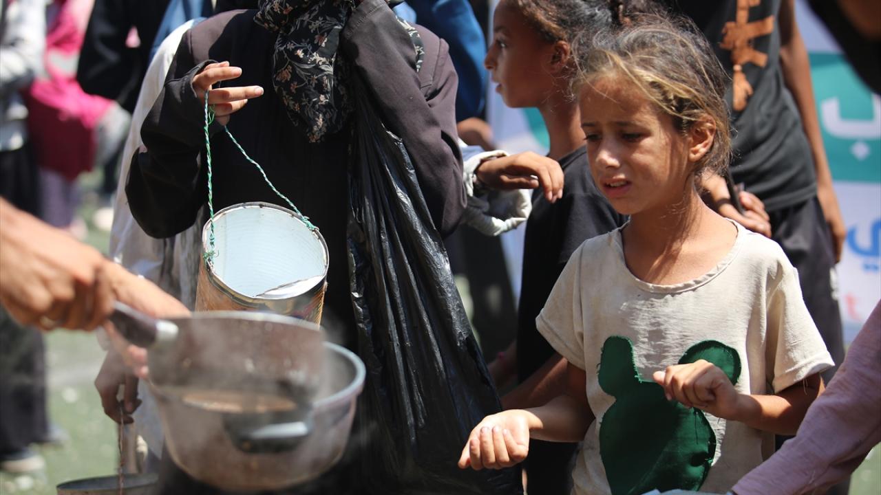 Açlıkla mücadele eden yüzlerce Filistinli, bir tencere yemek alabilmek için kavurucu sıcağa rağmen saatlerce kuyrukta bekliyor.