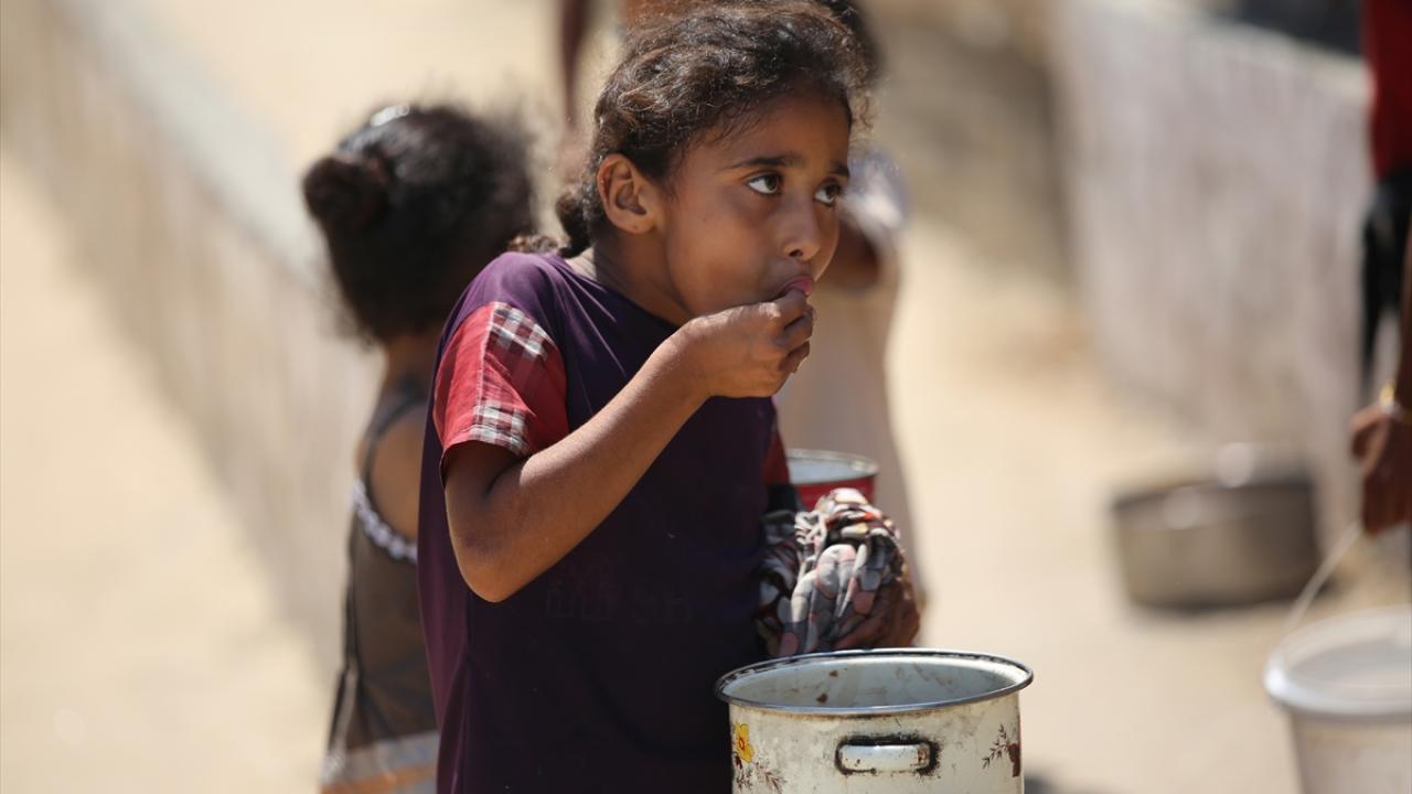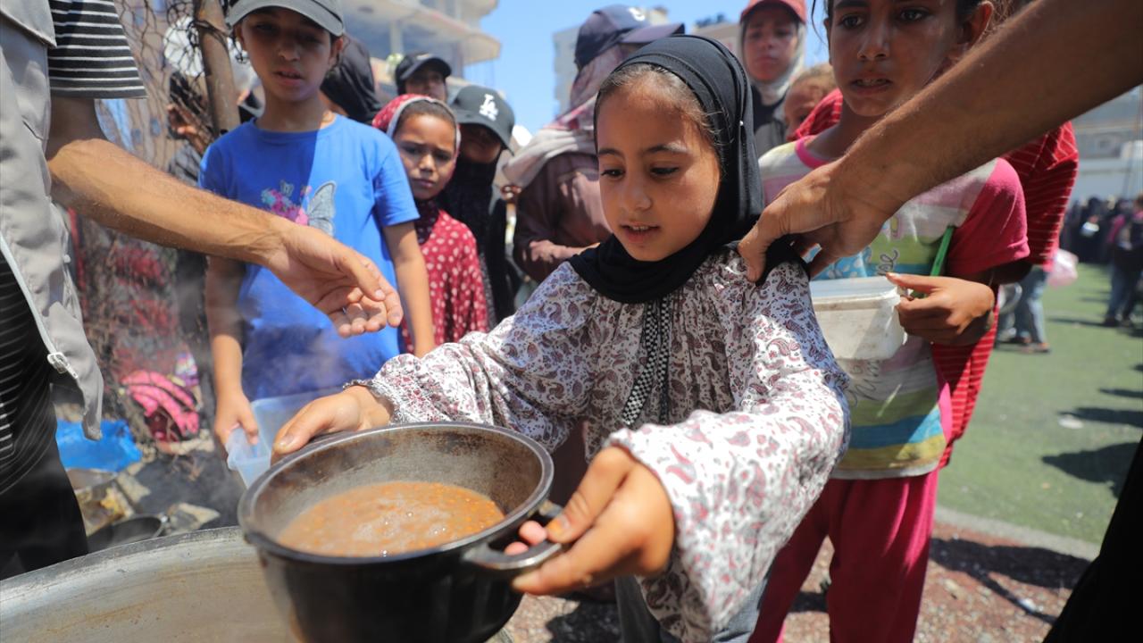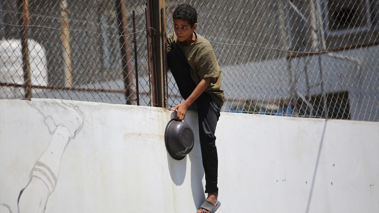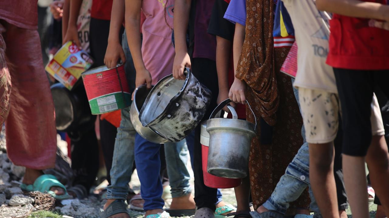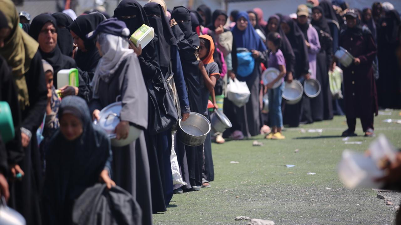 Açlıkla mücadele eden yüzlerce Filistinli, bir tencere yemek alabilmek için kavurucu sıcağa rağmen saatlerce kuyrukta bekliyor.
