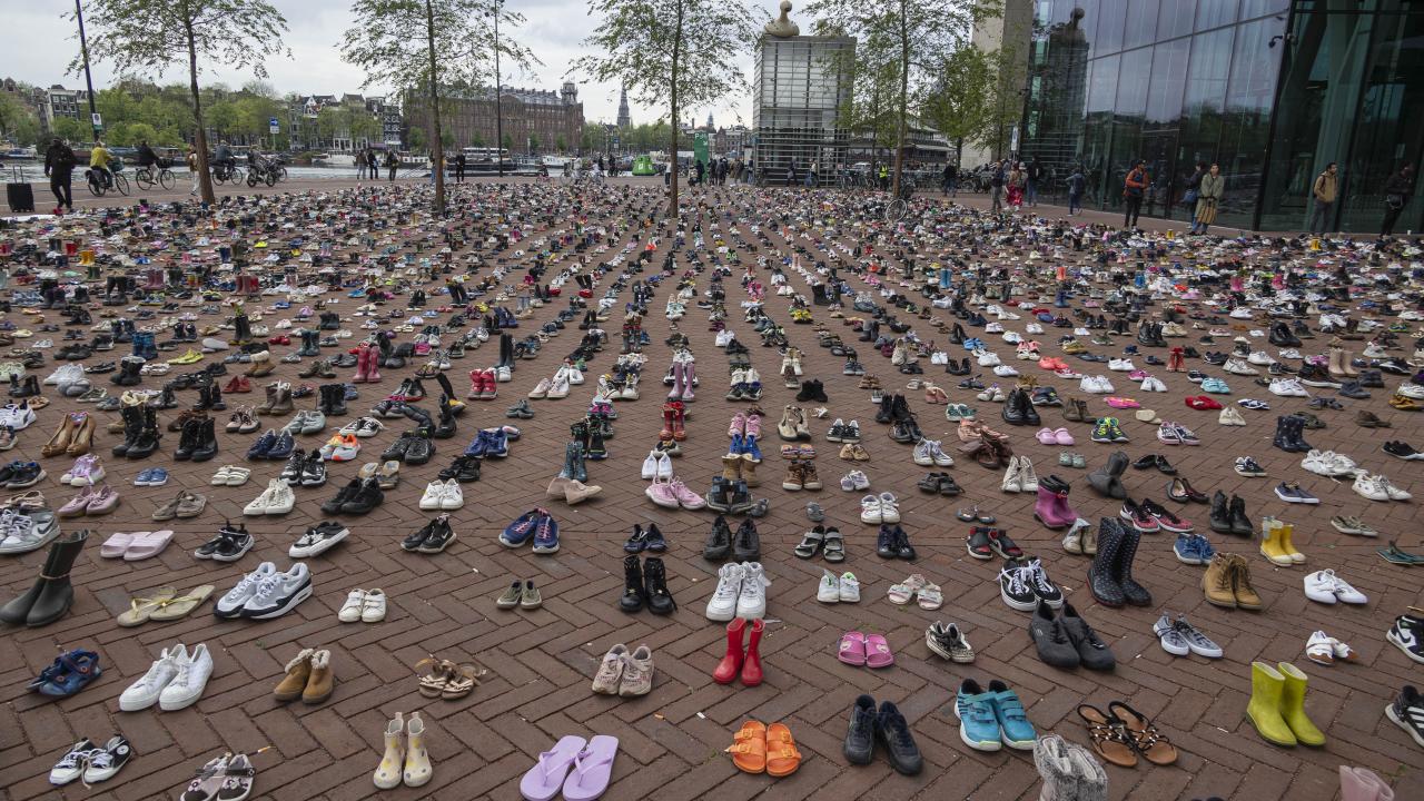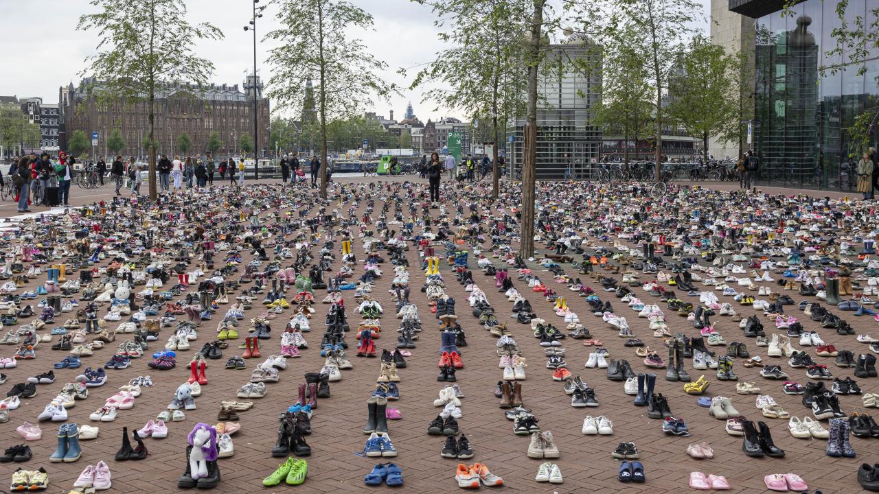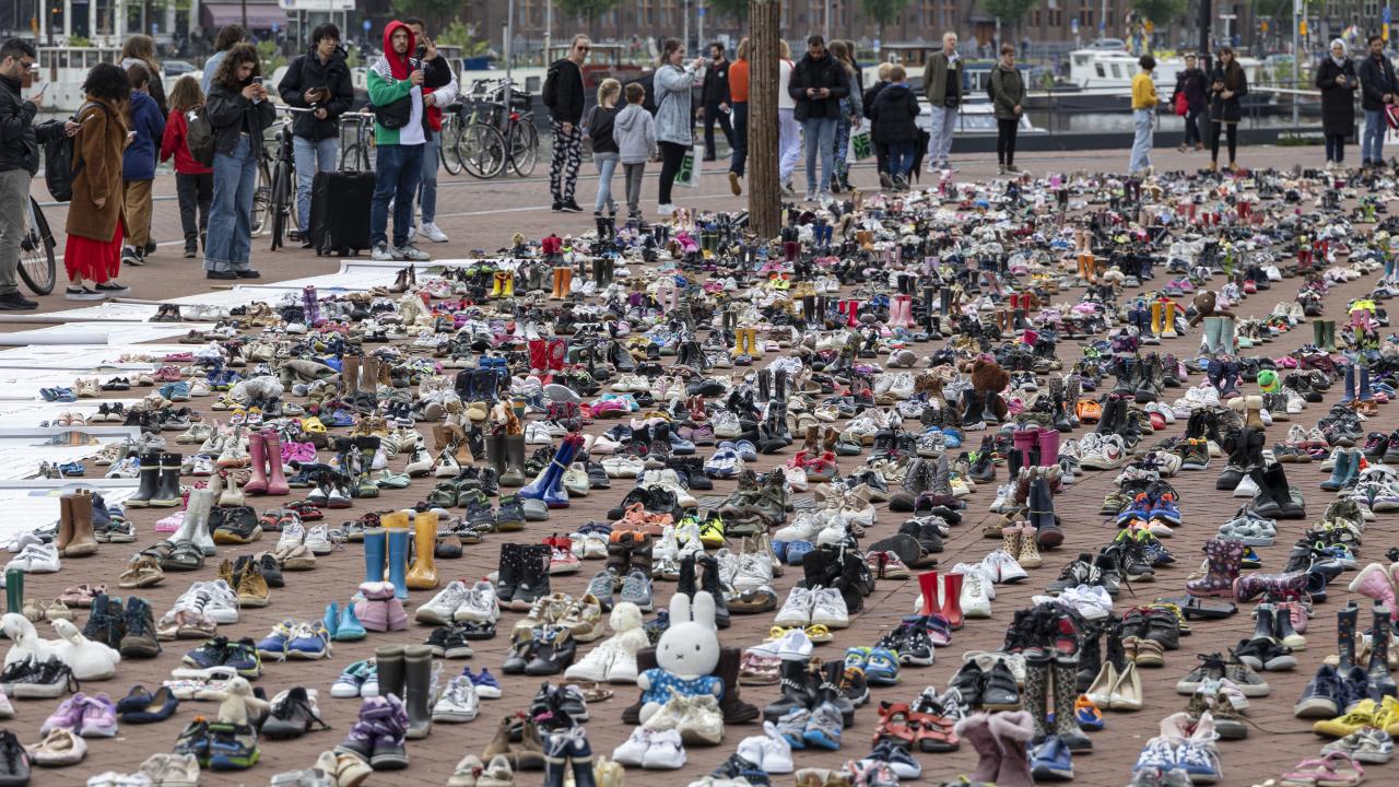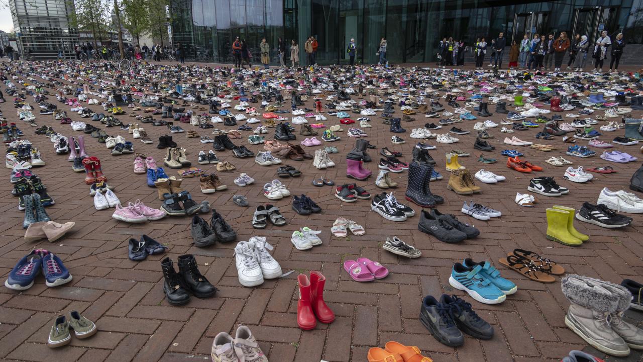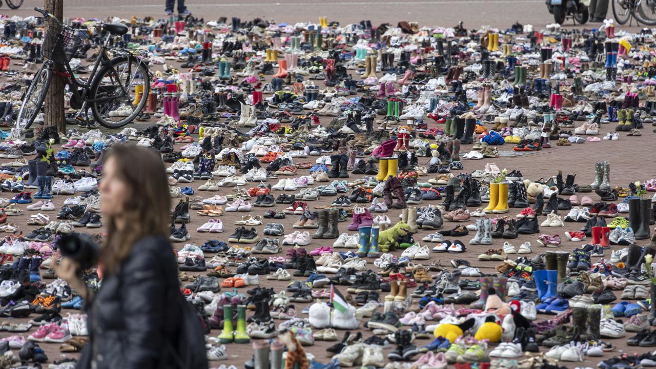 Hollanda'nın başkenti Amsterdam'da ''Plant an Olive tree for Palestine'' tarafından düzenlenen gösteride vatandaşlar tarafından İsrail'in Gazze'ye yönelik saldırılarında öldürülen Filistinlilere ve çocuklara dikkat çekmek için yaklaşık 15.000 çift ayakkabı bırakıldı.