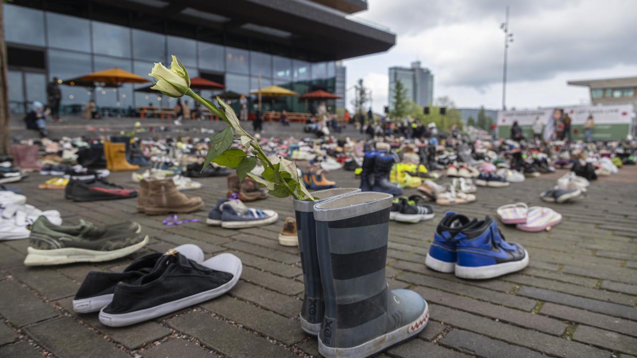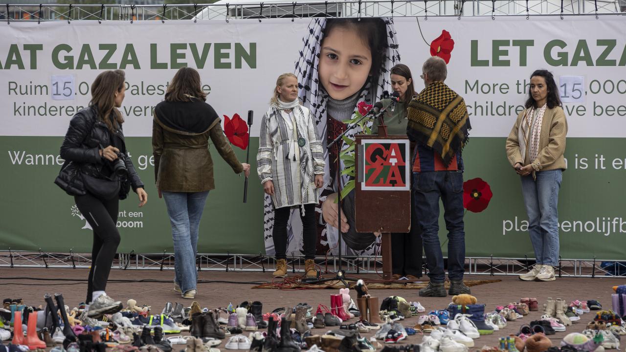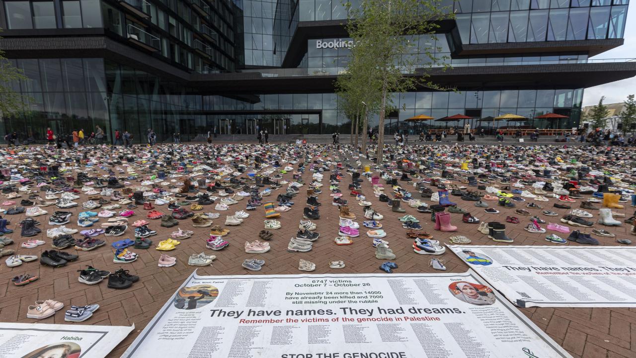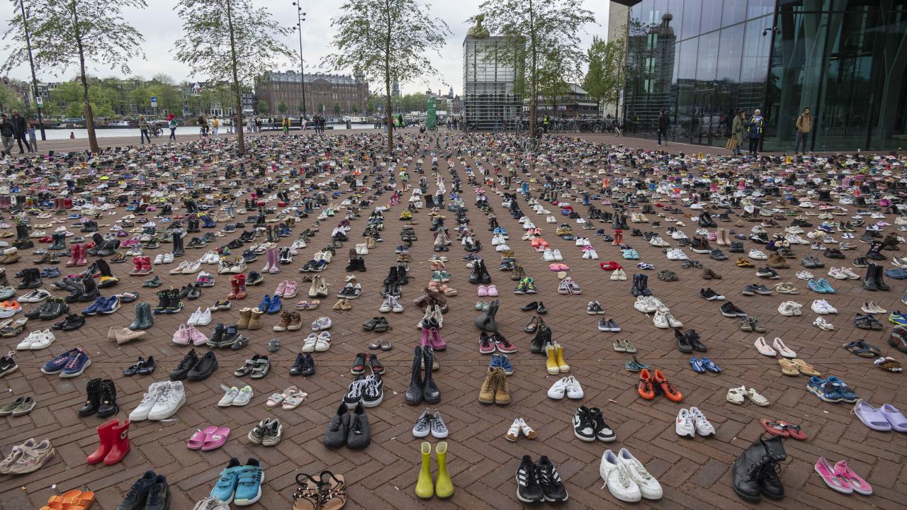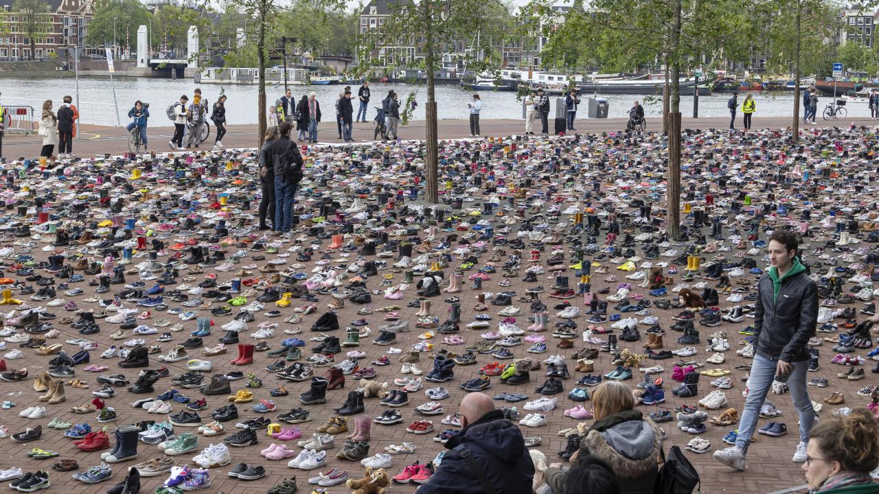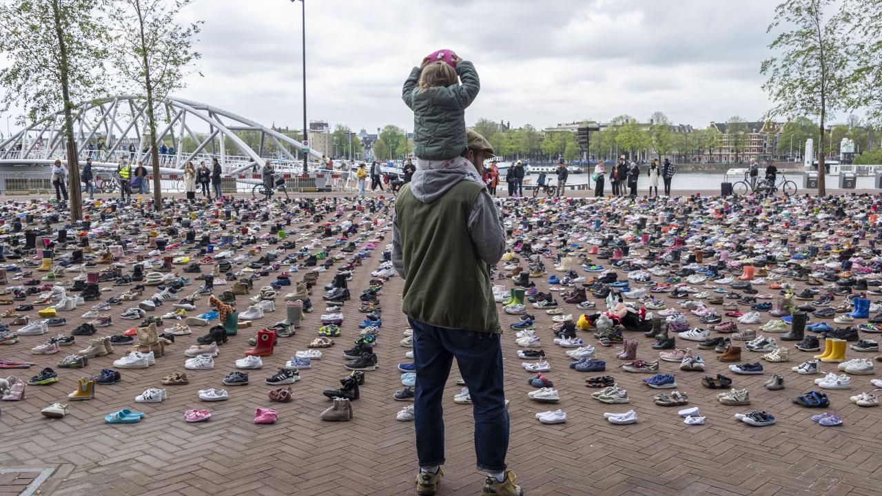 Hollanda'nın başkenti Amsterdam'da ''Plant an Olive tree for Palestine'' tarafından düzenlenen gösteride vatandaşlar tarafından İsrail'in Gazze'ye yönelik saldırılarında öldürülen Filistinlilere ve çocuklara dikkat çekmek için yaklaşık 15.000 çift ayakkabı bırakıldı.