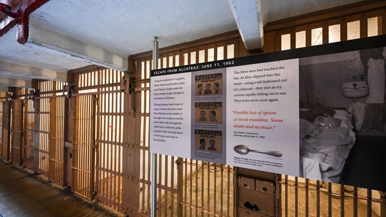 11 Haziran 1962`de yüksek güvenlikli federal Alcatraz hapishanesinden kaçan John ve Clarence Anglin kardeşlerin hücreleri ziyaretçilerin ilgisini çekiyor.