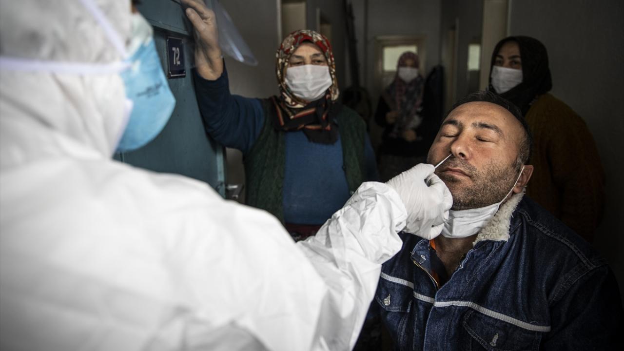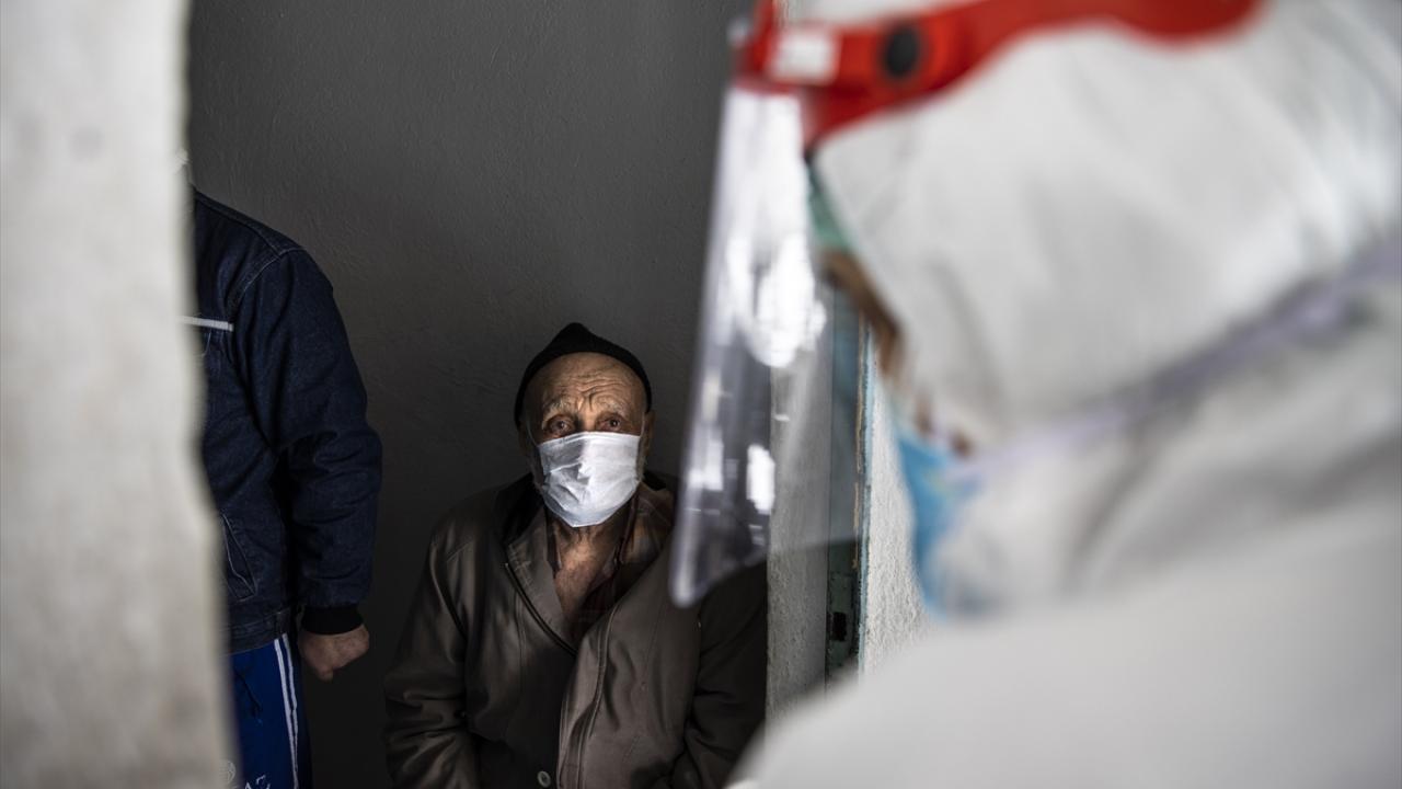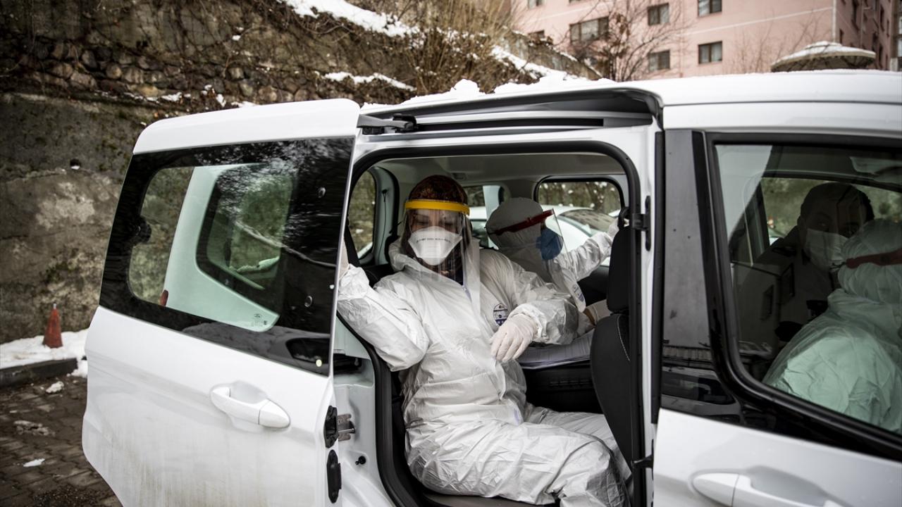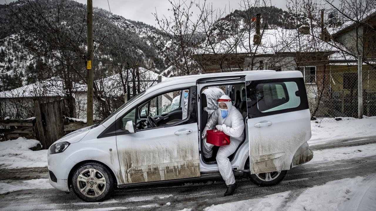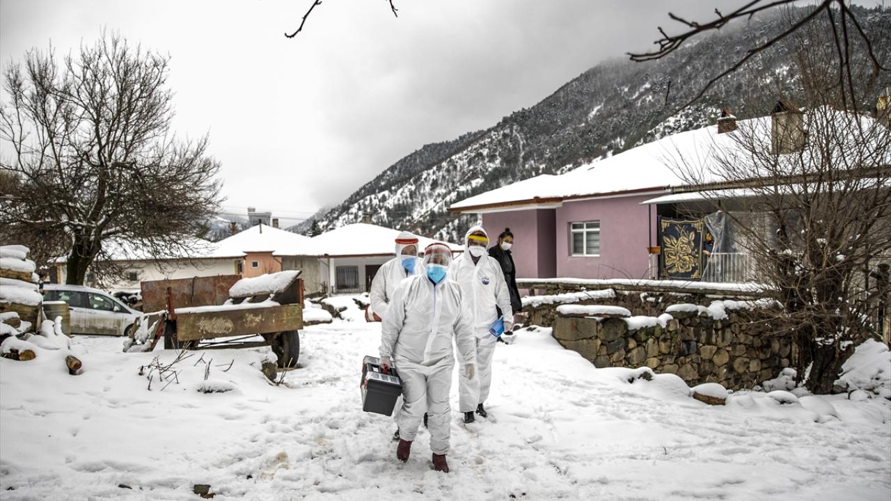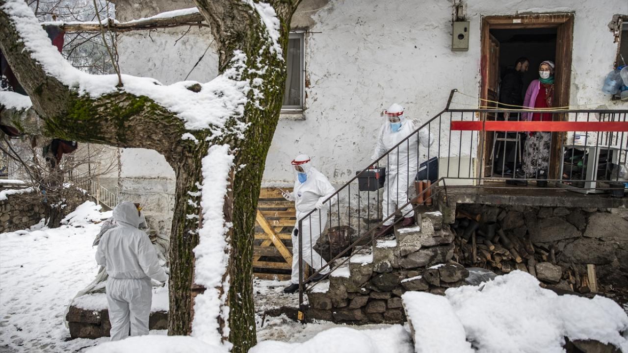 Olumsuz hava koşullarına rağmen karla kaplı yolları aşarak, Covid-19 hastalarının ve temaslı kişilerin evlerine teker teker giden ekipler, test ve kontrolleri yapıyor, uyarılarda bulunuyor.