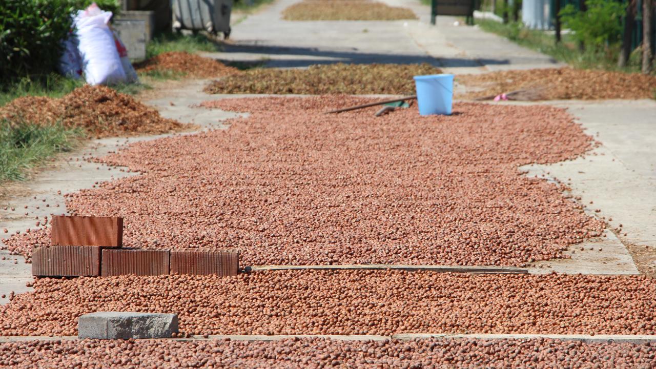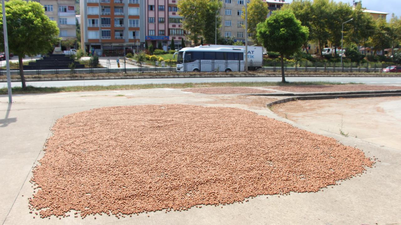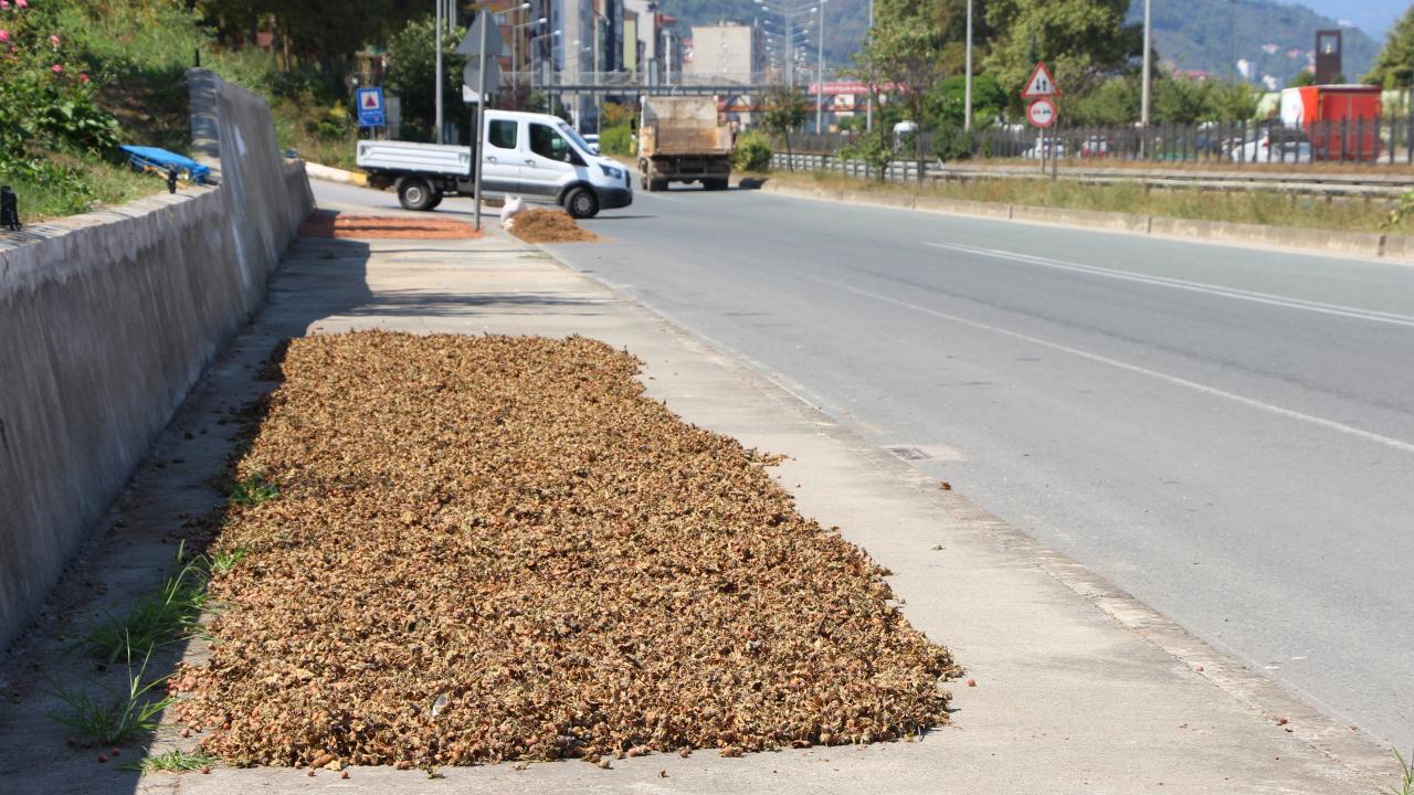 Trabzon`un denize kıyısı olan ilçelerinden Arsin`de vatandaşlar topladıkları fındıkları kurutmak için evlerine yakın olarak belirledikleri yol kenarlarında bulunan kaldırımlara sererek kurutuyor.