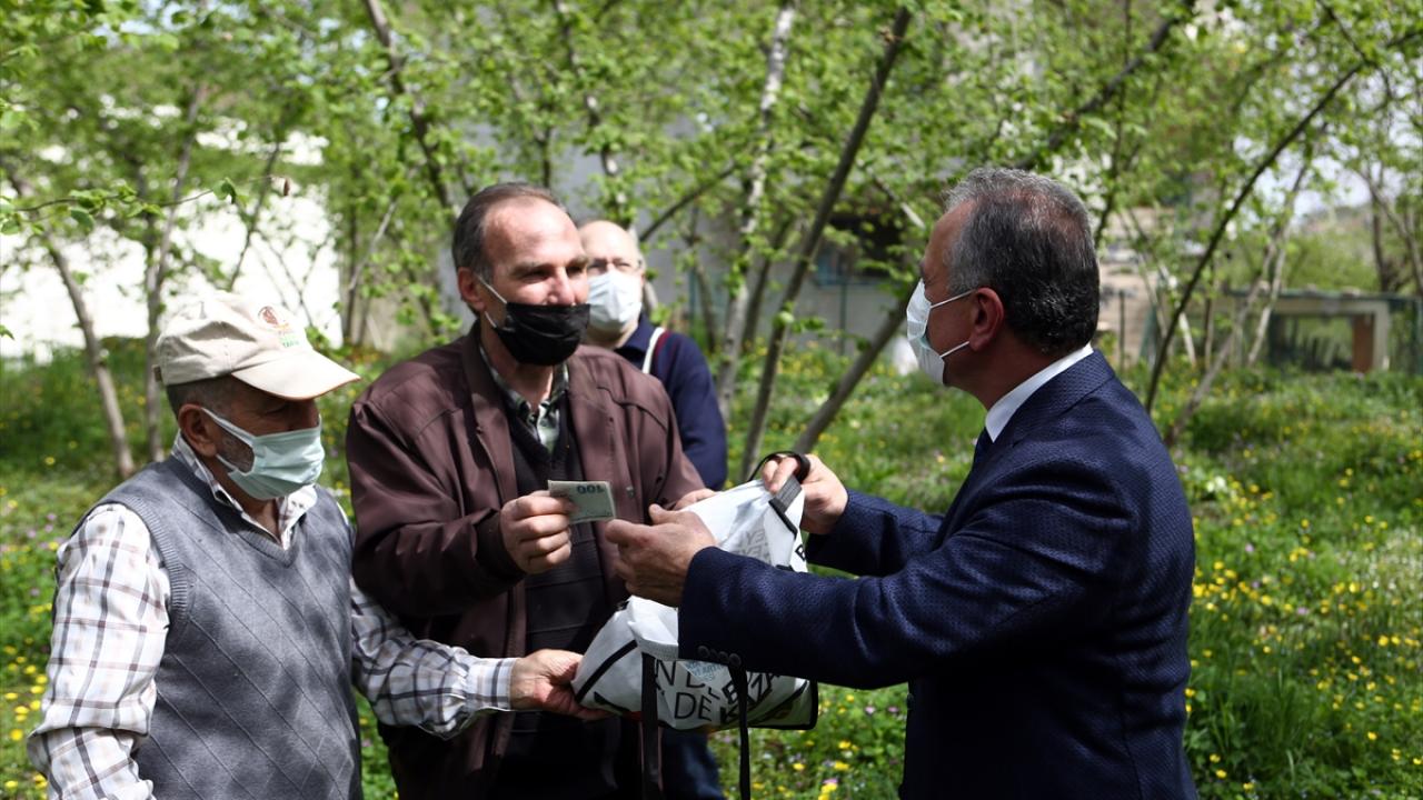 Ergan, kozalak akarlarını elle toplayıp kendisine teslim eden Ustaömeroğlu`na sembolik olarak 100 lira ödeme yaptı.