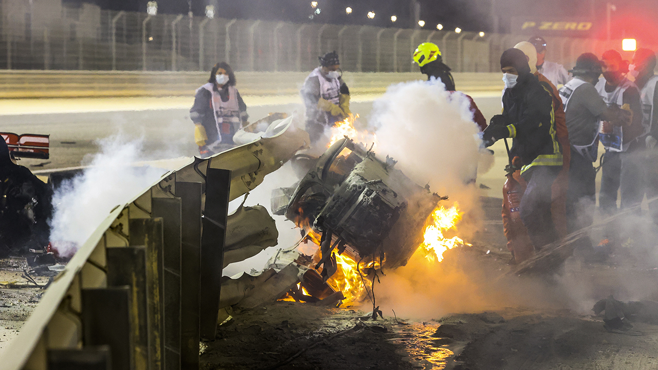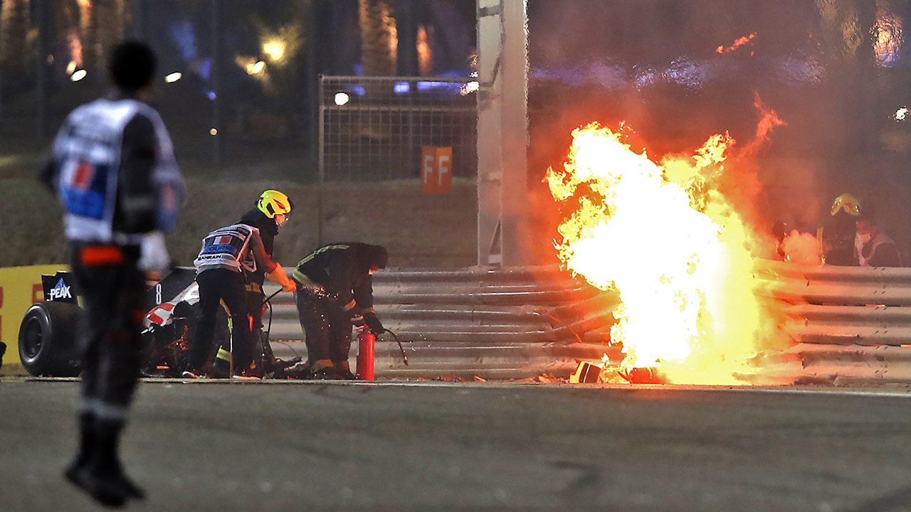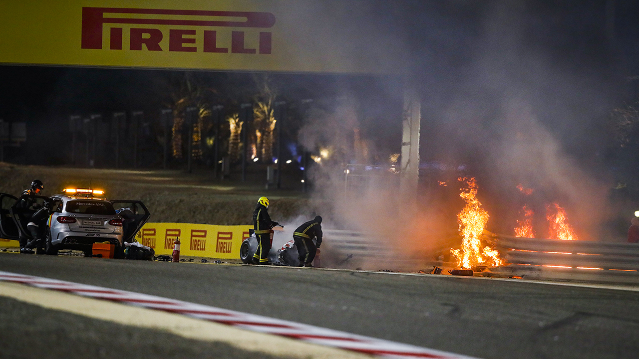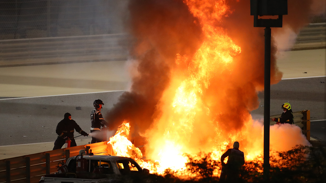 Formula 1 Dünya Şampiyonası'nın 15. yarışı Bahreyn Grand Prix'sinde yaşanan kazada Haas pilotu Romain Grosjean'ın aracı bariyerlere çarparak alev aldı. İkiye ayrılan otomobilden kendi başına çıkan 34 yaşındaki pilot, kazayı hafif yanıklarla atlattı.