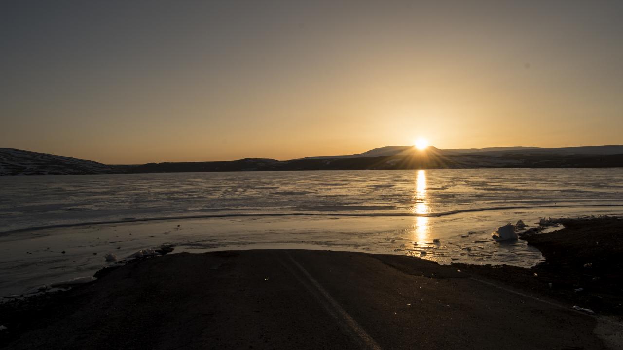 Kars'ta dondurucu soğukların etkisiyle yüzeyi buzla kaplanan Kars Barajı, gün batımındaki manzarasıyla ziyaretçilerini cezbediyor.