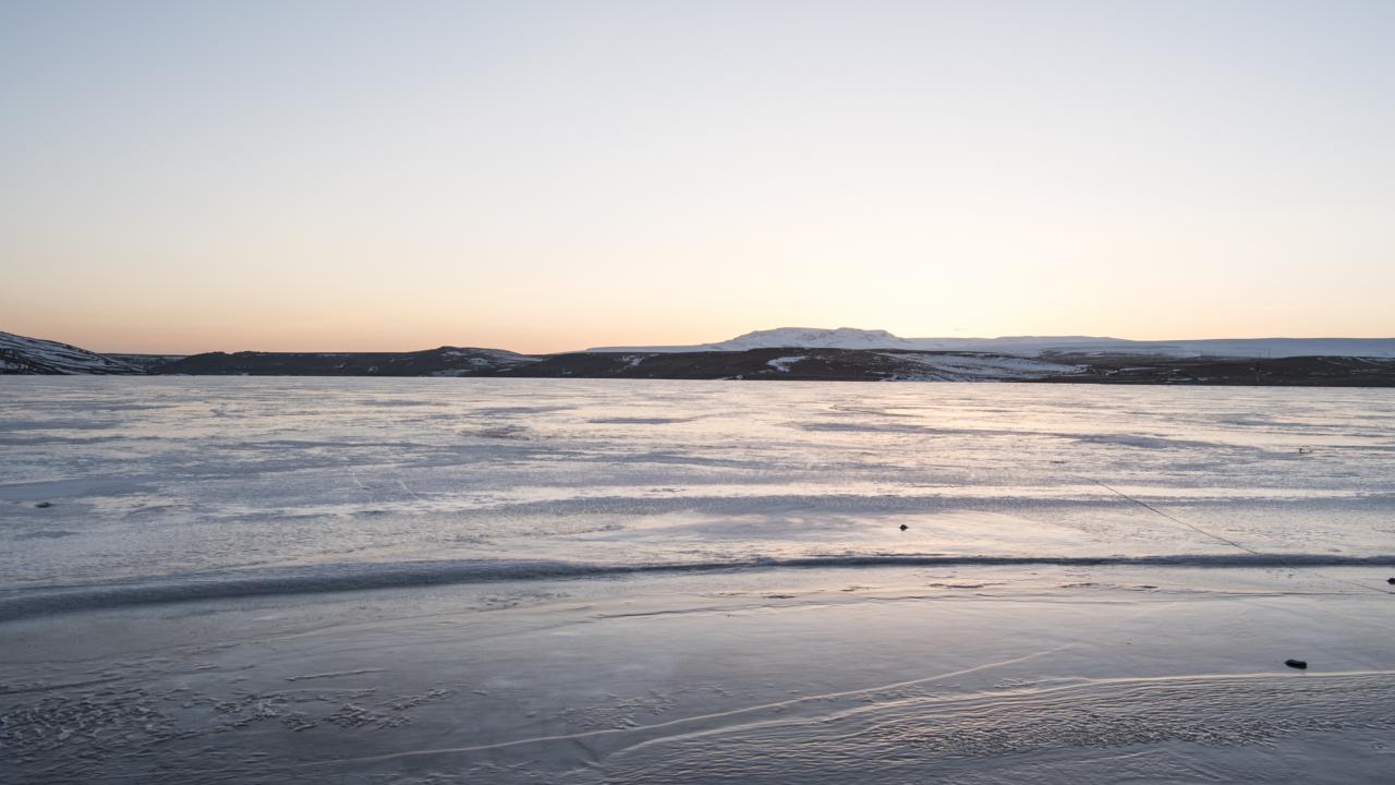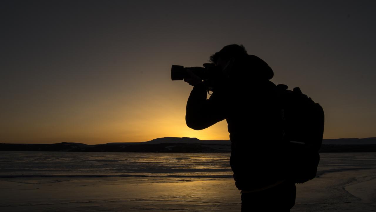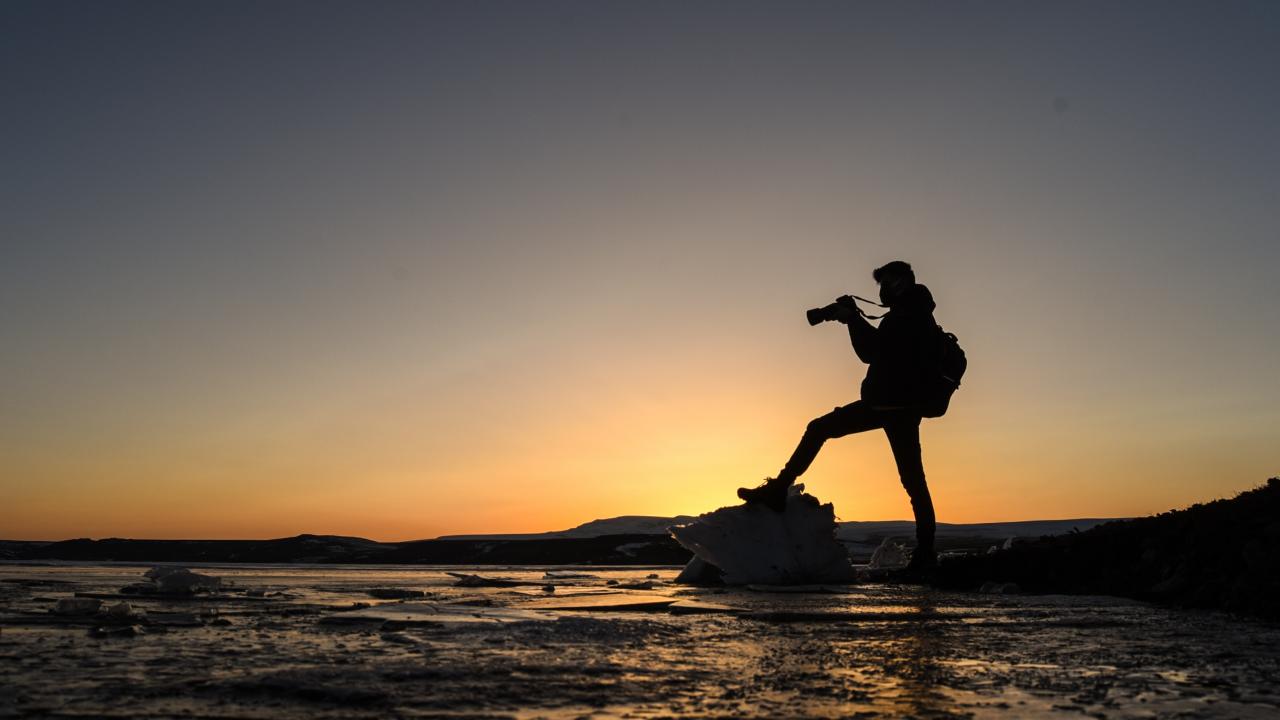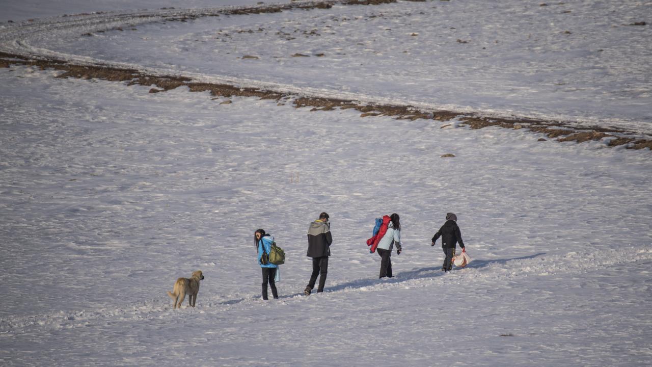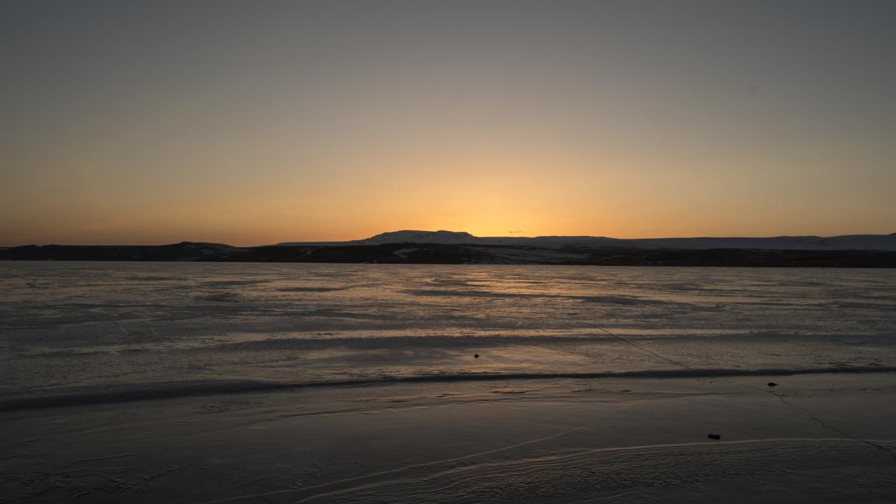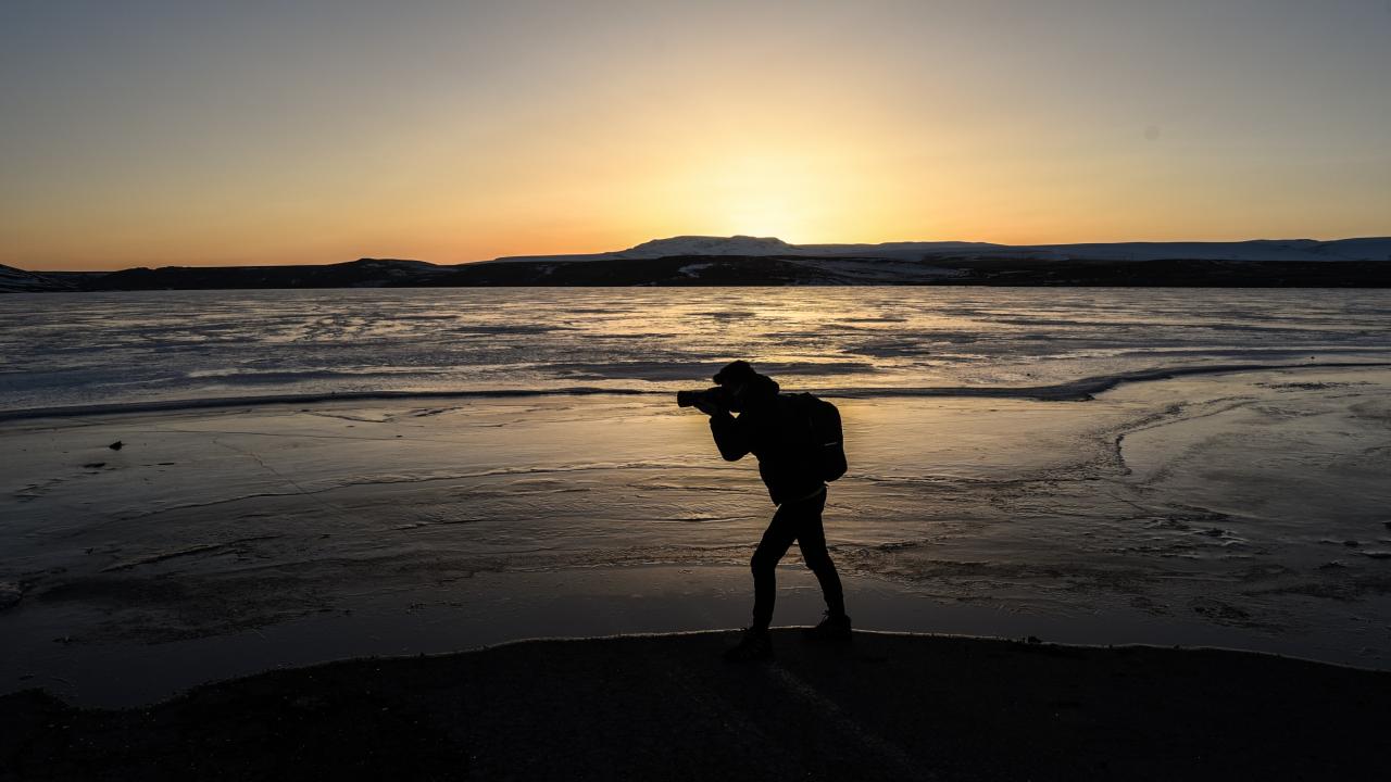 Gün batımı fotoğrafı çekmek için geldiğini belirten Dolapçı, "Havaların soğumasıyla gölün yüzeyi buzla kaplandı. Biz fotoğrafçılar da bu fırsatı değerlendirerek sık sık gelip burada fotoğraf çalışması yapıyoruz" dedi.