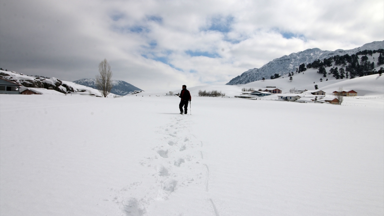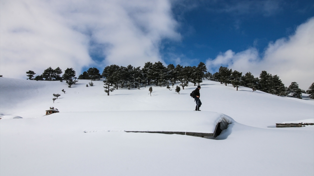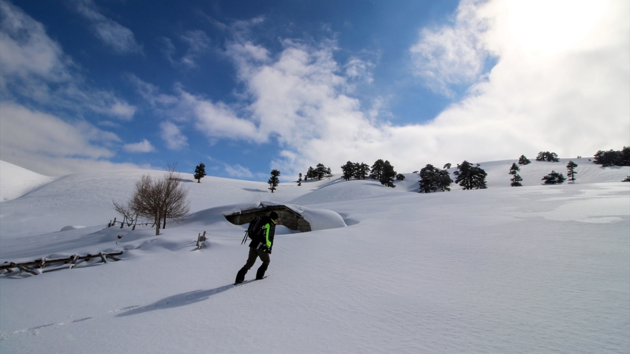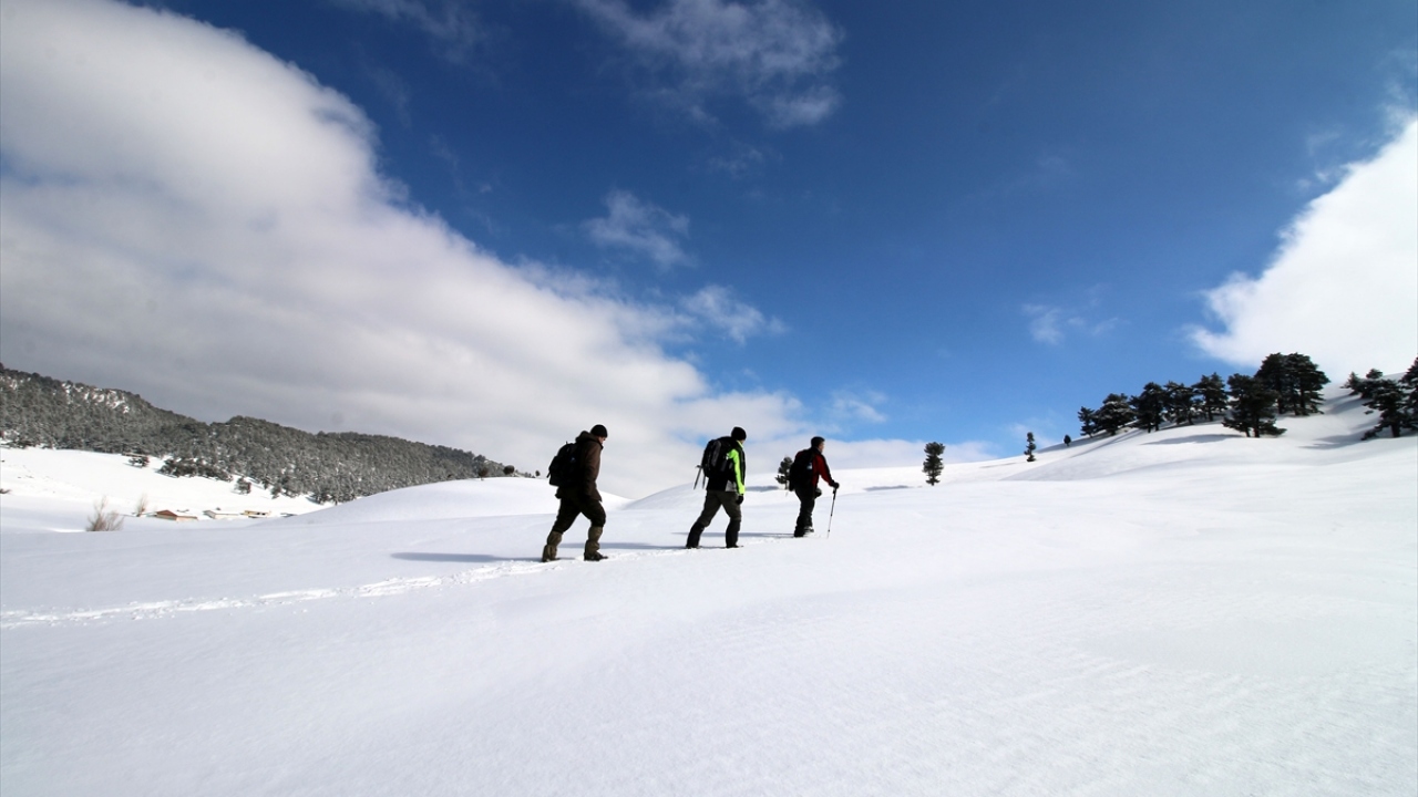 Doğa tutkunları, araçlarını Konya`yı Antalya`ya bağlayan kara yolunun kenarında bırakarak kar kalınlığı 2 metreyi bulan yaylaya ulaşmak için yaklaşık 3 saatlik zorlu tırmanış gerçekleştiriyor.