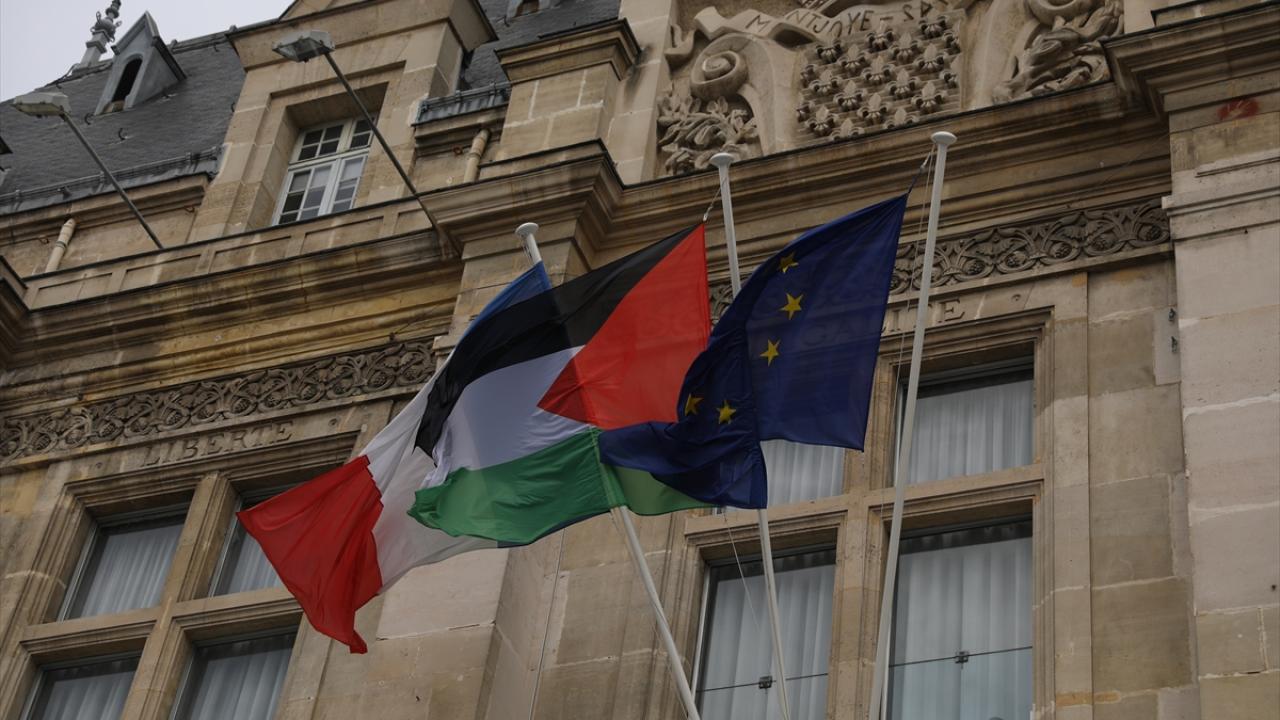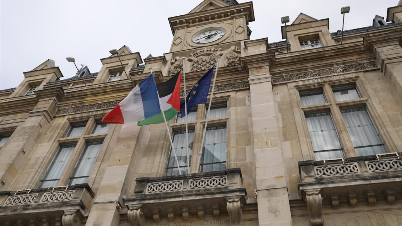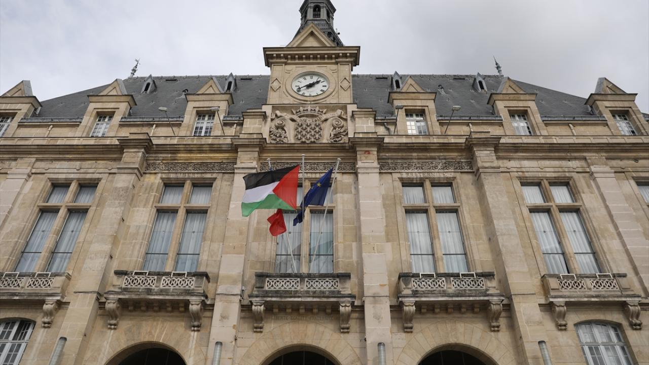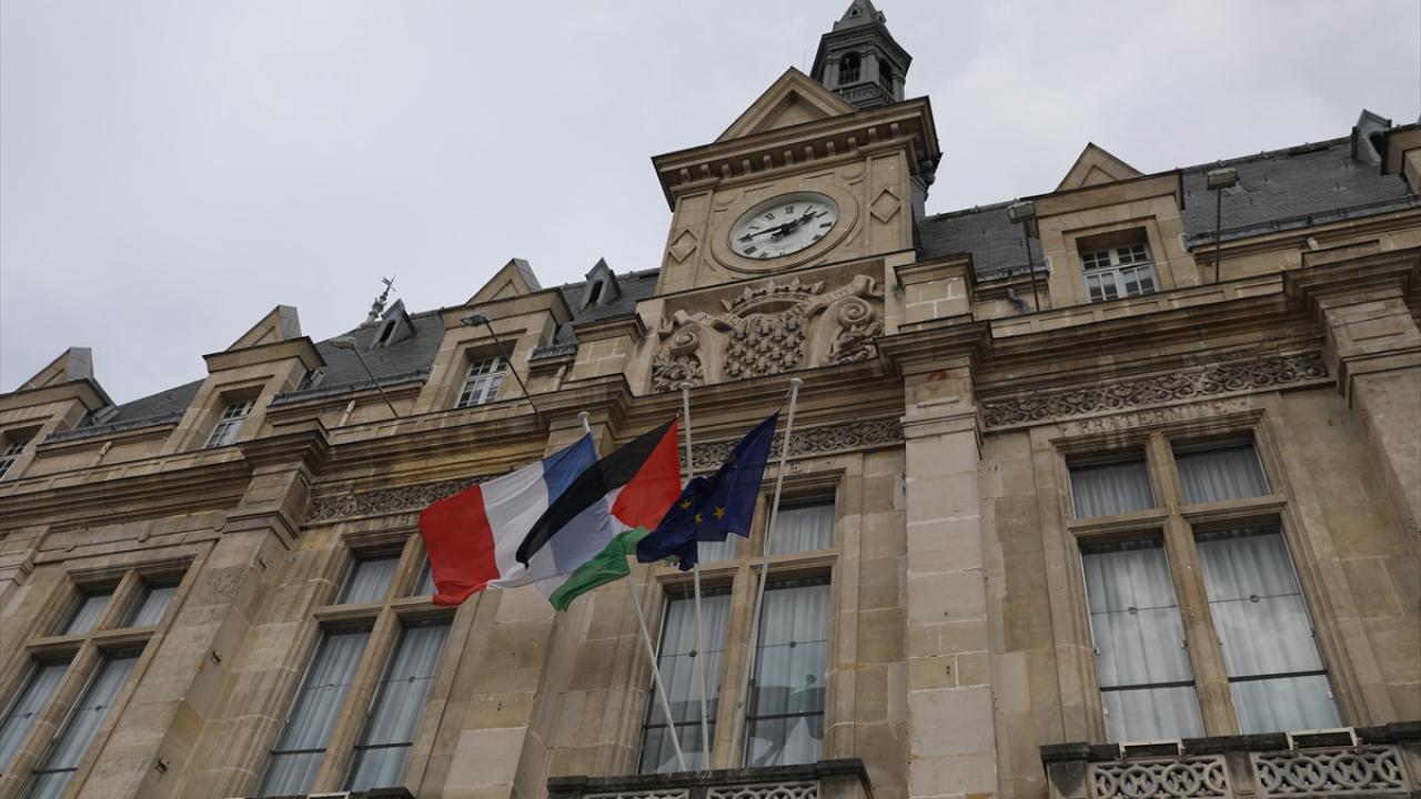 Fransa’nın başkenti Paris yakınlarındaki Saint-Denis Belediye Binası’nın önünde, Fransız ve Avrupa Birliği bayraklarının yanında Filistin bayrağı dalgalandı.