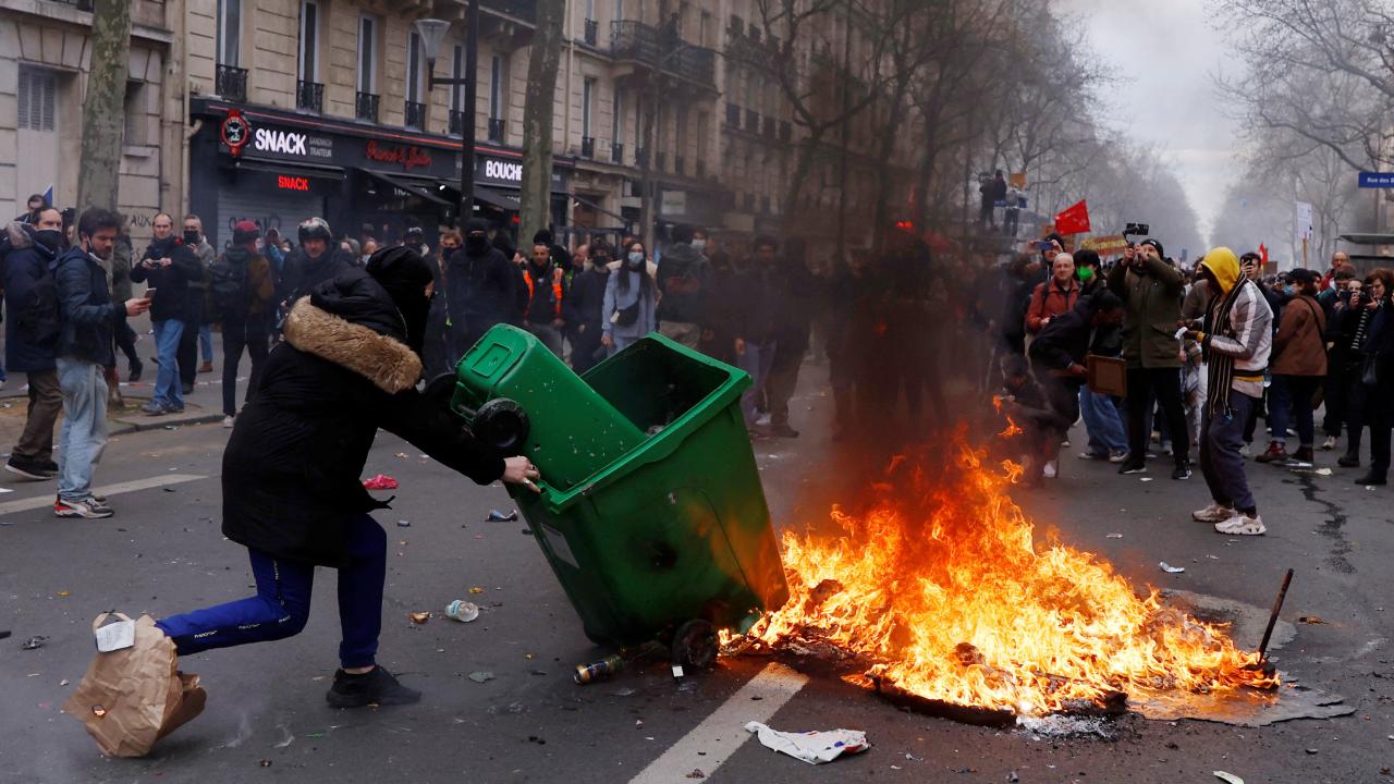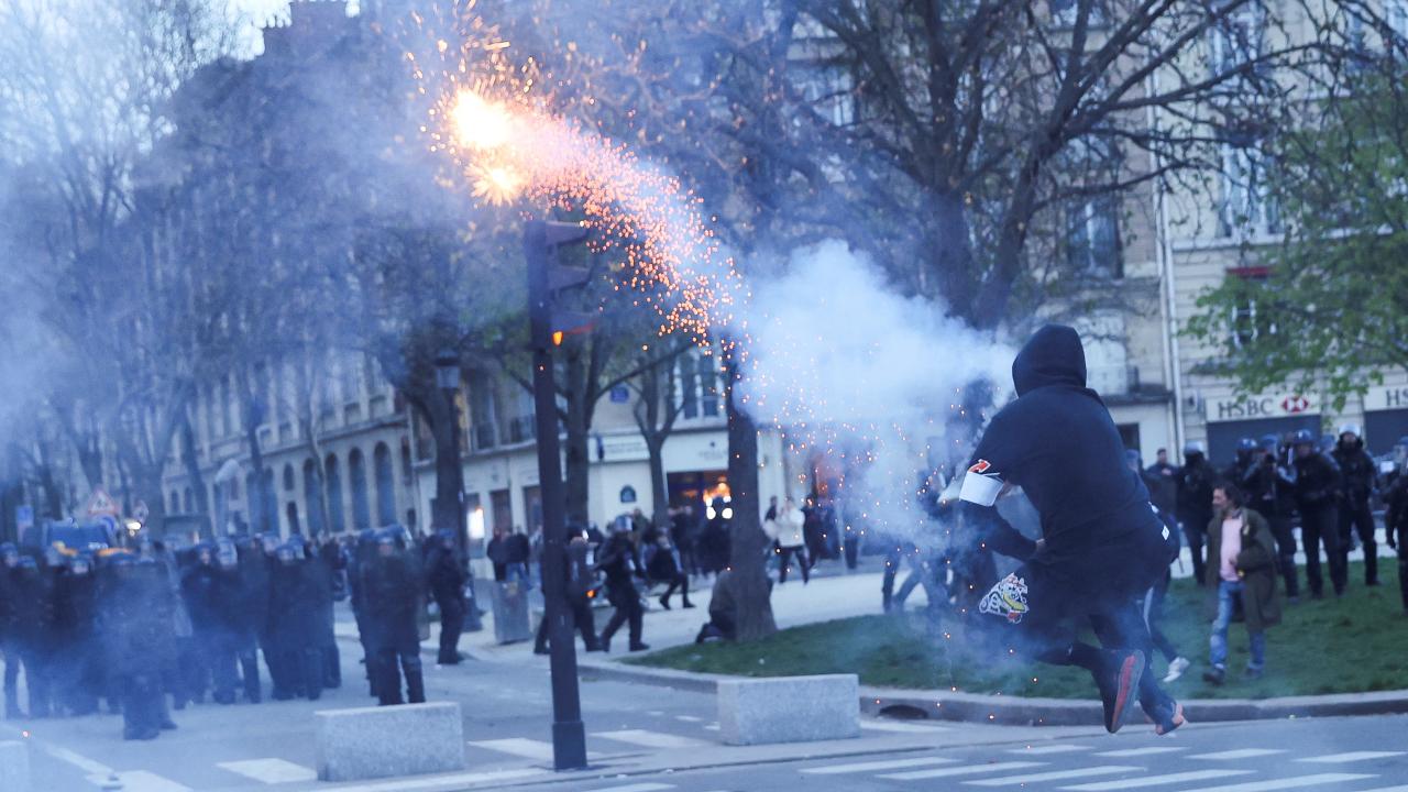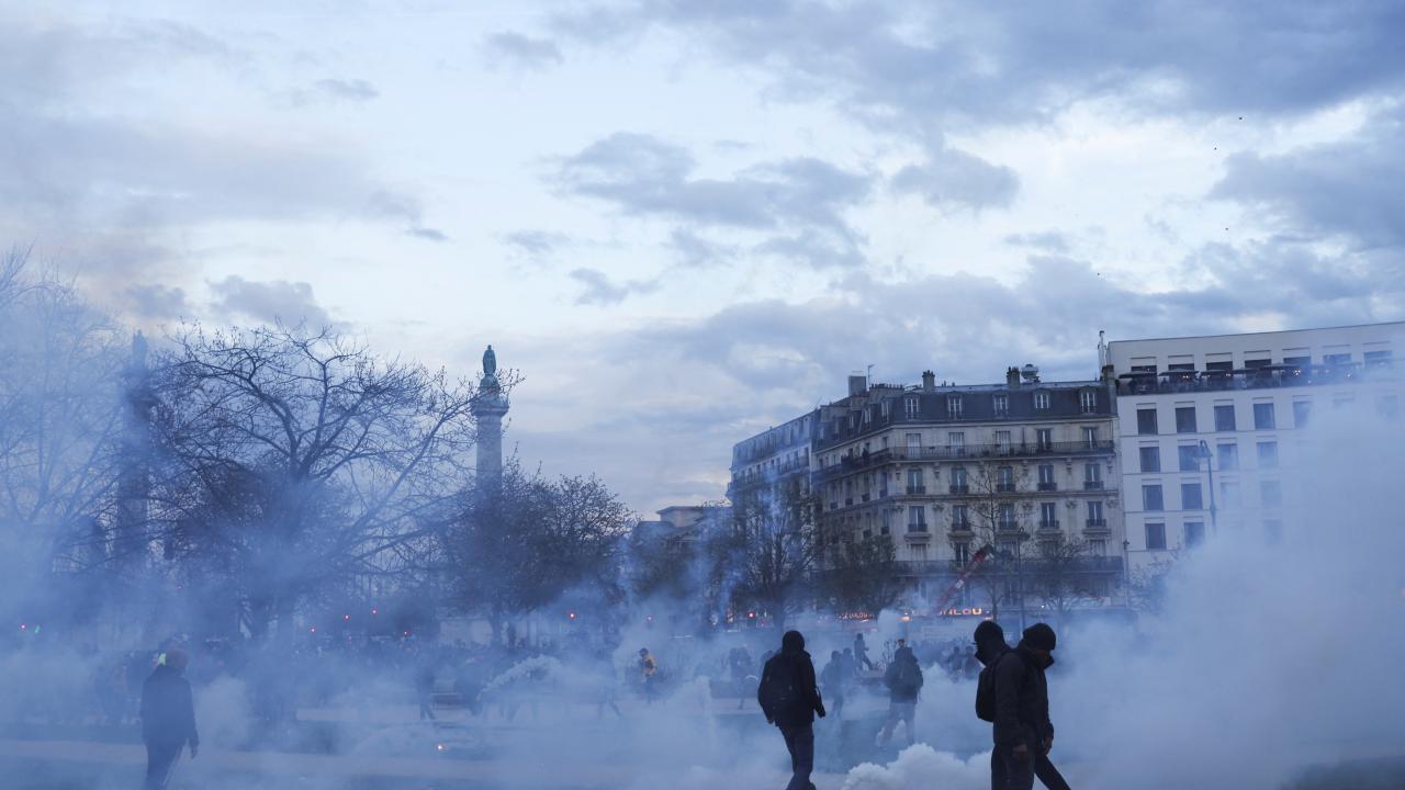 Başkent Paris`te Cumhuriyet Meydanı`ndan Nation Meydanı`na yürüyen göstericiler, bisiklet, scooter ve çöp bidonlarını ateşe verdi. Polis, göstericilere biber gazı ve copla müdahale etti.