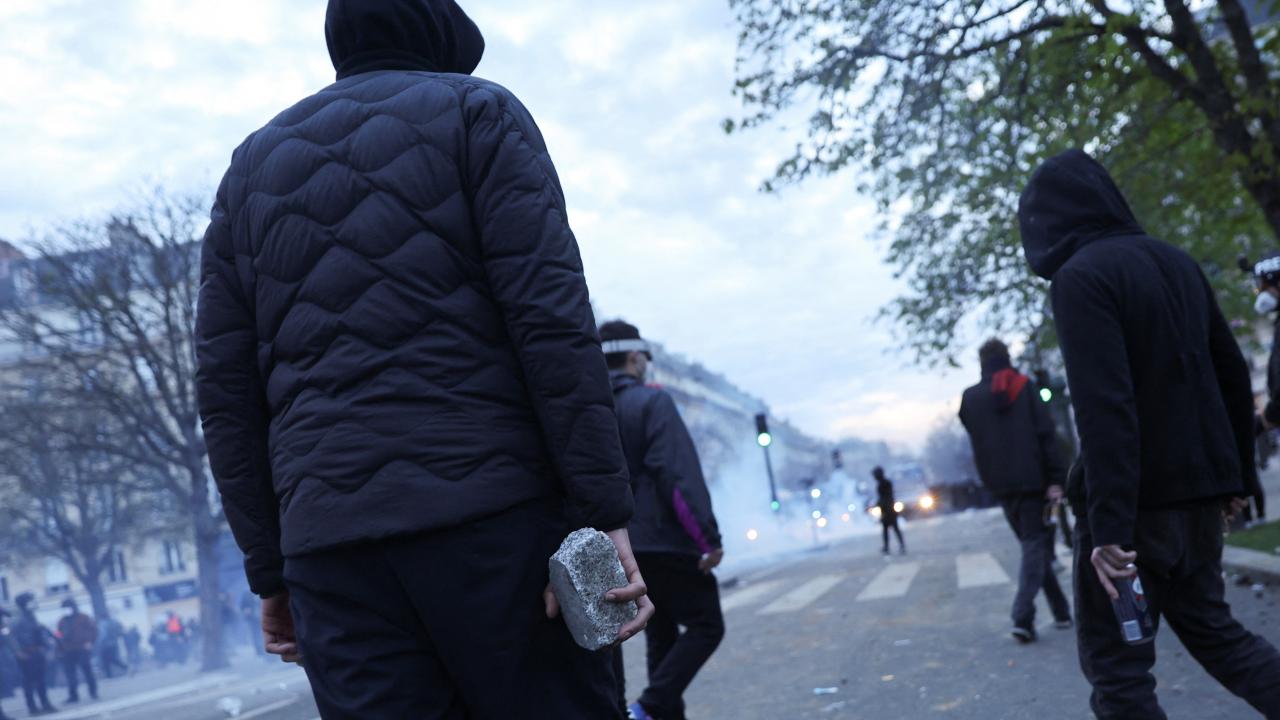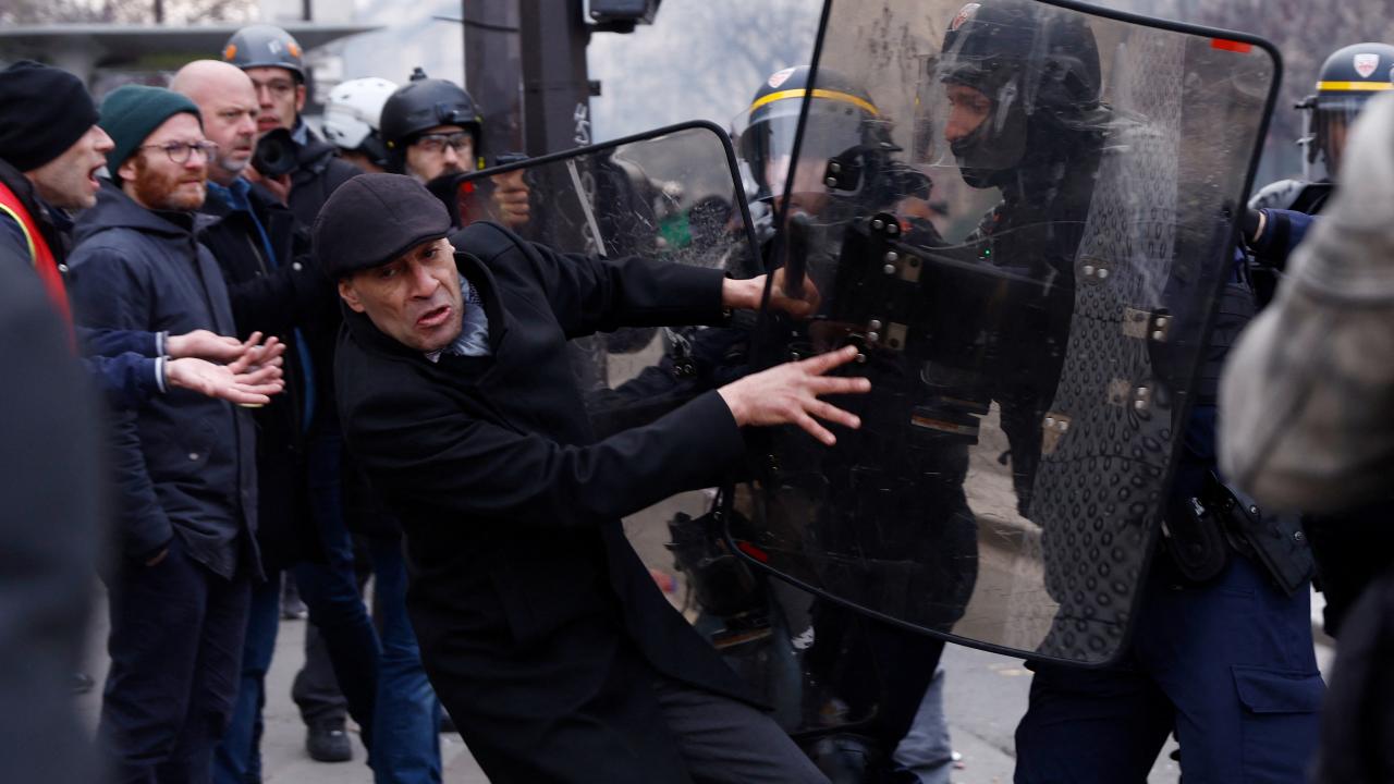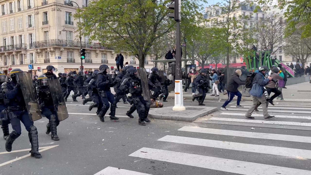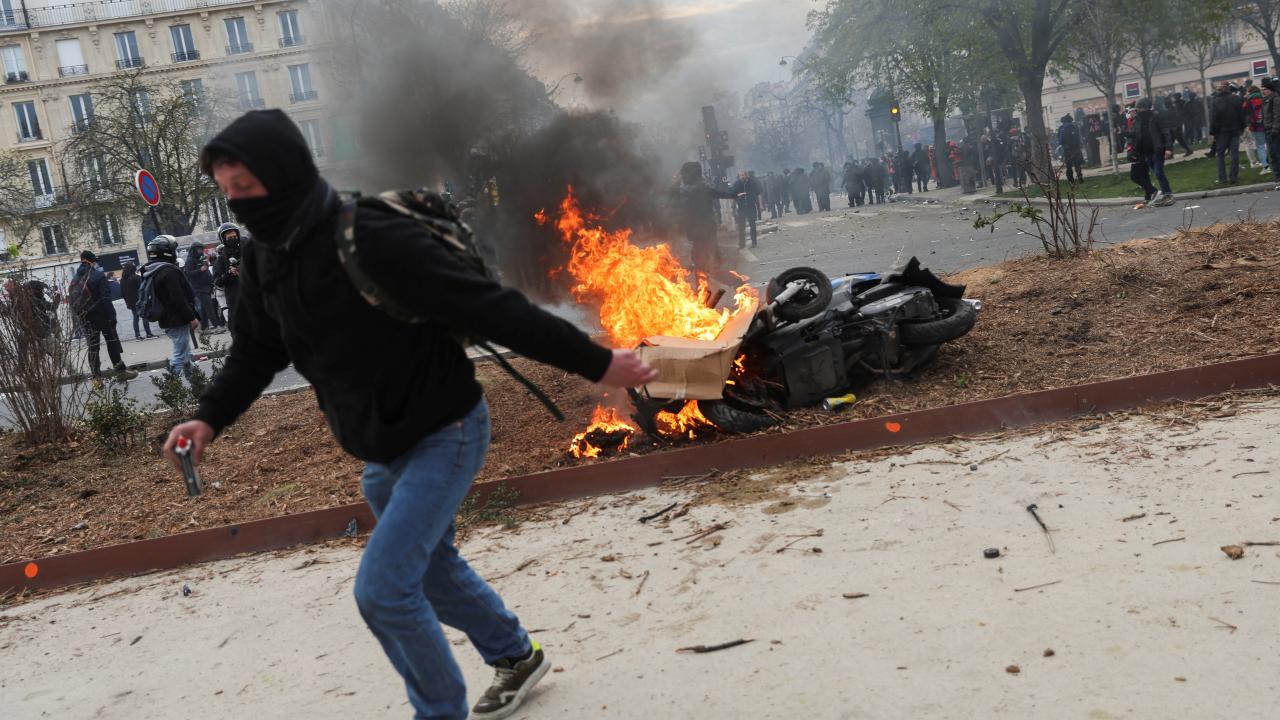 Başkent Paris`te Cumhuriyet Meydanı`ndan Nation Meydanı`na yürüyen göstericiler, bisiklet, scooter ve çöp bidonlarını ateşe verdi. Polis, göstericilere biber gazı ve copla müdahale etti.