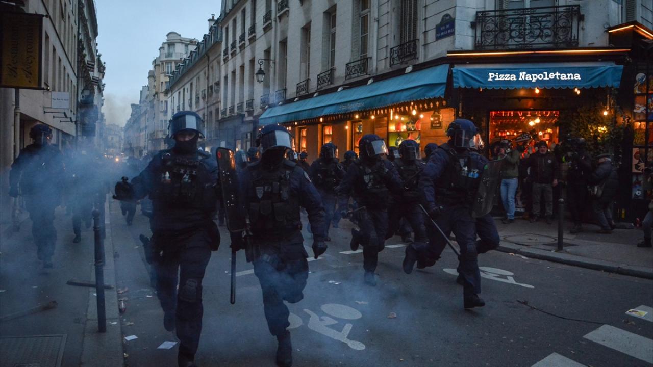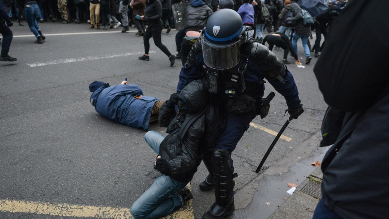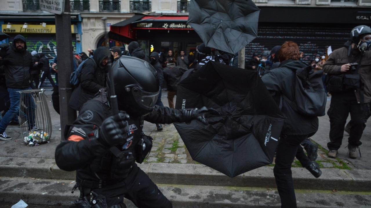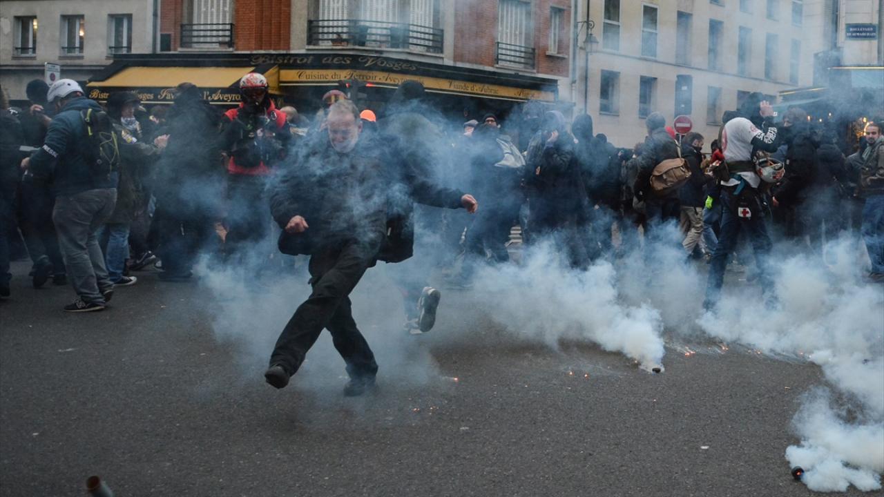 Göstericiler Cumhuriyet Meydanı’nda yürümeye başlarken Bastille Meydanı yakınlarında polis ve göstericiler arasında gerilim yükseldi ve arbede yaşandı.