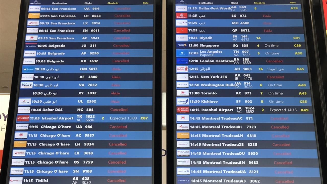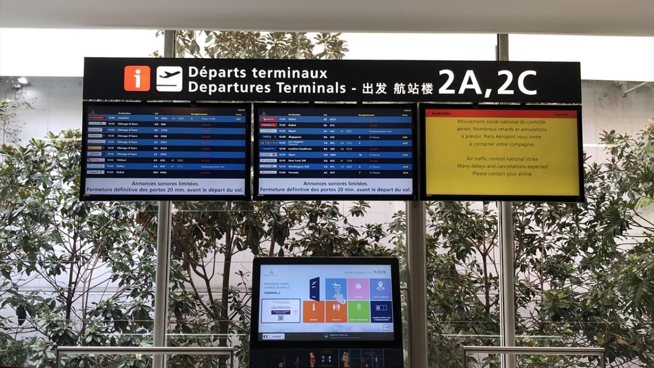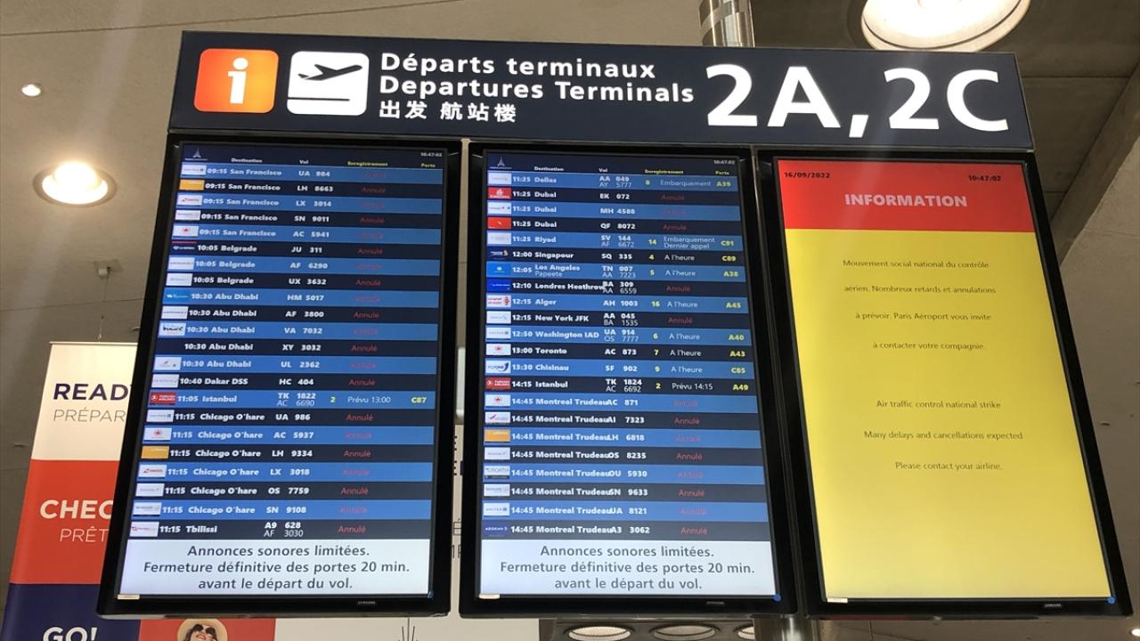 Paris Charles De Gaulle Havalimanı`nın diğer günlere göre daha az kalabalık olduğu gözlemlenirken havalimanındaki sefer panolarında hava trafik kontrolünde ulusal grev nedeniyle birçok gecikme ve sefer iptali beklendiğine işaret edildi.