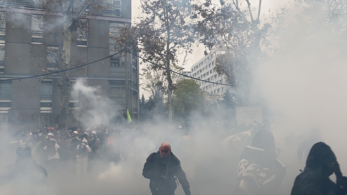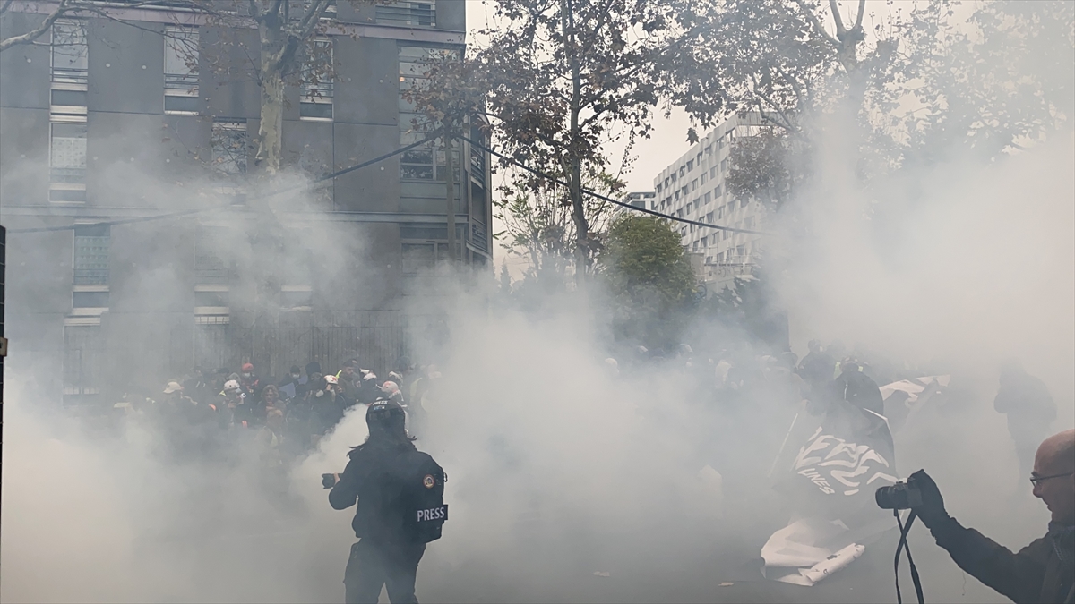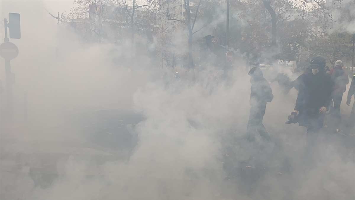 Polisin, bazı eylemcileri copla darbettiği de görüldü. Göstericiler, birçok çöp bidonunu ve çeşitli maddeleri ateşe verdi.