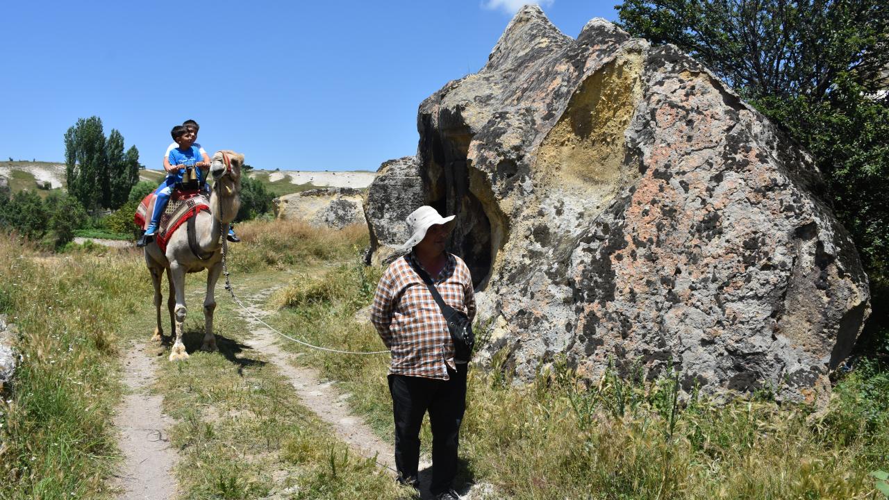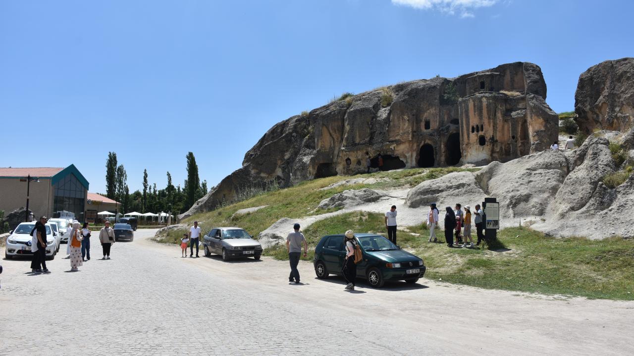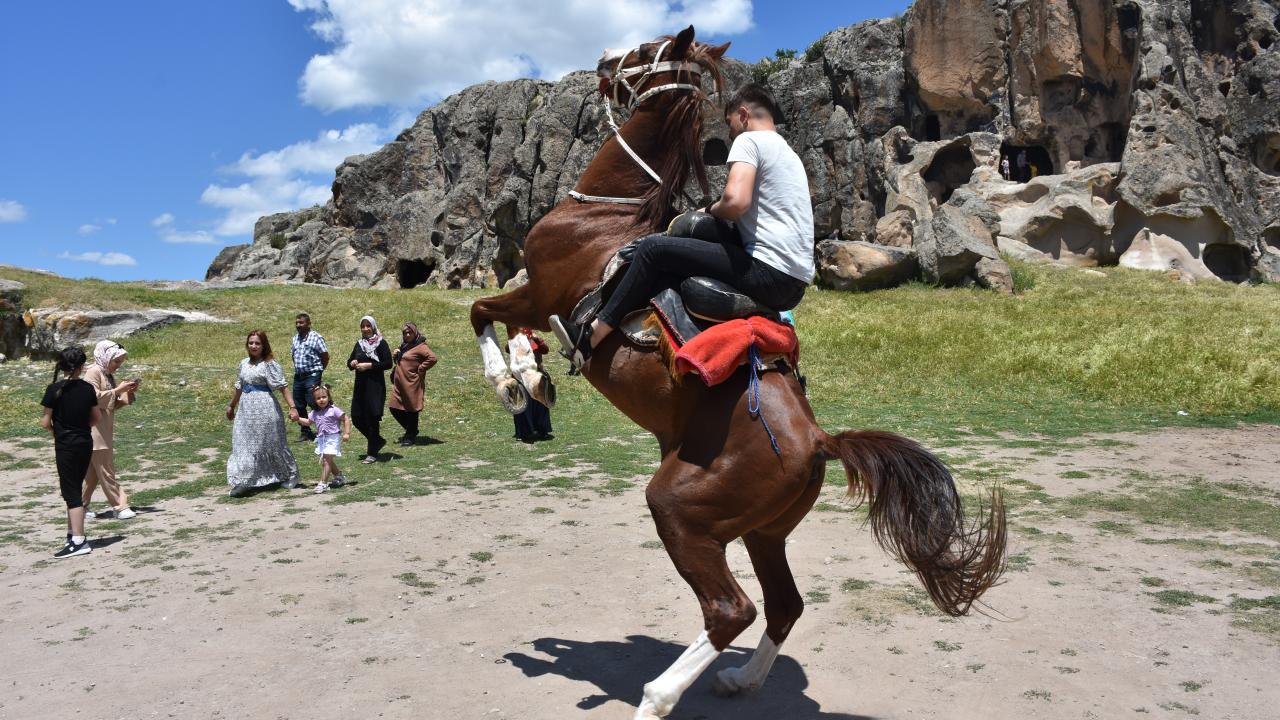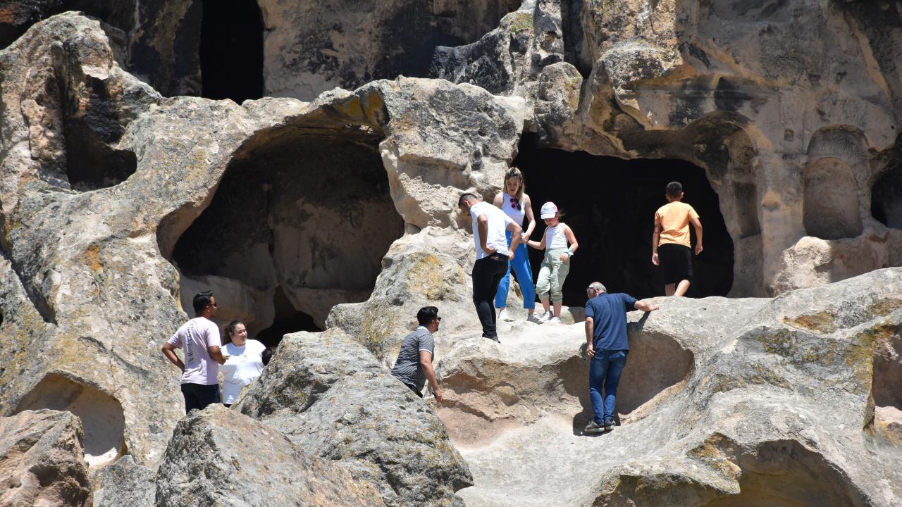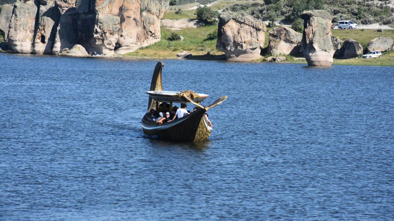Yerli turistler, Döğer beldesi ile Ayazini köyleri arasındaki Emre Gölü`nde tekne turu yaparken 25 kilometrelik Frig Yolu`ndaki tarihi mekanlar, anıt abideler, oyma kaya mezarları ve peri bacalarını gezerek bayramın keyfini sürüyor.
