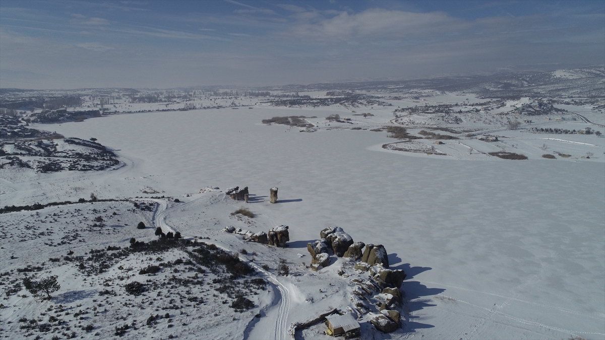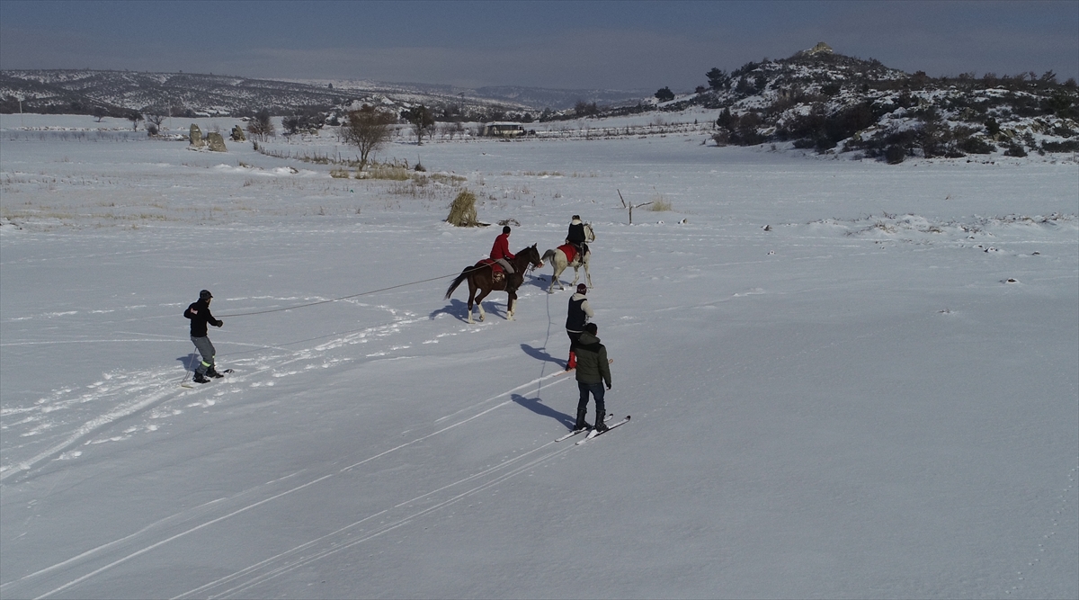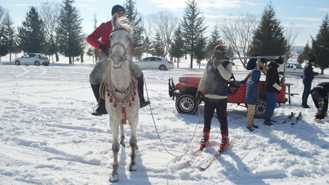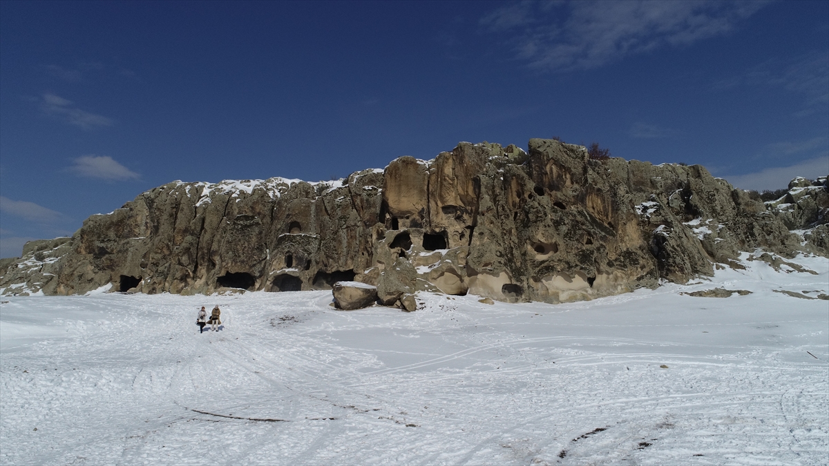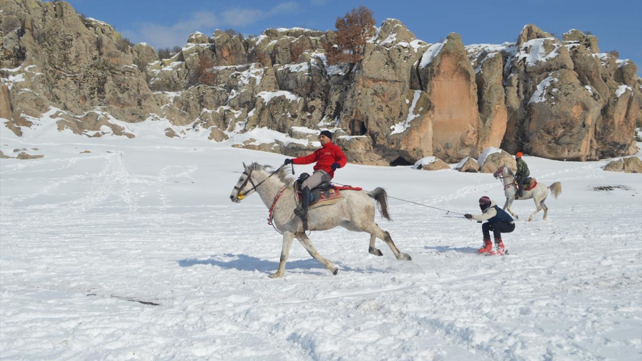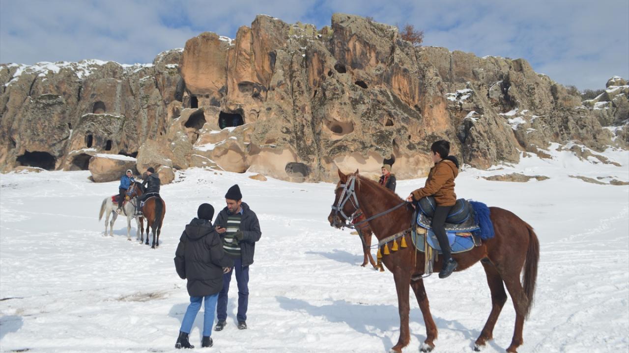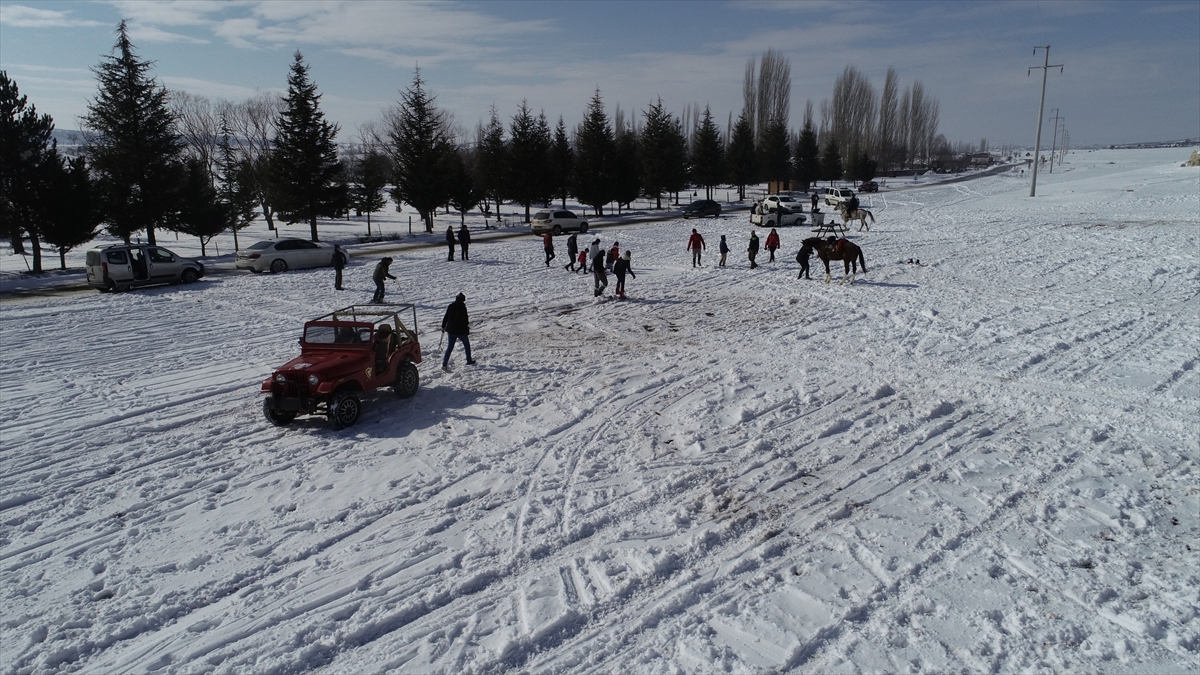 Afyonkarahisar'ın İhsaniye ilçesindeki tarihi Frig Vadisi'ne karlı havalarda gelen ziyaretçiler, hem 3 bin yıllık kaya yerleşimlerini geziyor hem de bölgedeki eşsiz manzarada ve yüzeyi buz tutan Emre Gölü'nde atlı kayak heyecanı yaşıyor.